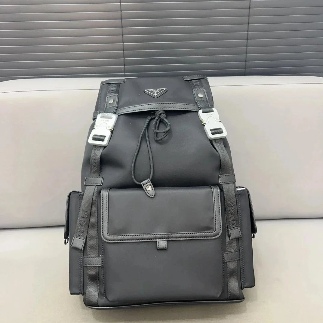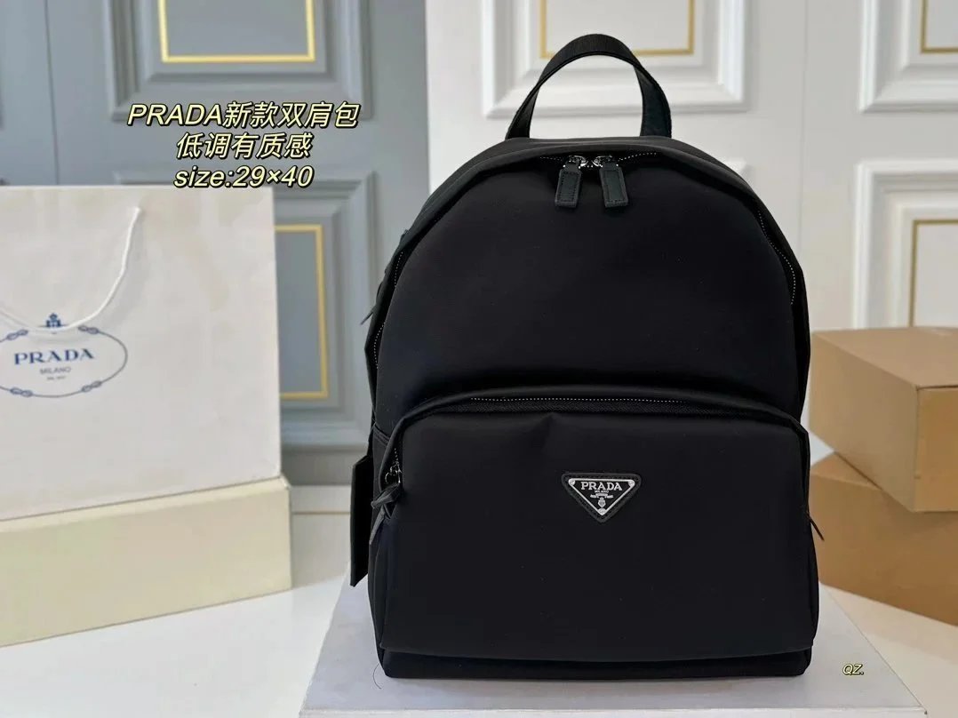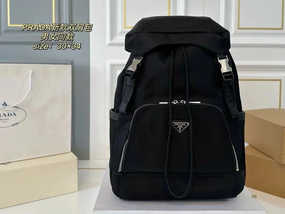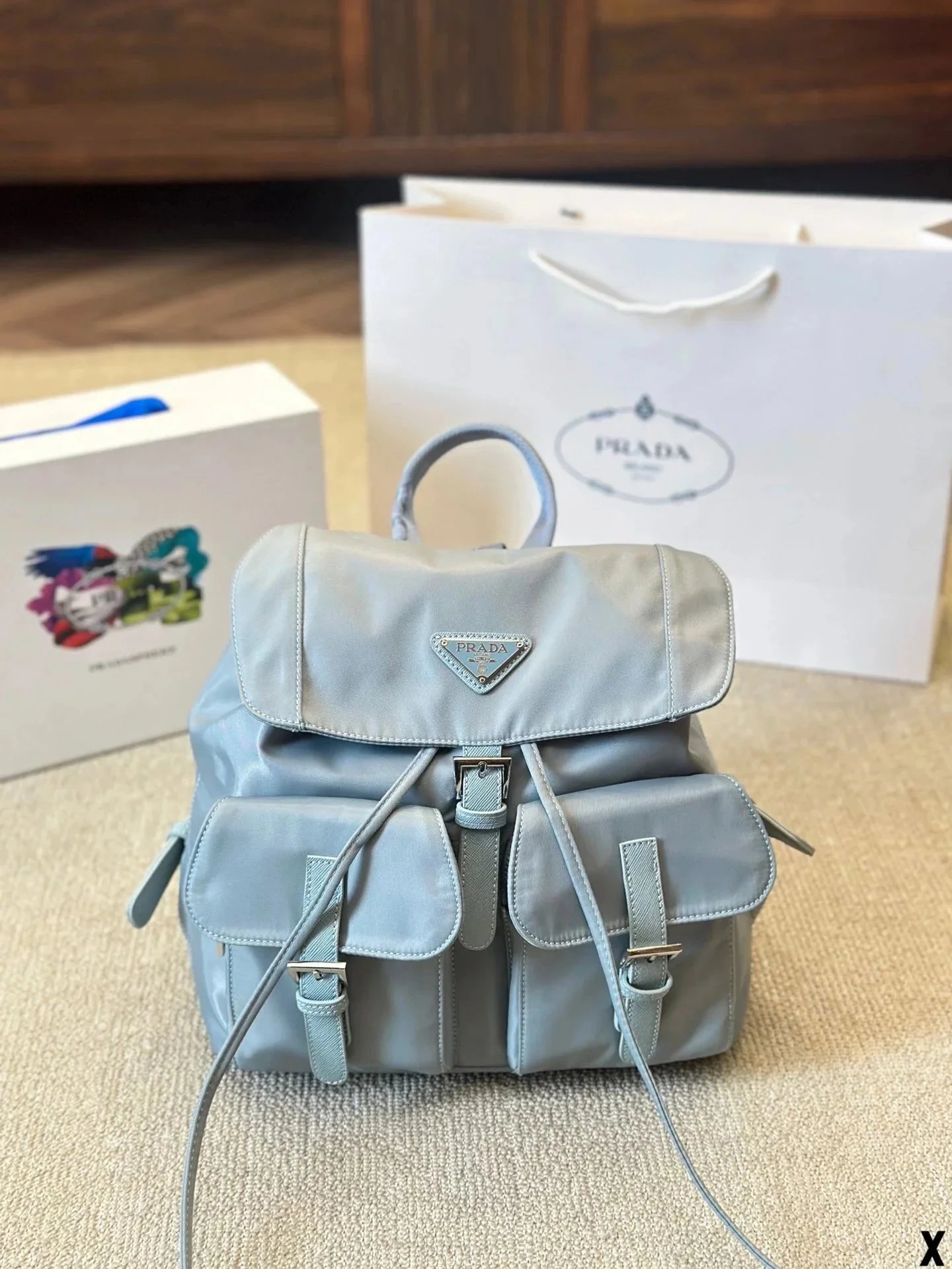 Stylish Prada nylon backpack in beige with classic vintage design, featuring dual front pockets and drawstring closure. Perfect for everyday use with timeless elegance.