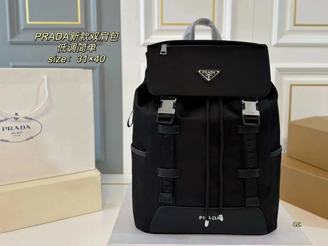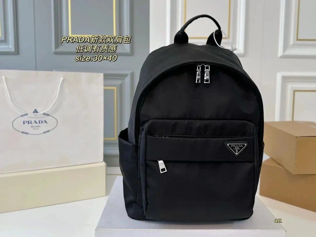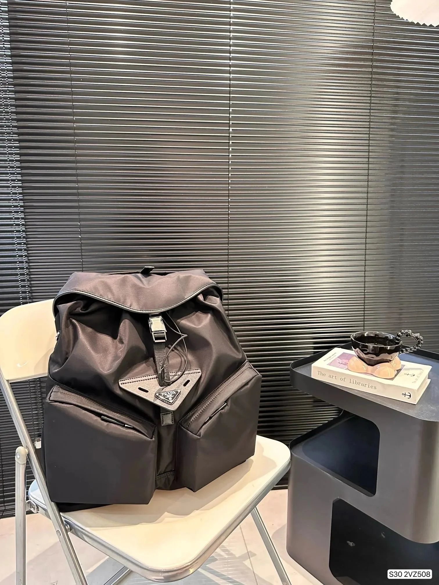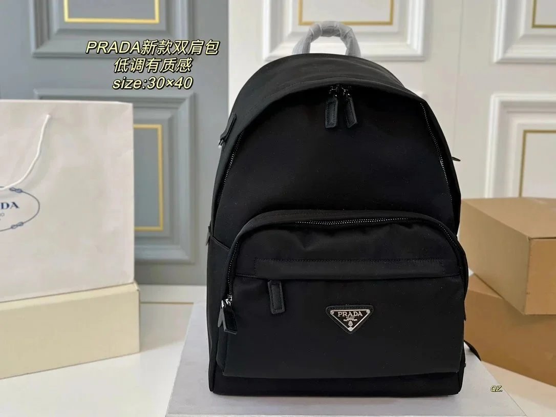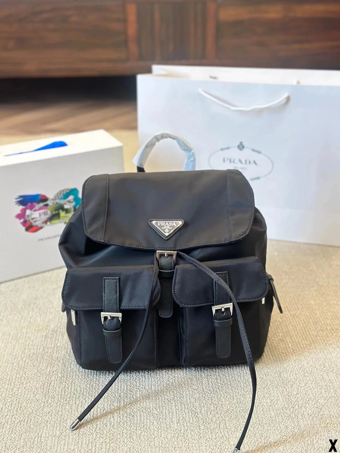 Stylish Prada nylon backpack in beige with classic vintage design, featuring dual front pockets and drawstring closure. Perfect for everyday use with timeless elegance.