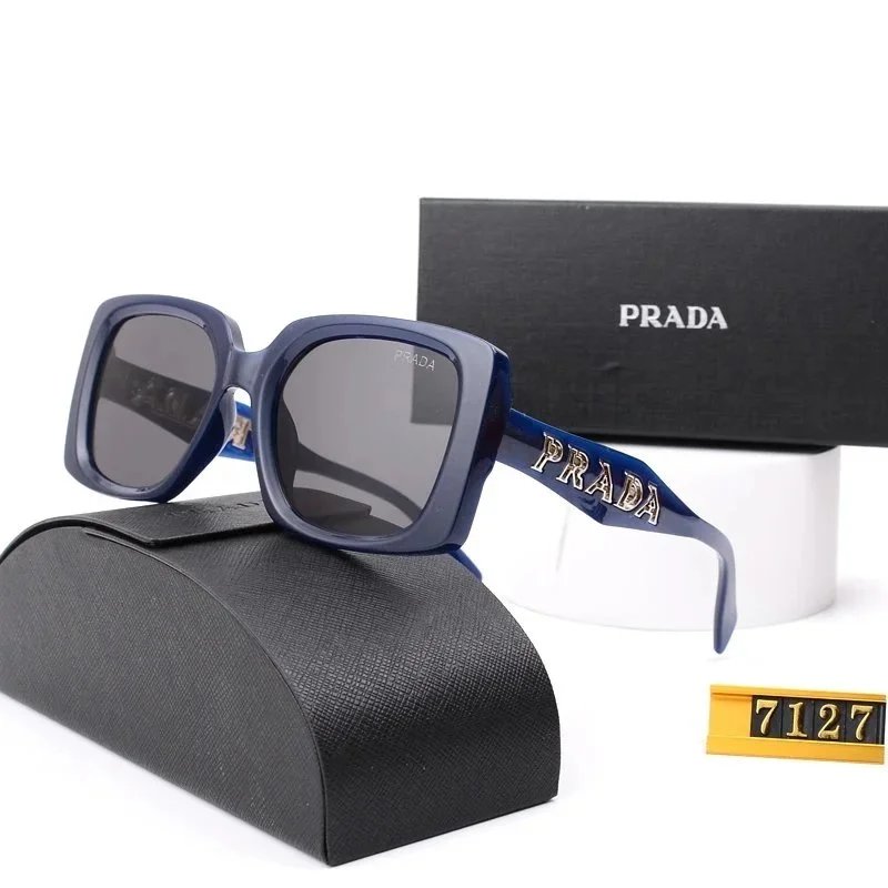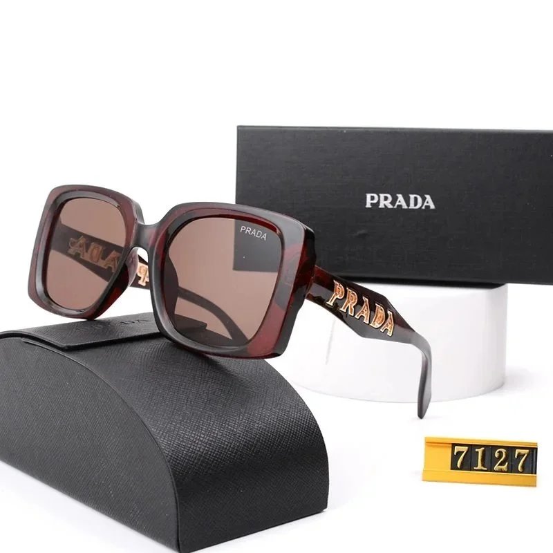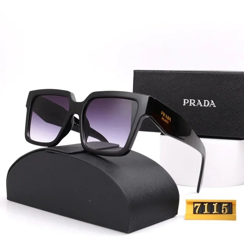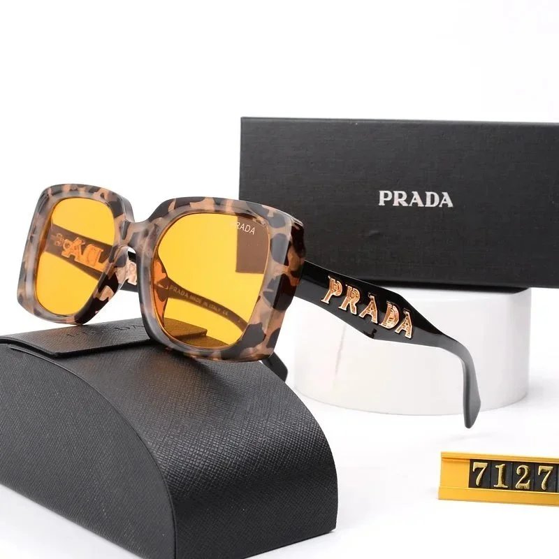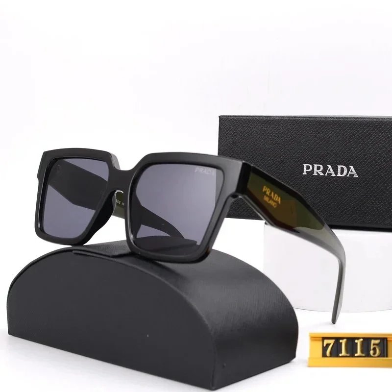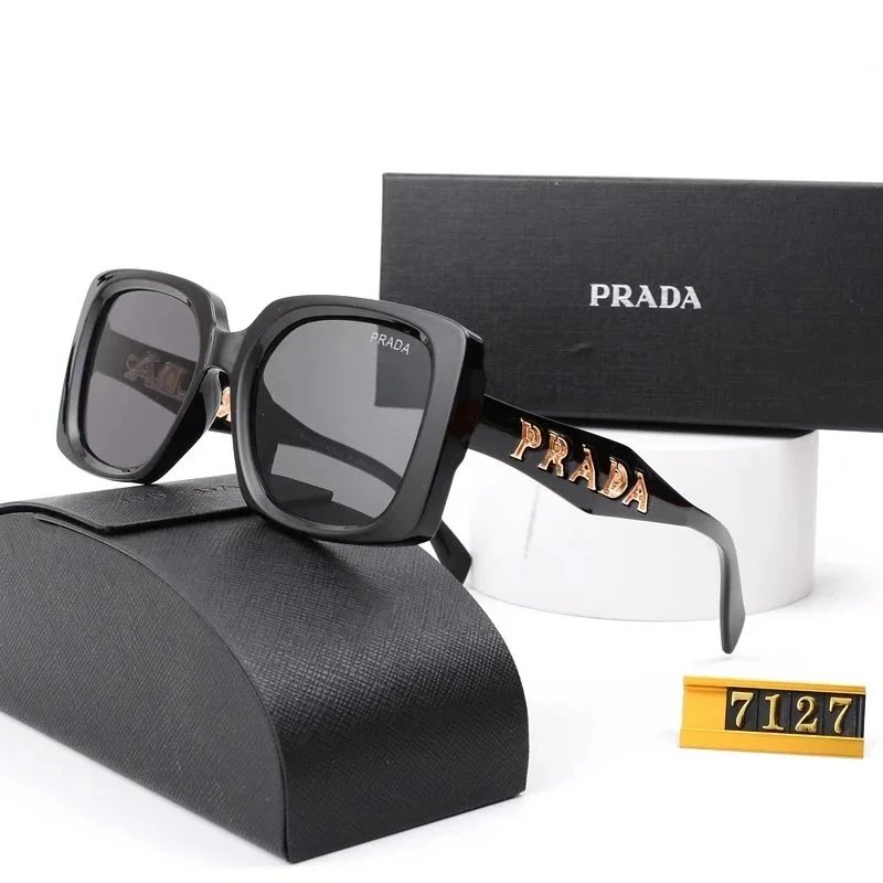Elegant Prada square-frame sunglasses featuring black acetate frames and distinctive gold-tone logo detailing on the temples. Includes branded case and box for authentic presentation.