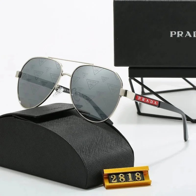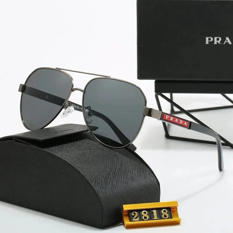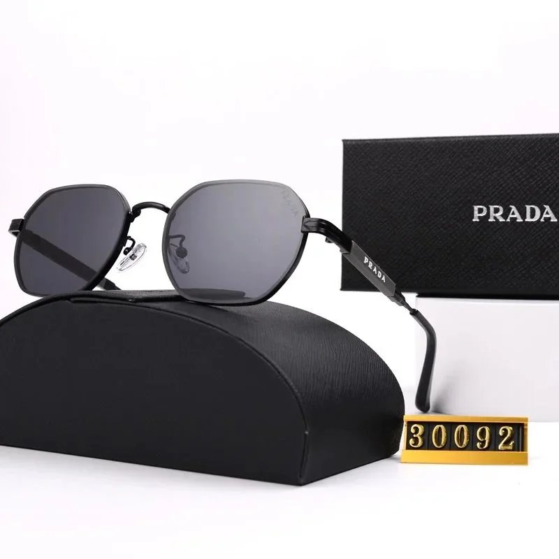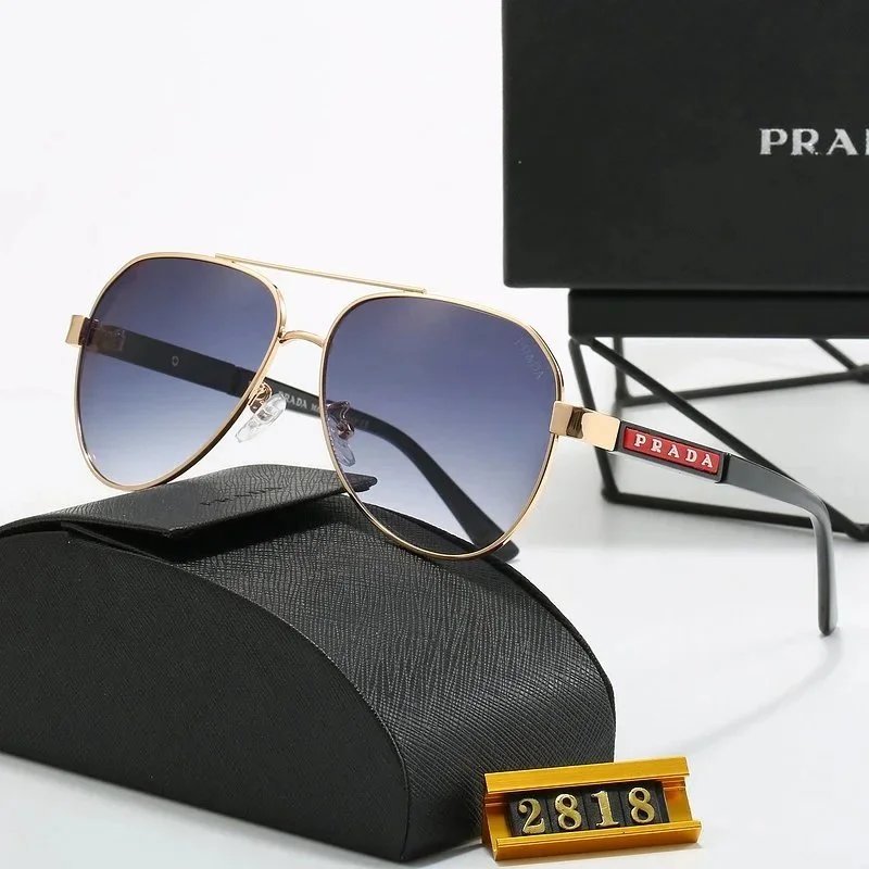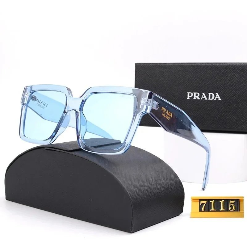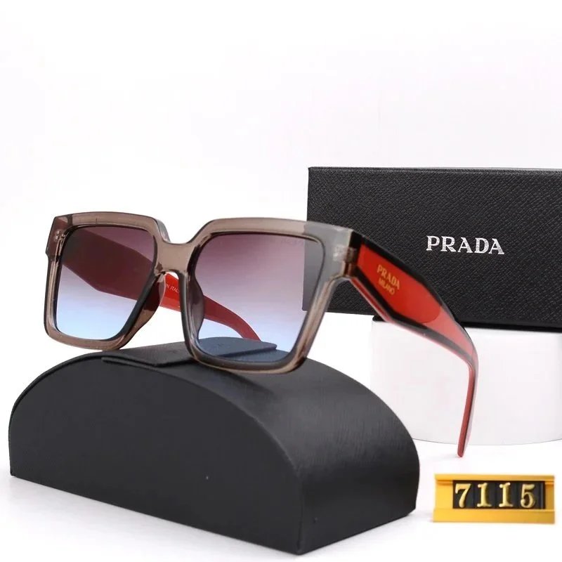 Elegant Prada square-frame sunglasses featuring black acetate frames and distinctive gold-tone logo detailing on the temples. Includes branded case and box for authentic presentation.
