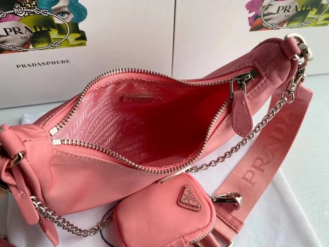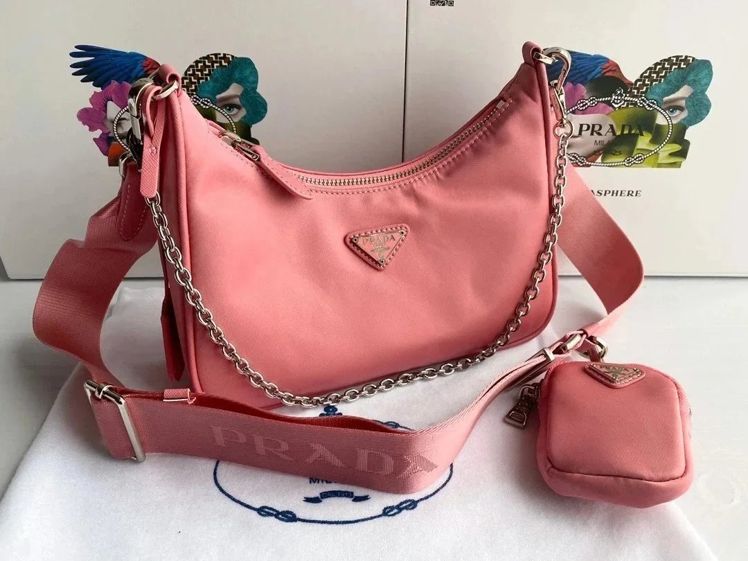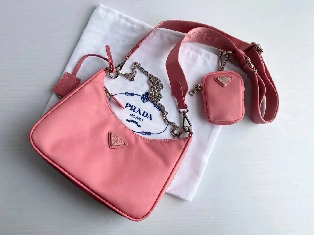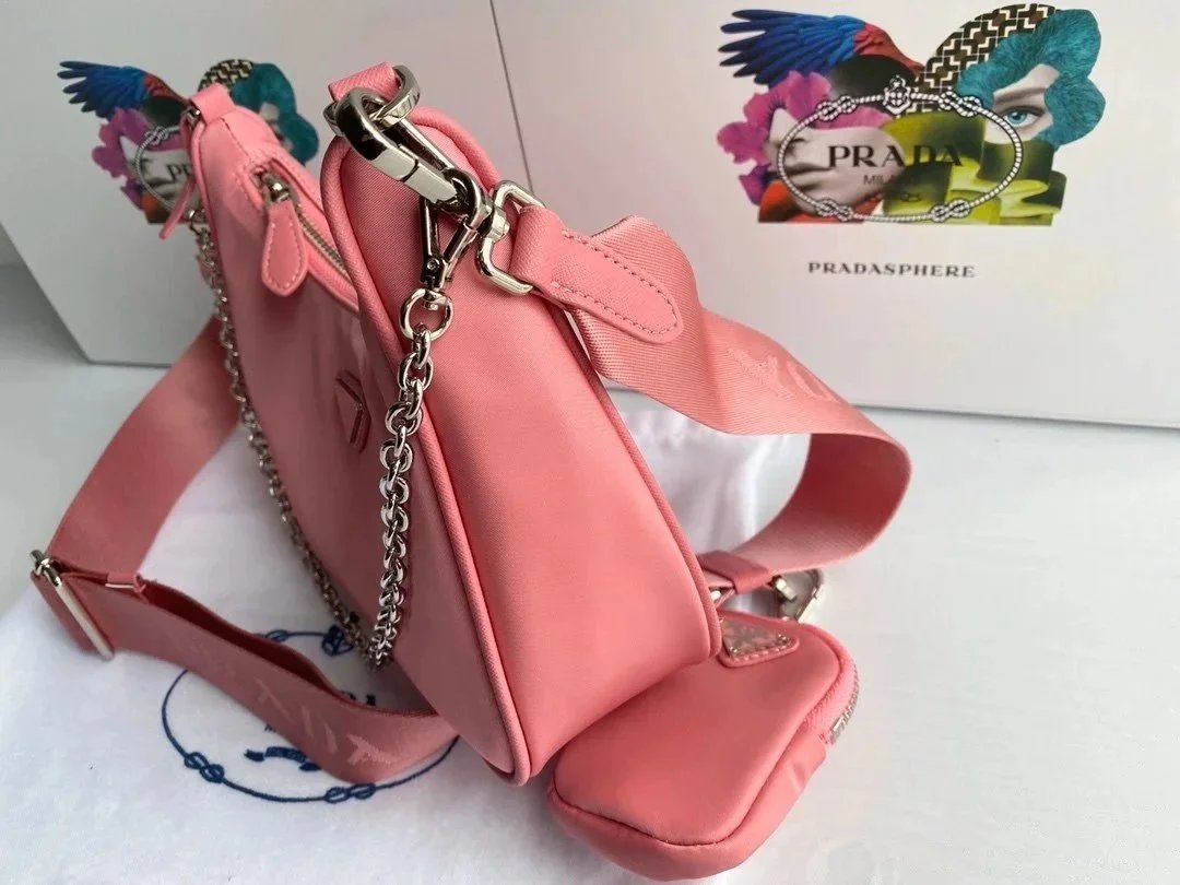 Discover the iconic Prada triangular crossbody bag in a vibrant range of colors including beige, pink, yellow, blue, green, and black. Featuring a sleek design with a signature chain strap and matching pouch.