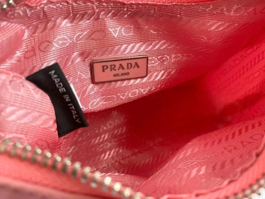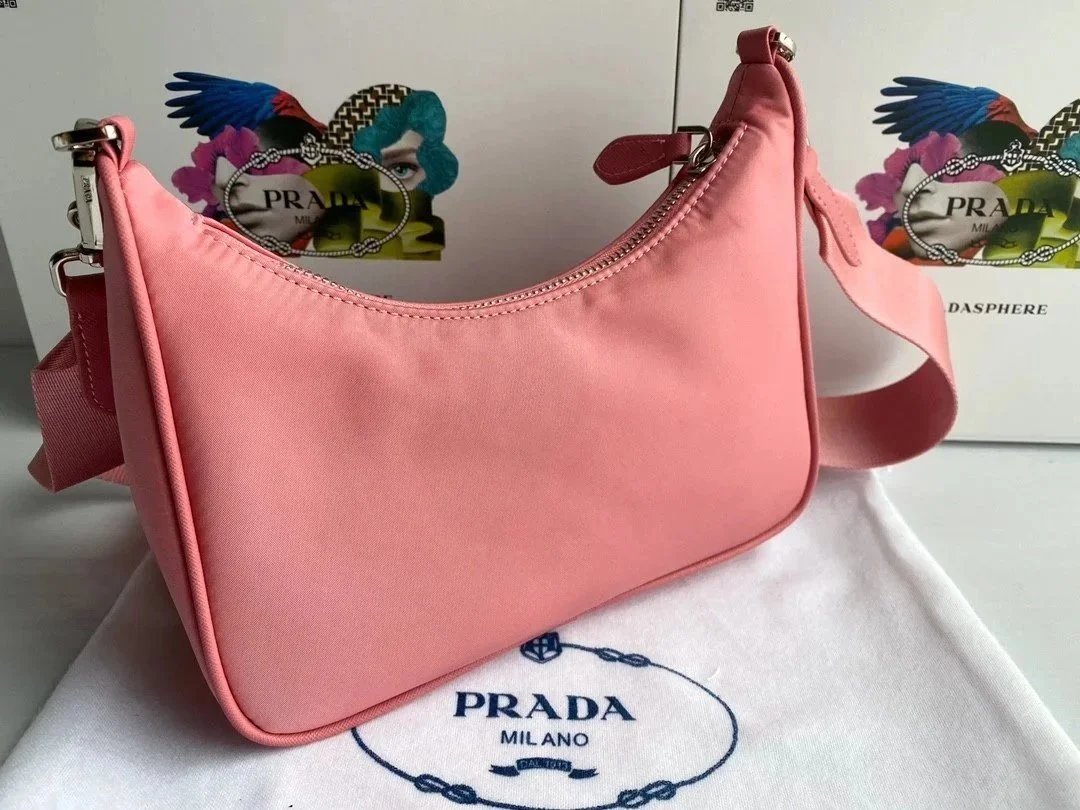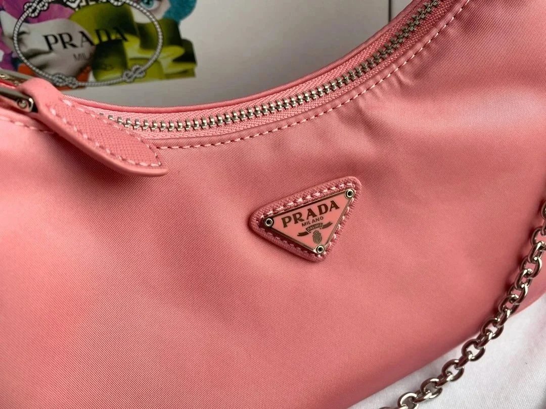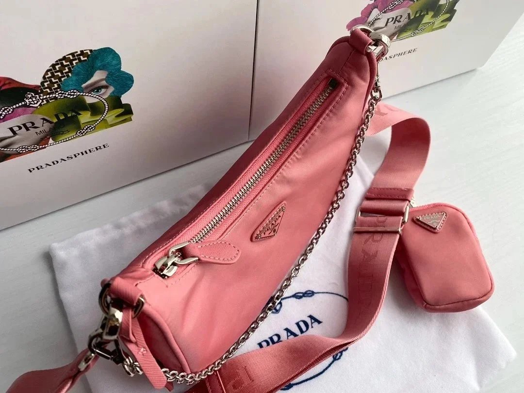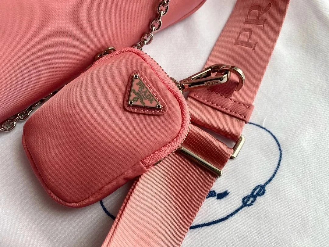 Discover the iconic Prada triangular crossbody bag in a vibrant range of colors including beige, pink, yellow, blue, green, and black. Featuring a sleek design with a signature chain strap and matching pouch.
