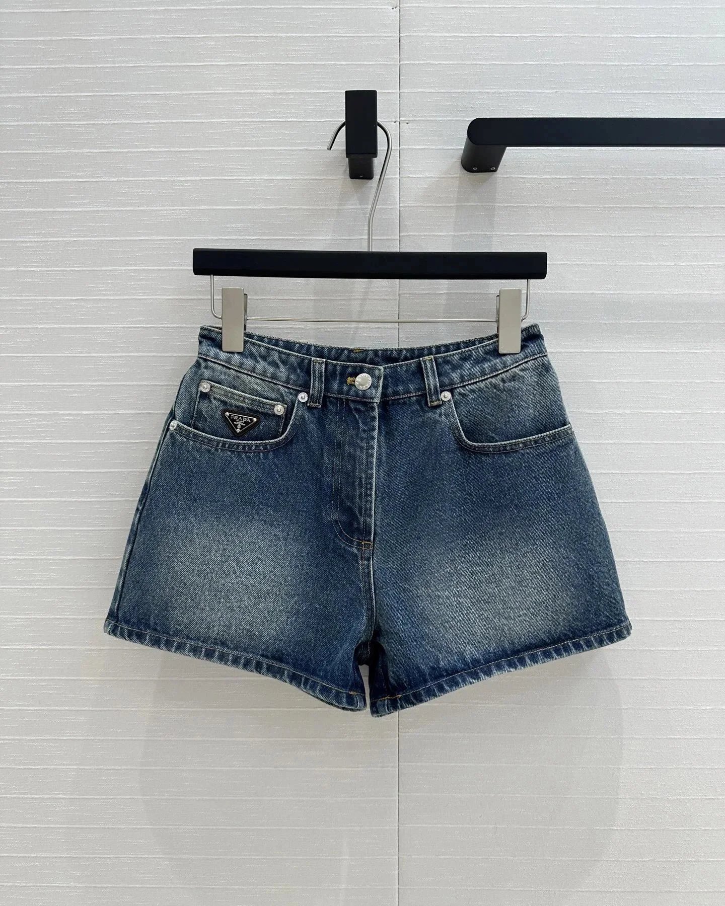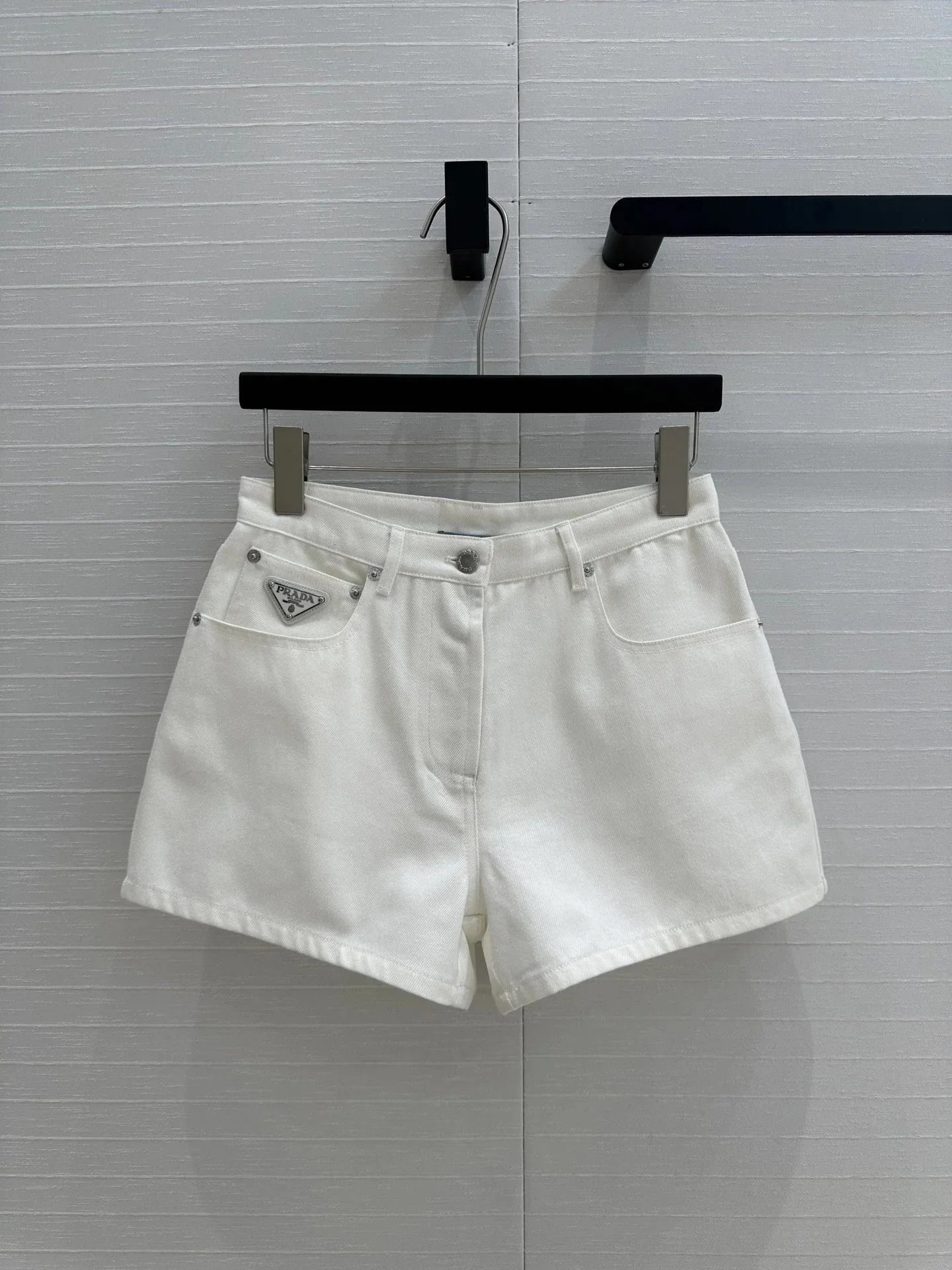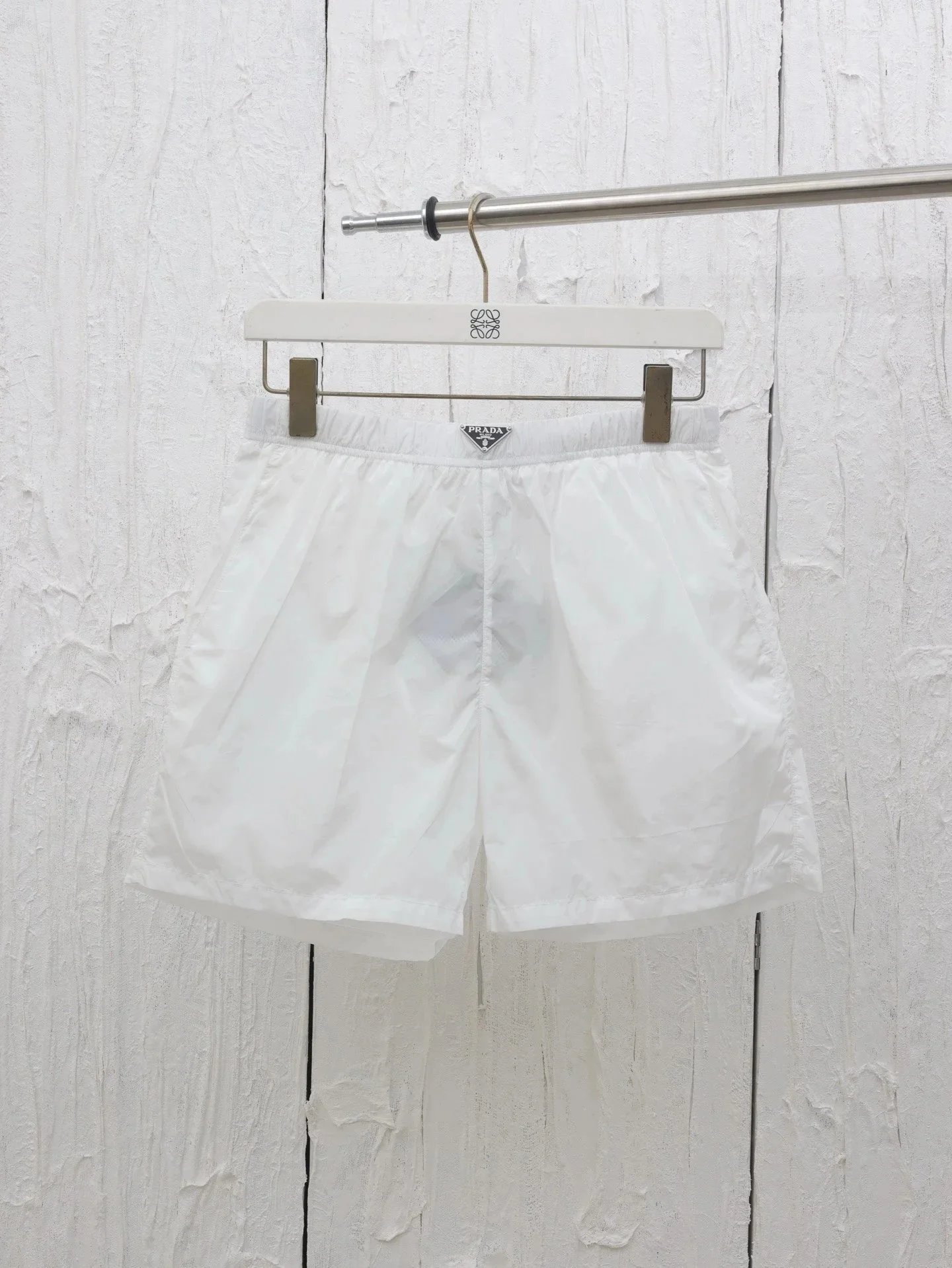 Stylish white Prada shorts featuring bold vertical branding and sleek black side stripes. Perfect for casual wear with a luxury touch.