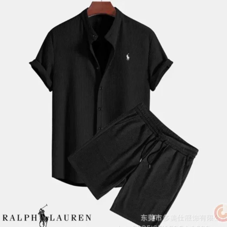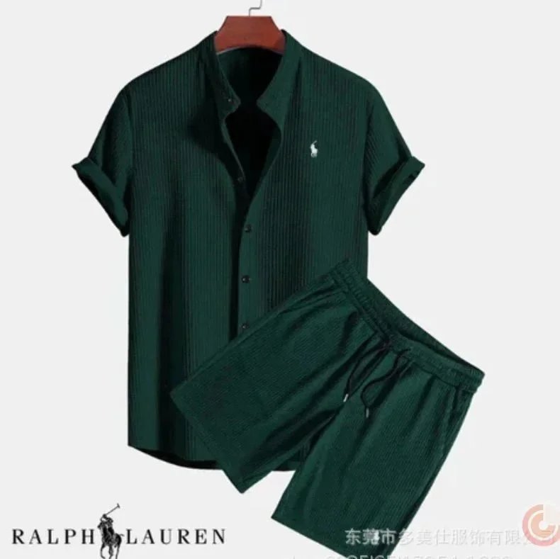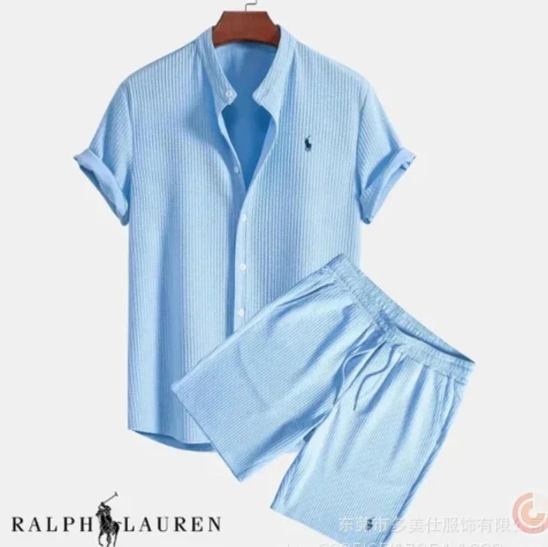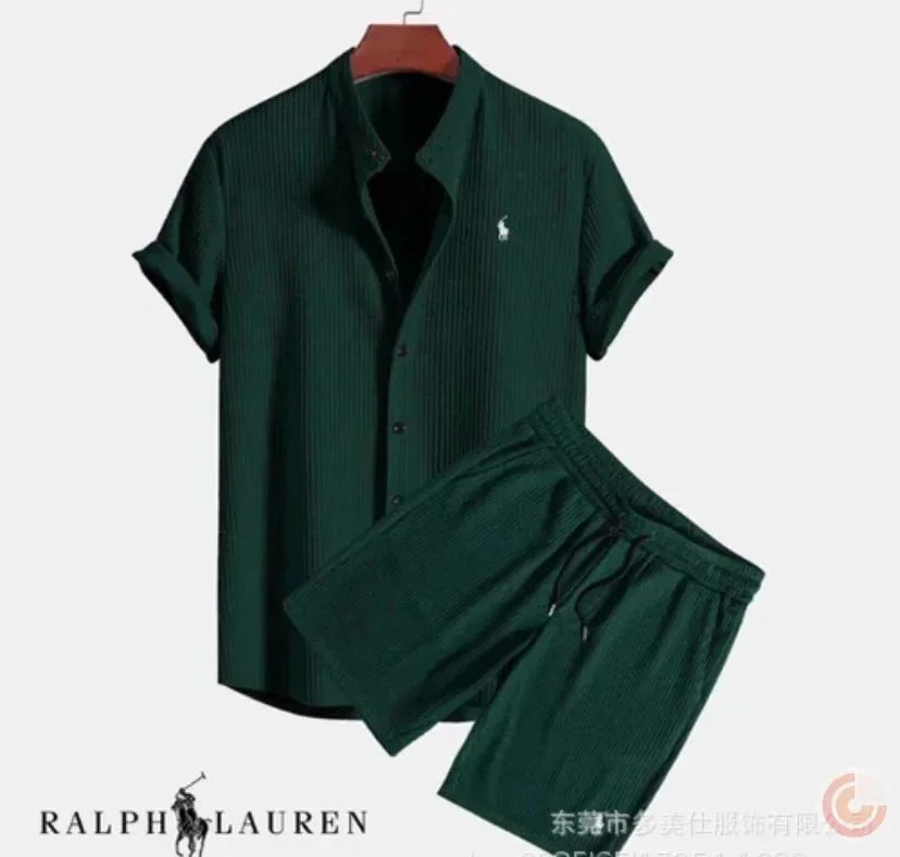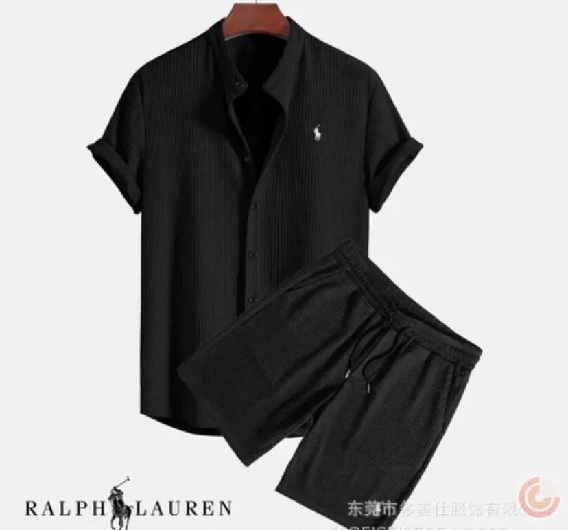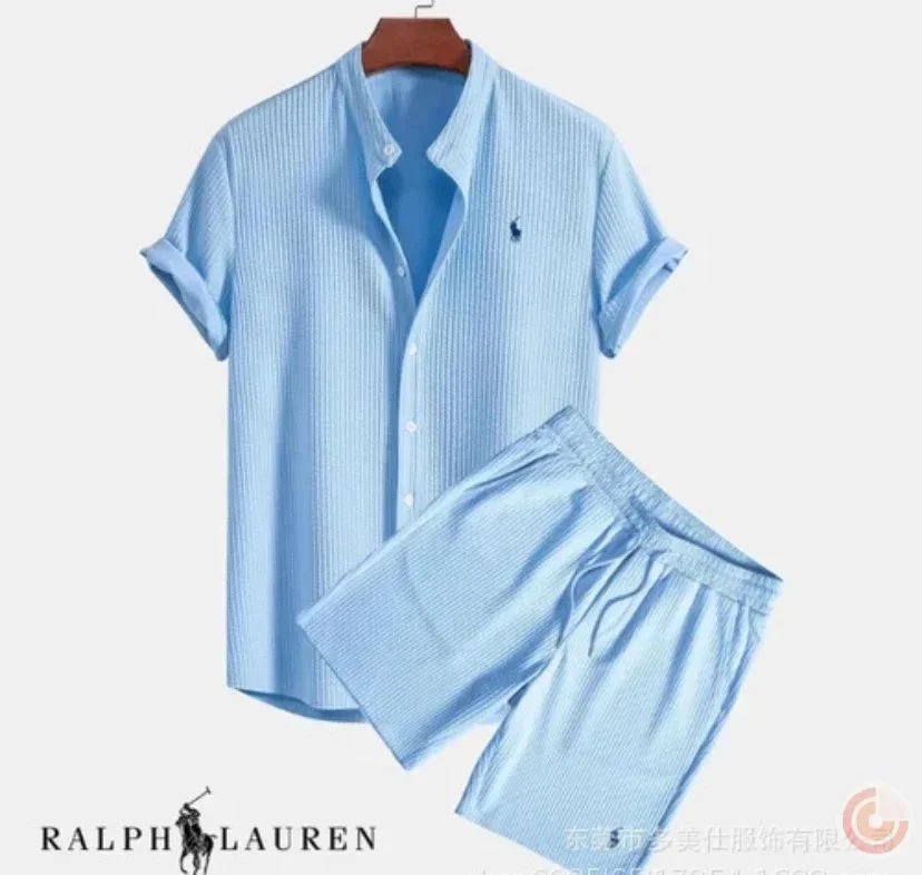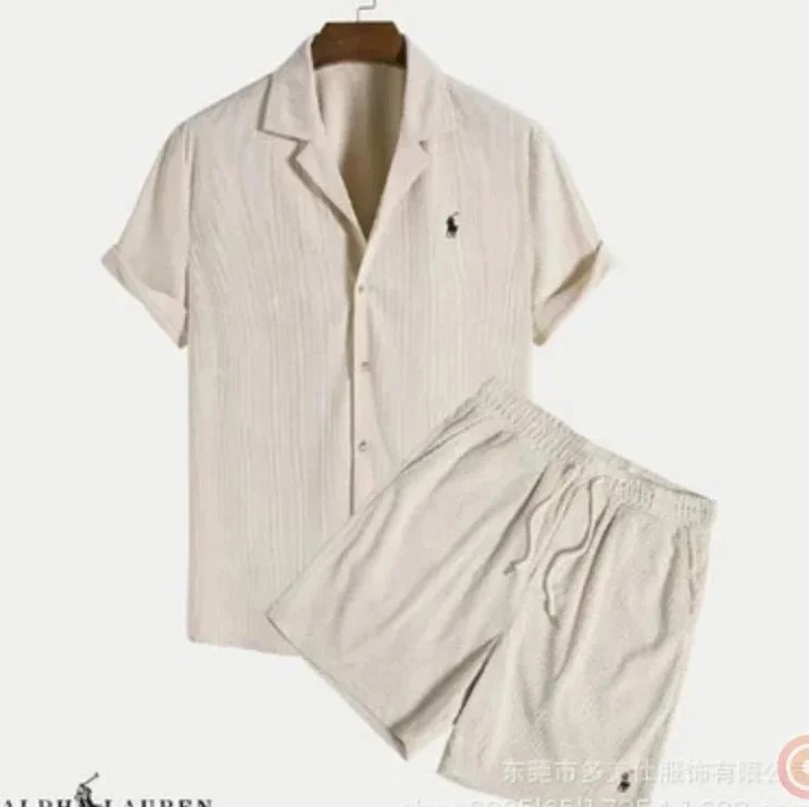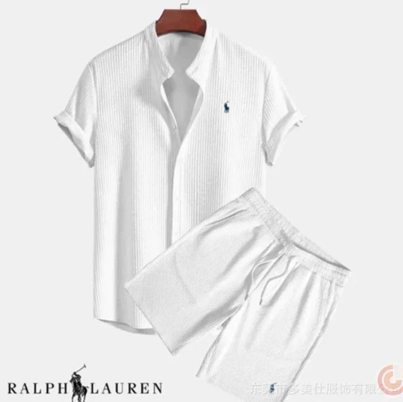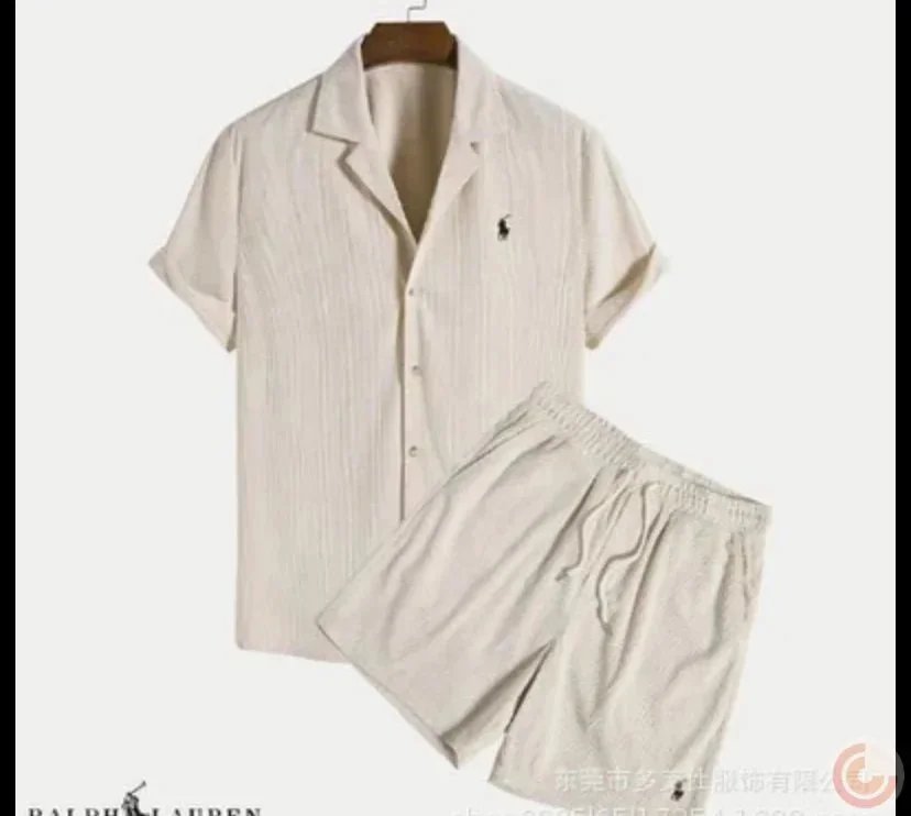 Stylish Ralph Lauren white ribbed short sleeve shirt and shorts set featuring the iconic polo logo. Perfect for relaxed summer days or casual lounging.