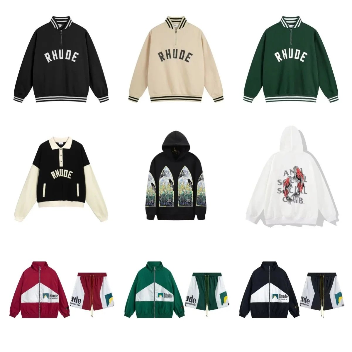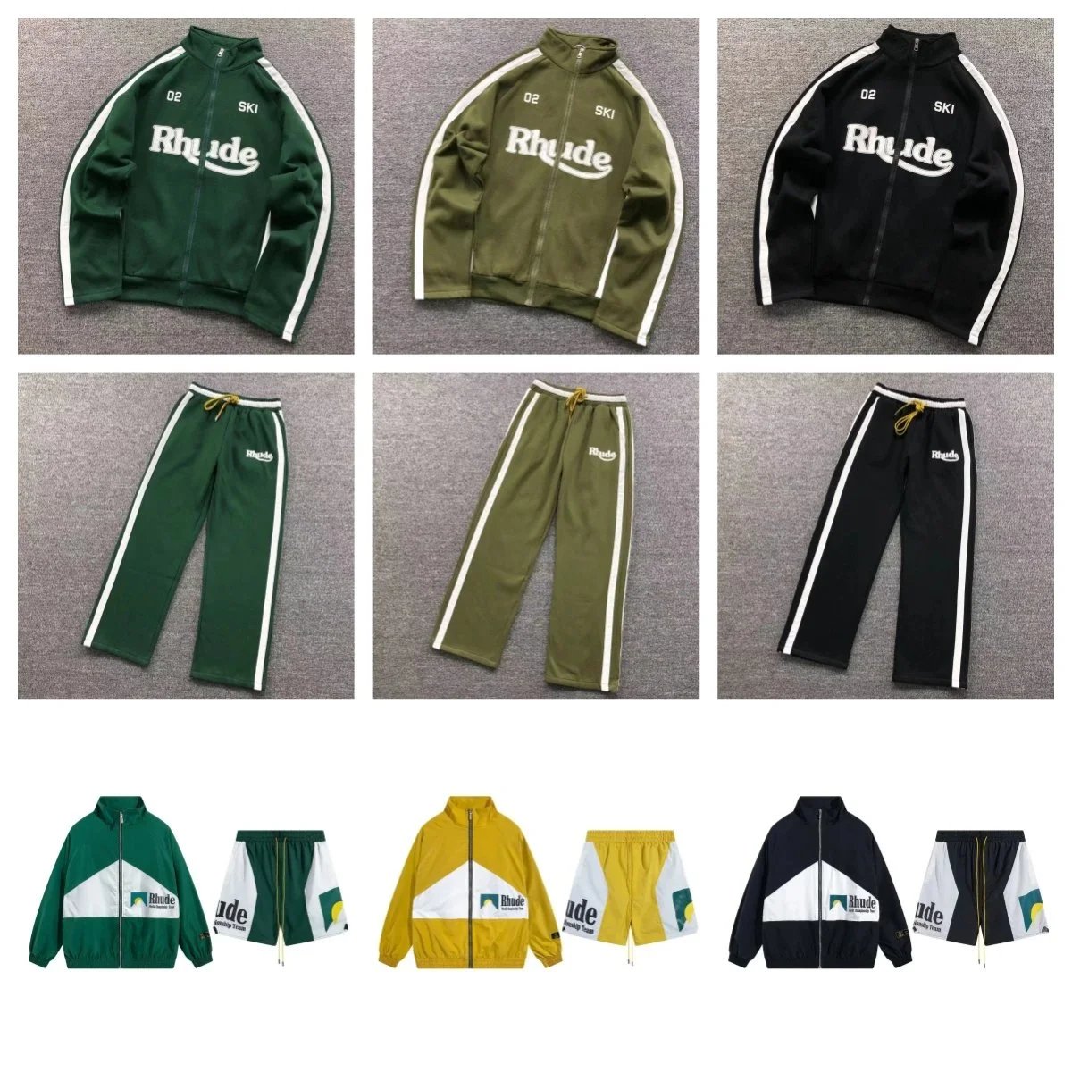 Discover the premium Rhude Ski track suit collection featuring matching jackets and pants in green, olive, black, and bold colorblock designs. Perfect for streetwear and athletic style.