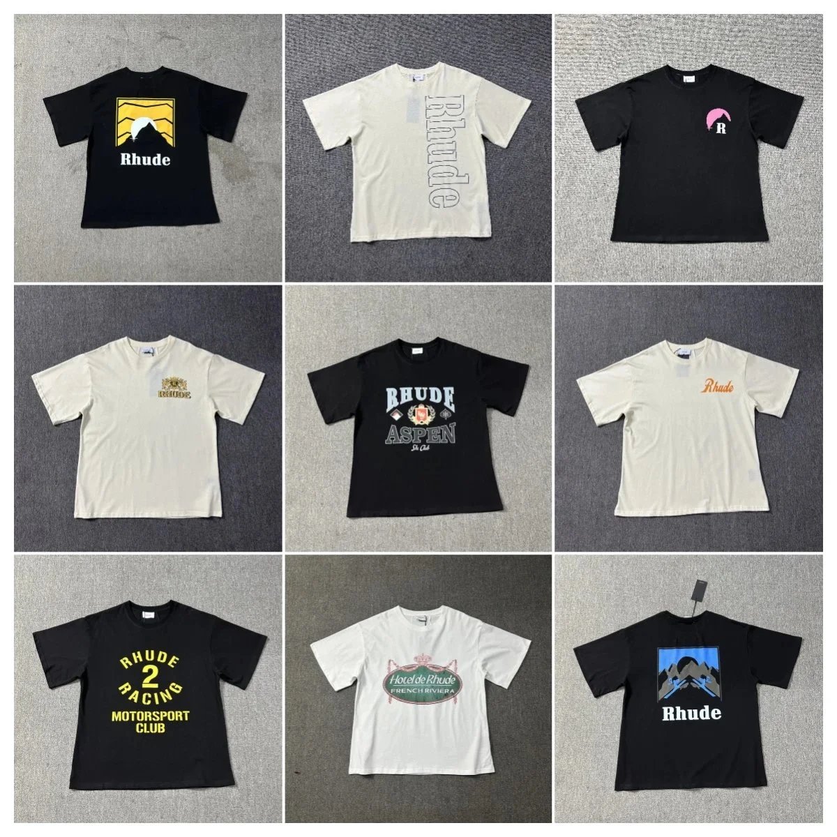 Explore the Rhude T-Shirts collection featuring bold graphics, mountain motifs, and iconic logos in black and cream. Perfect for streetwear enthusiasts seeking distinctive designs.