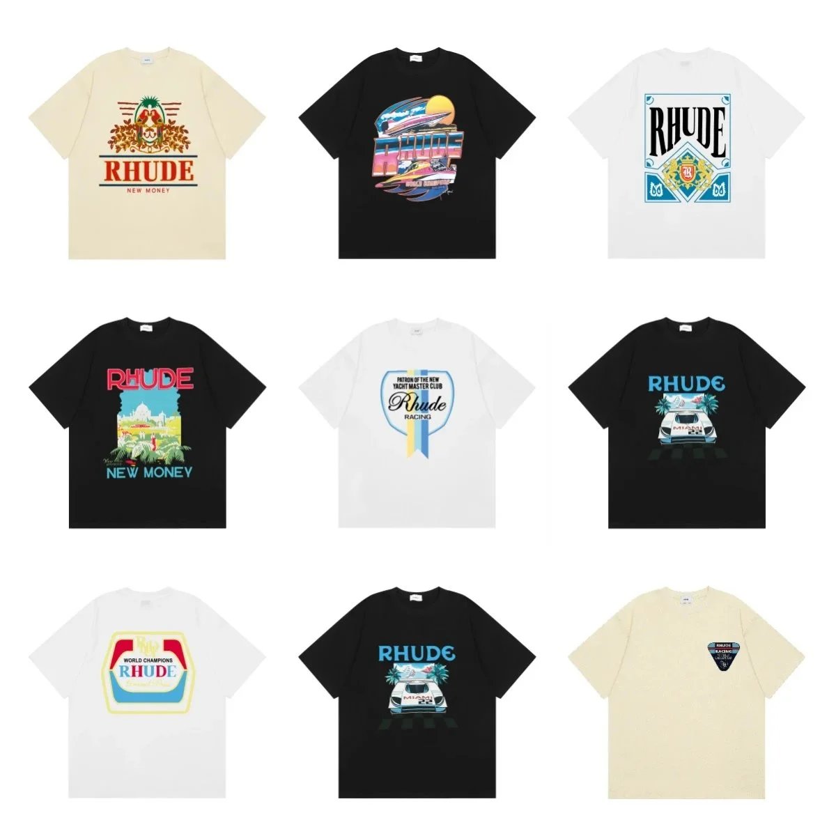 Explore RHUDE's bold t-shirt collection featuring retro racing motifs, yachting club emblems, and 'New Money' branding. Each piece combines vintage aesthetics with modern streetwear appeal.
