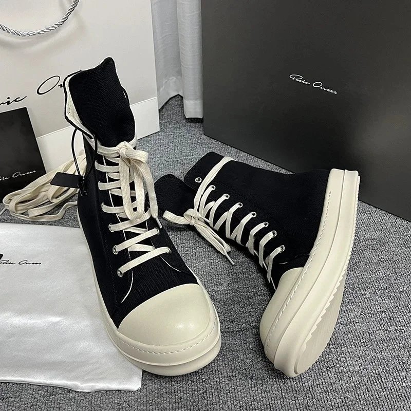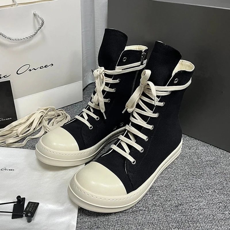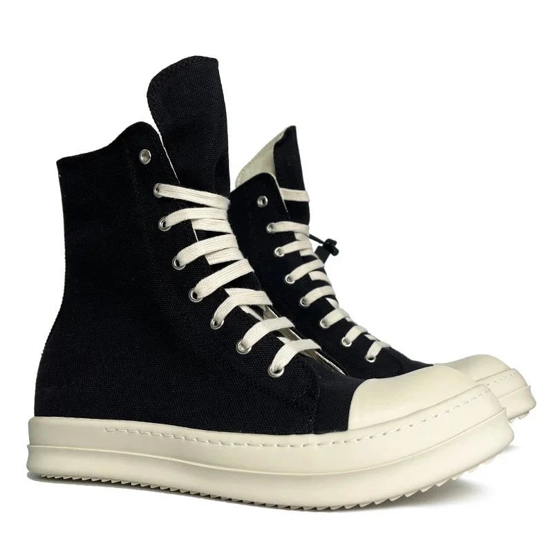 Stylish black high-top canvas sneakers by Ric Owens featuring a bold cream rubber sole and premium detailing for modern streetwear looks.
