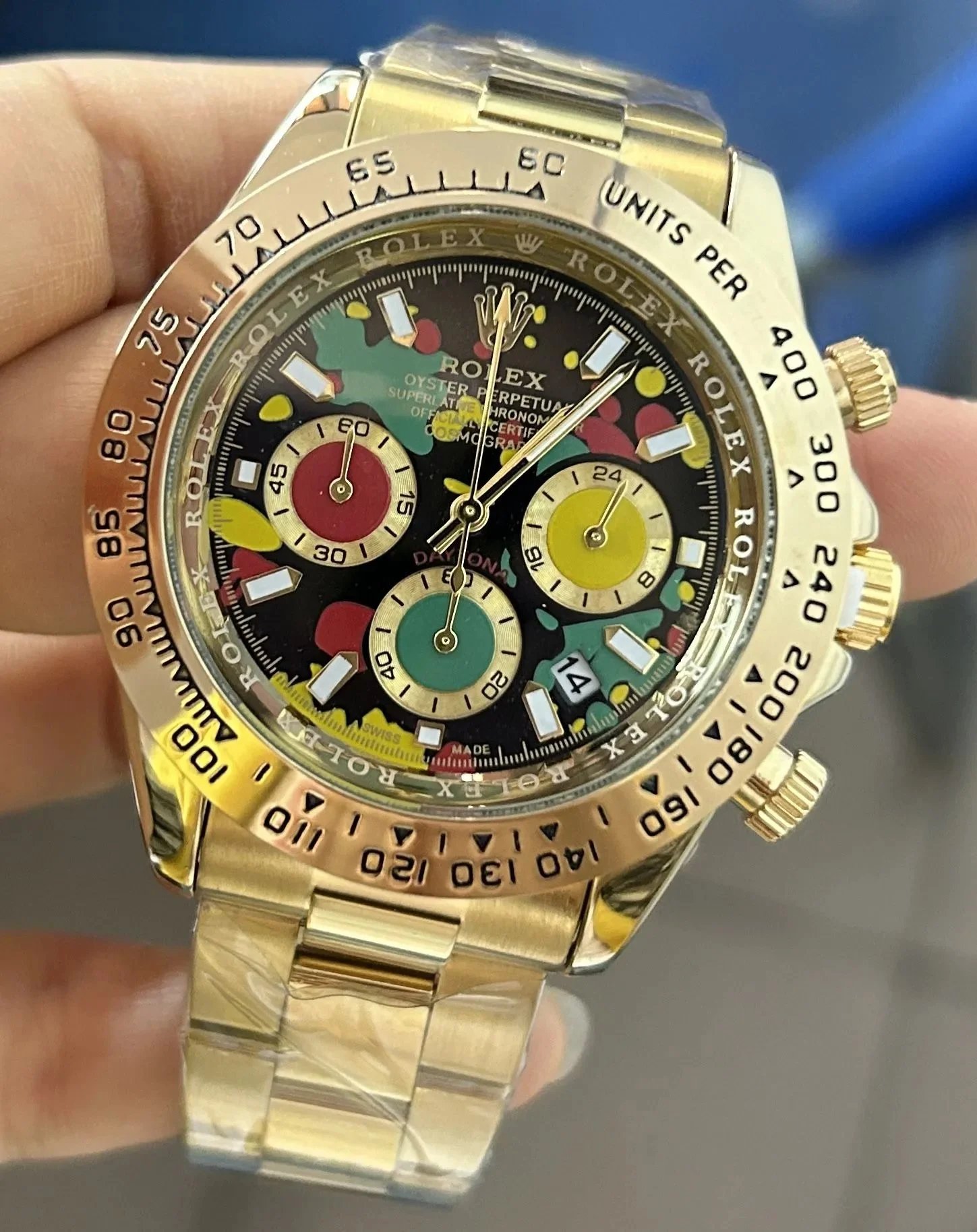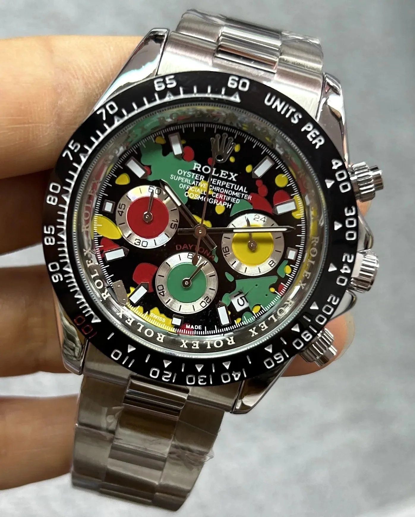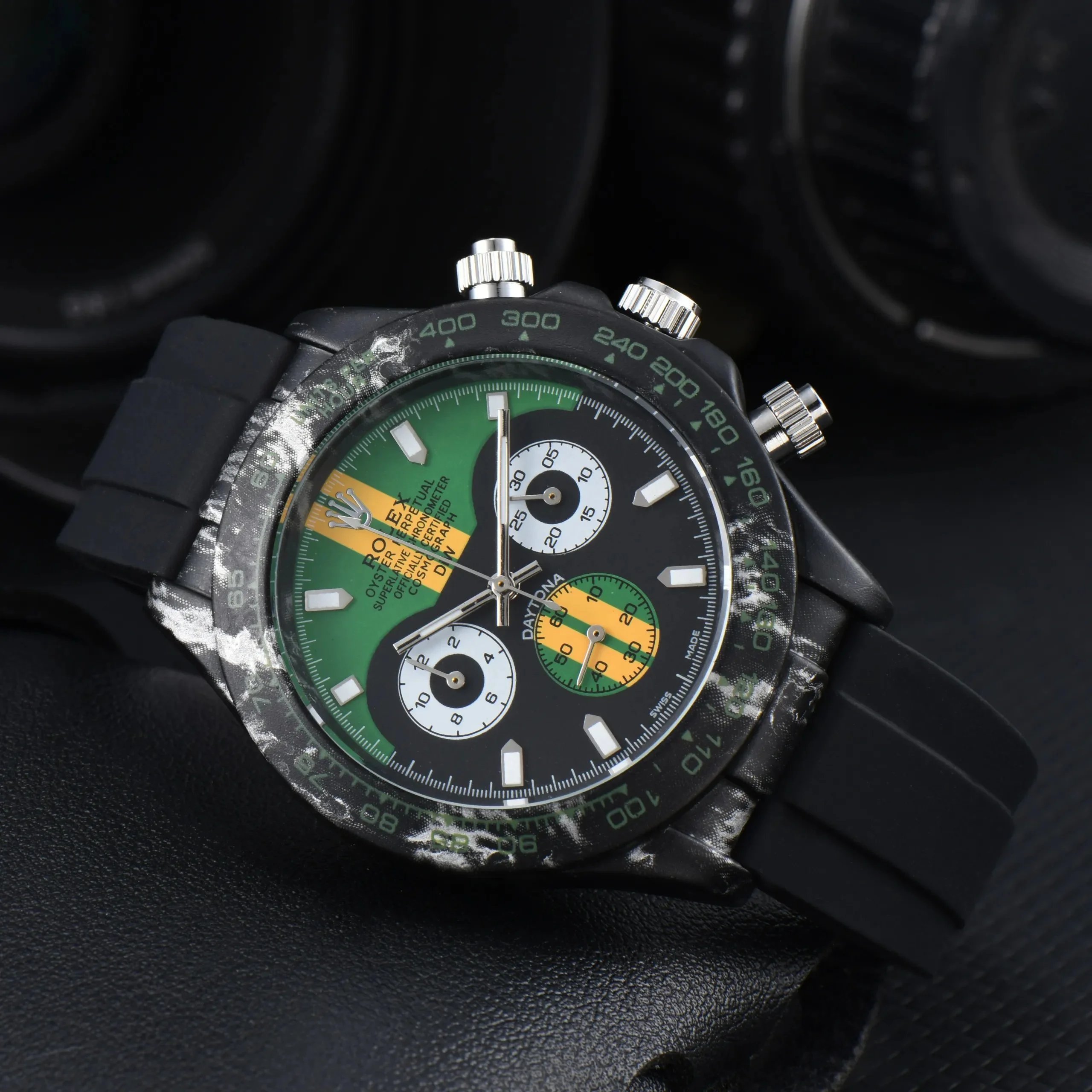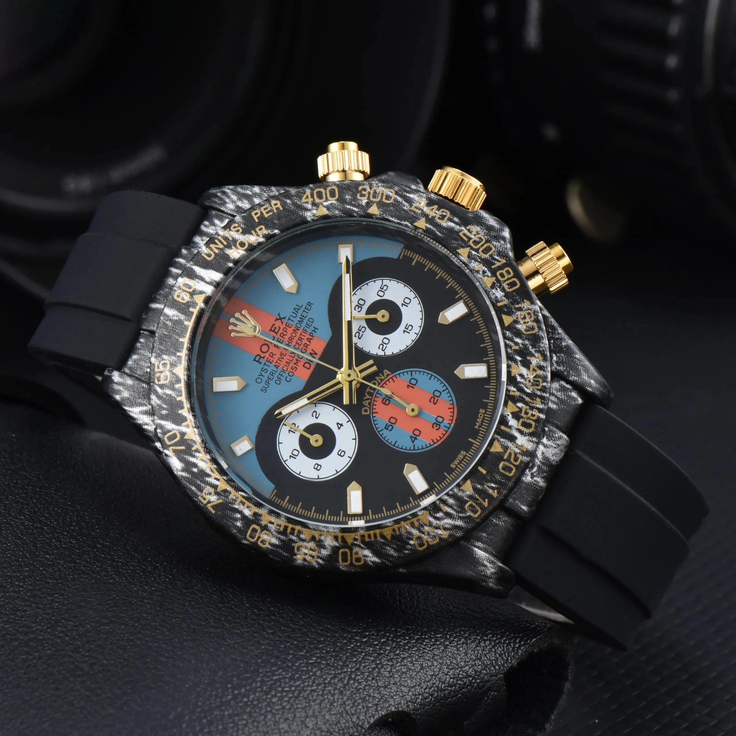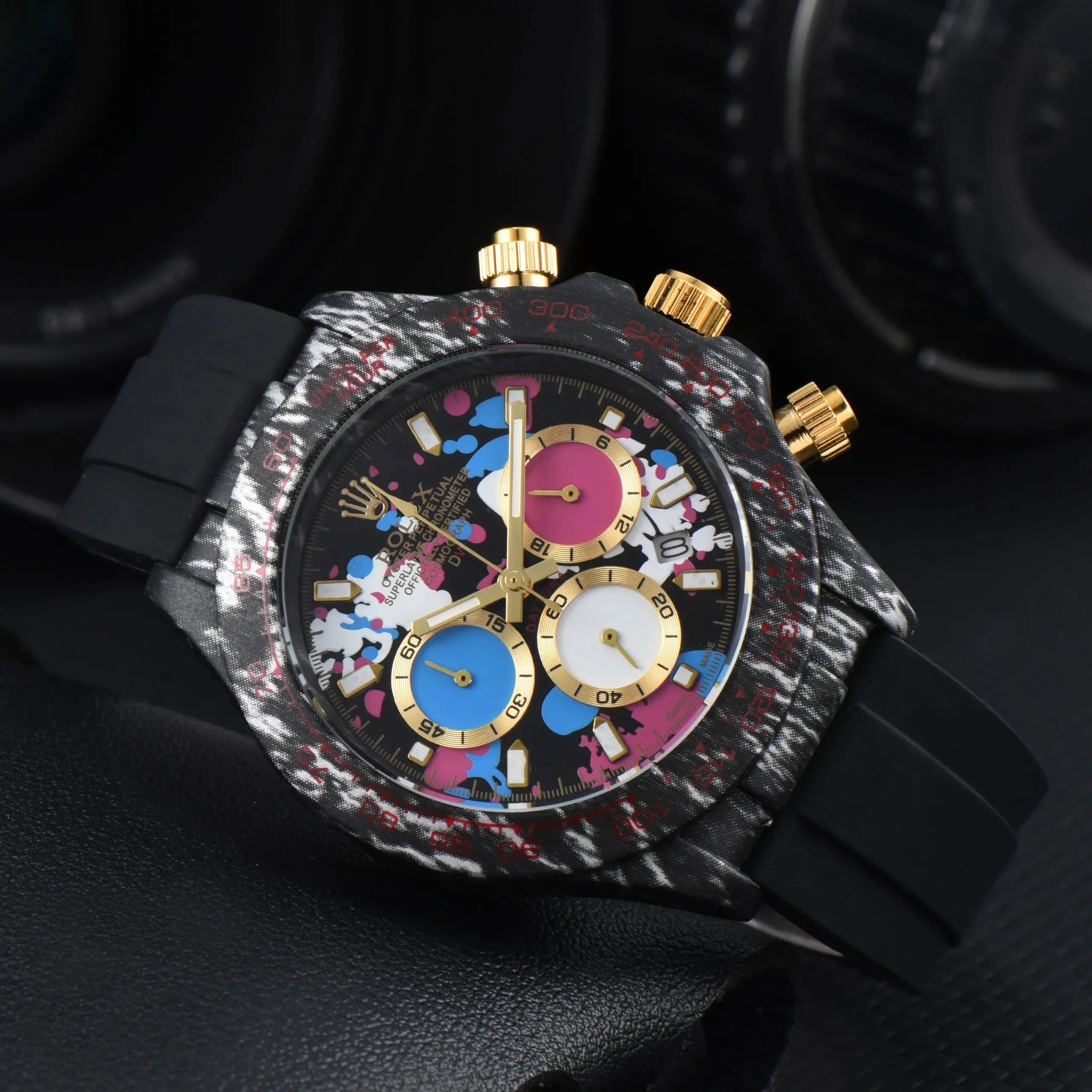 Discover premium Rolex Daytona chronographs featuring distinctive dials — from vibrant colors to textured patterns — paired with gold or steel cases and rubber or metal bracelets for versatile luxury appeal.