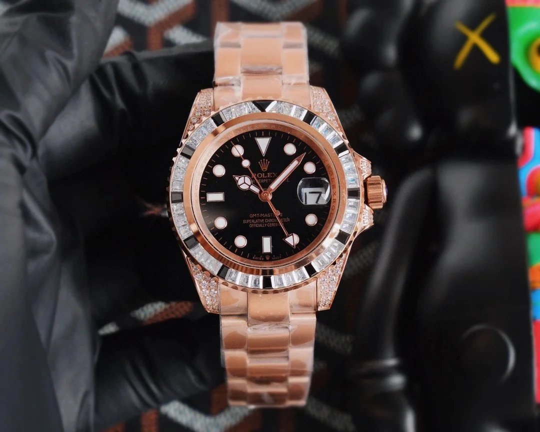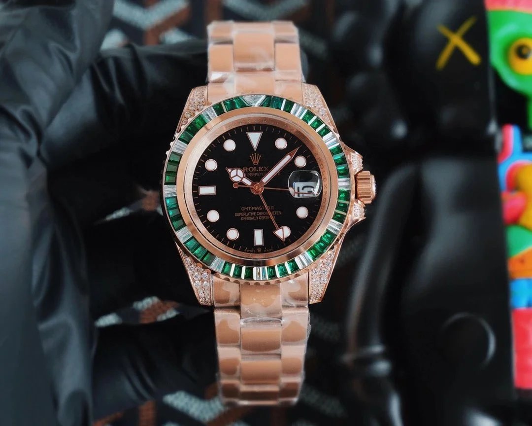 Luxury Rolex GMT-Master II featuring a rose gold case, black dial, and a stunning multi-colored gemstone bezel with diamonds. A perfect blend of elegance and precision engineering.