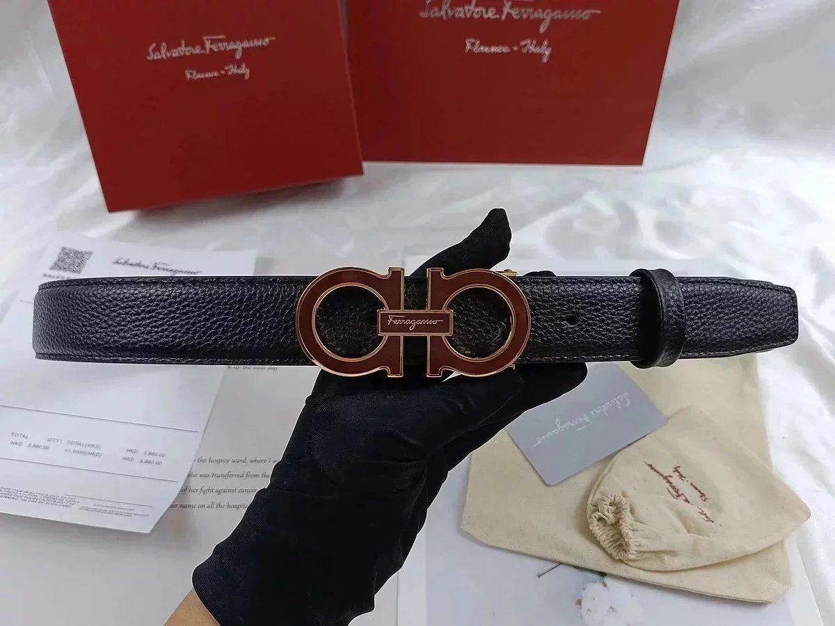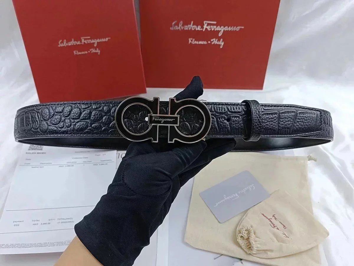 Authentic Salvatore Ferragamo Gancini belt in black with a python-embossed pattern and signature gold-tone buckle. A timeless luxury accessory for refined style.