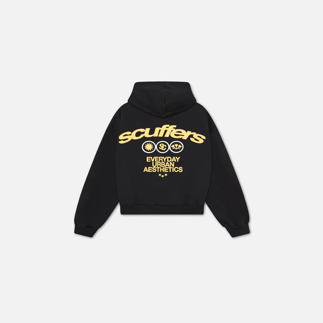Elevate your streetwear game with the Scuffers black hoodie featuring bold gold lettering and iconic circular graphics for everyday urban aesthetics.