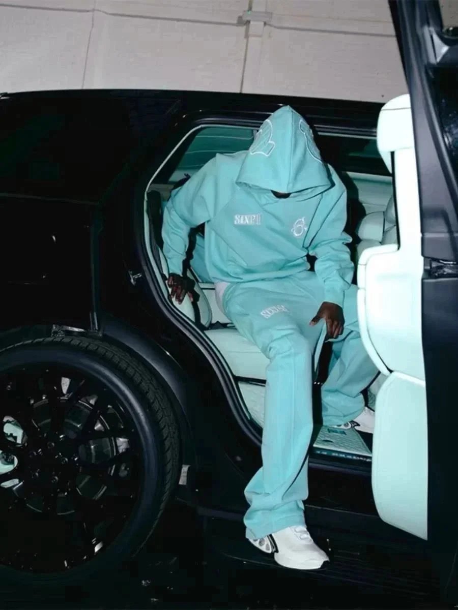 SIXPM branded hoodies and matching sweatpants in mint, black, and blue. Designed for comfort with bold logo detailing and relaxed fit for everyday wear.