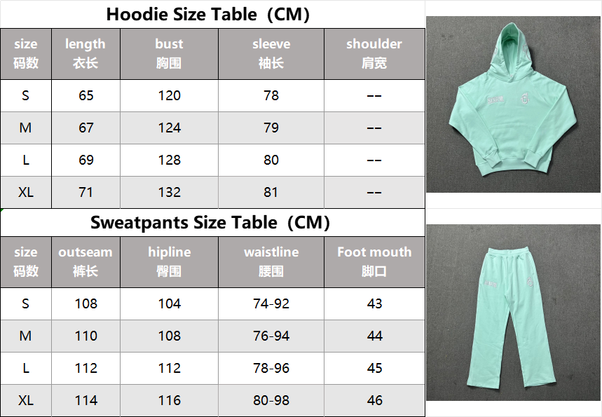 SIXPM branded hoodies and matching sweatpants in mint, black, and blue. Features embroidered logos and relaxed fit for everyday comfort.