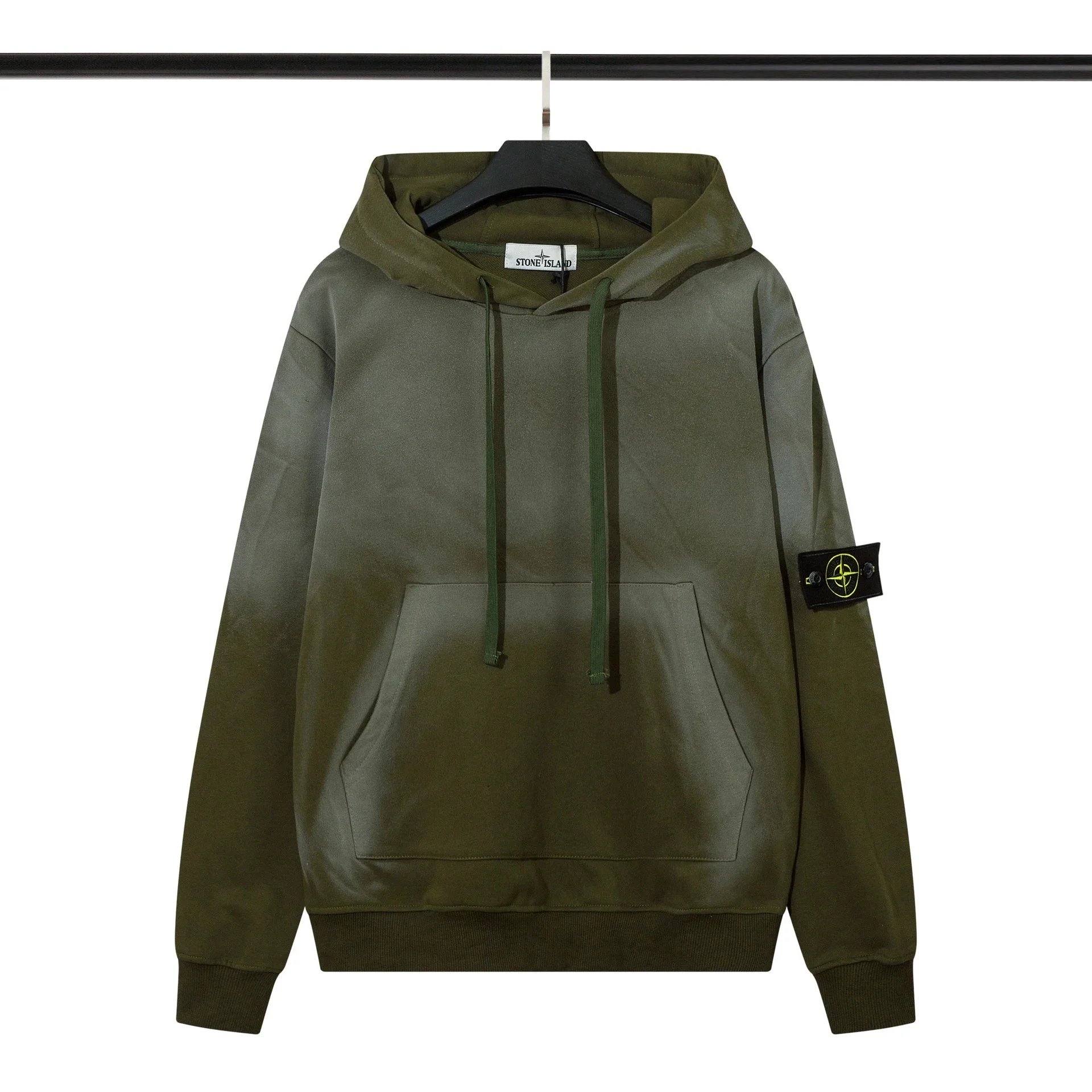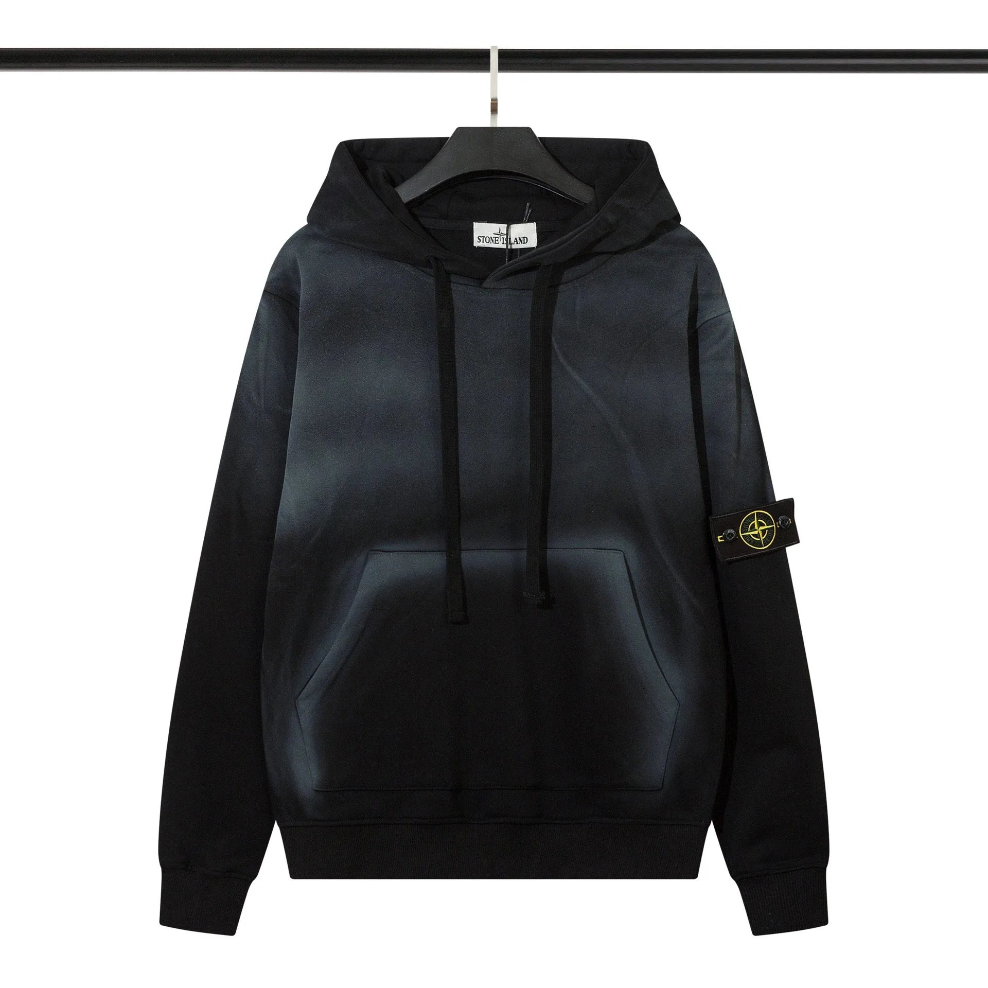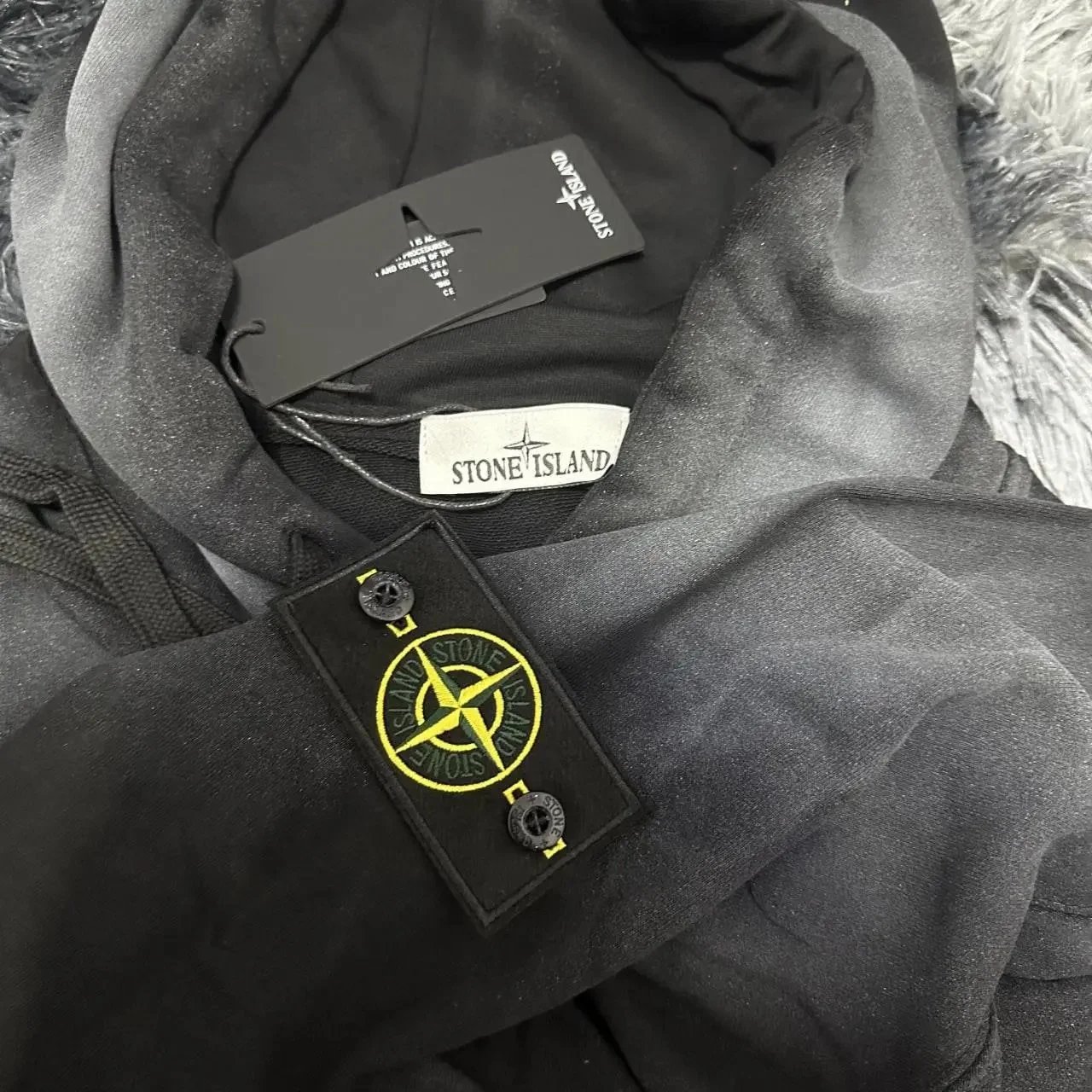 Premium Stone Island hoodie featuring a striking black gradient wash and iconic compass badge. Perfect for modern streetwear style.