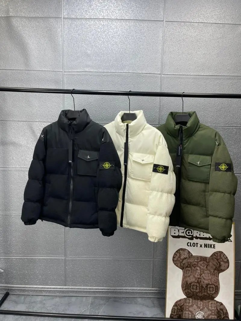 Premium black Stone Island puffer jacket featuring a distinctive yellow compass logo patch and ribbed sleeves. Designed for warmth and style in cold weather.