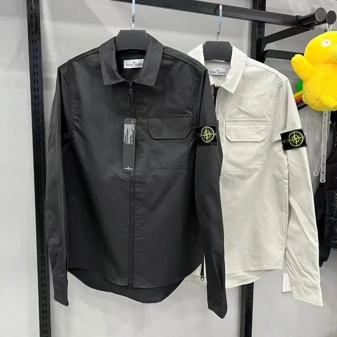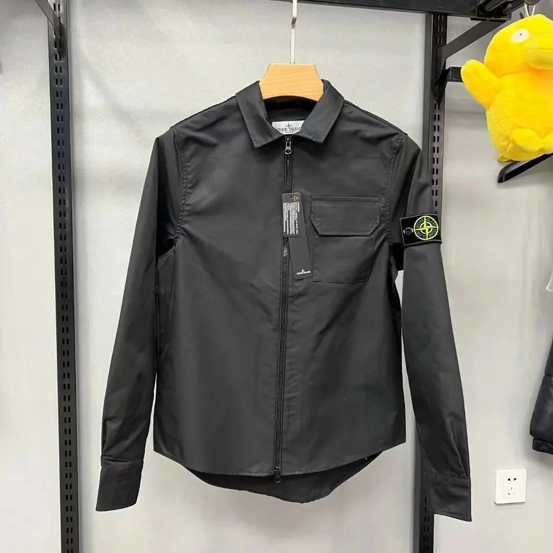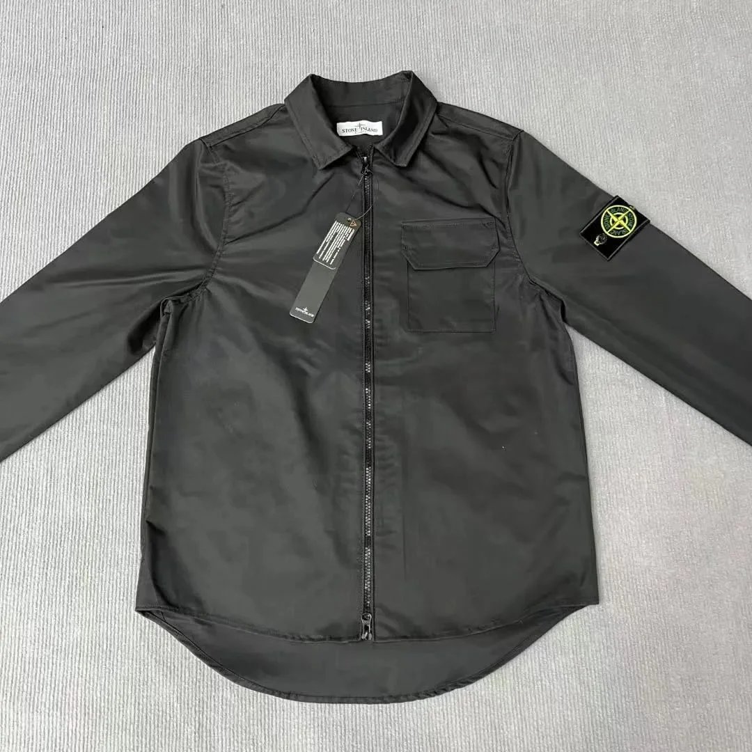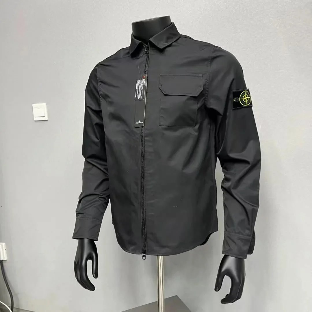 Premium Stone Island black long-sleeve zip-front shirt featuring a signature logo patch on the sleeve and a sleek, functional design for modern urban wear.