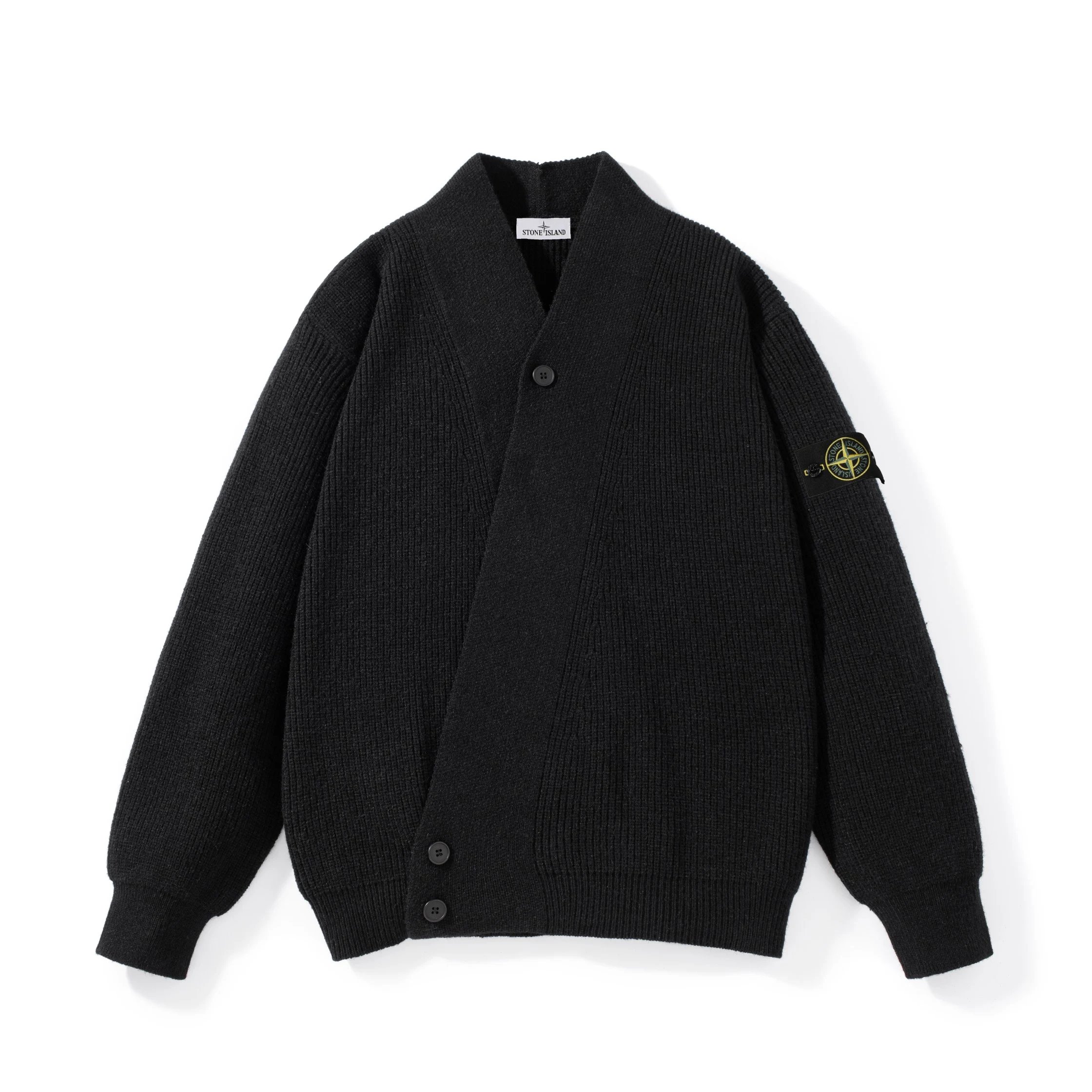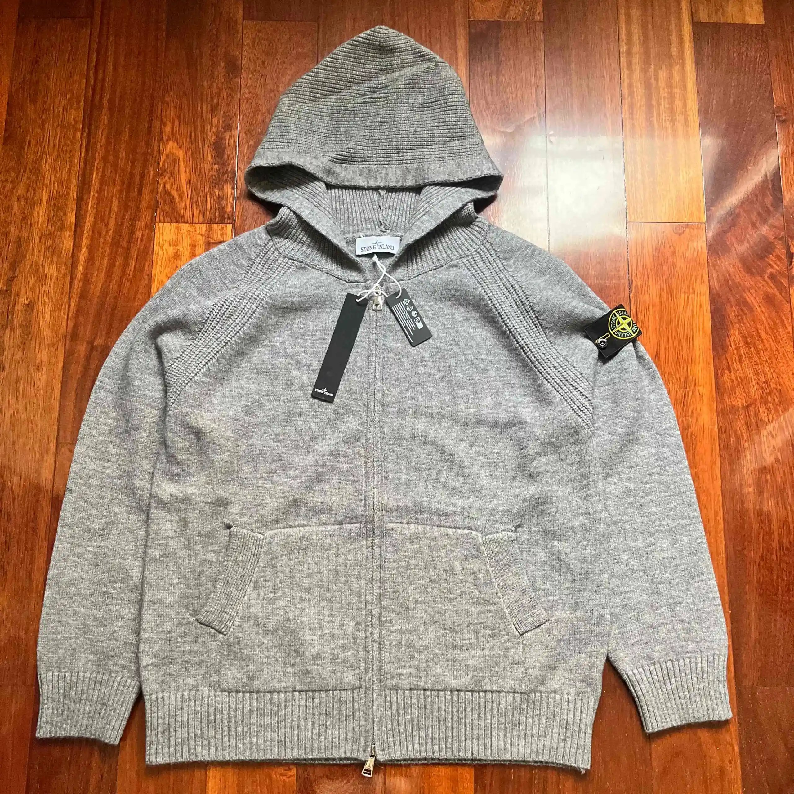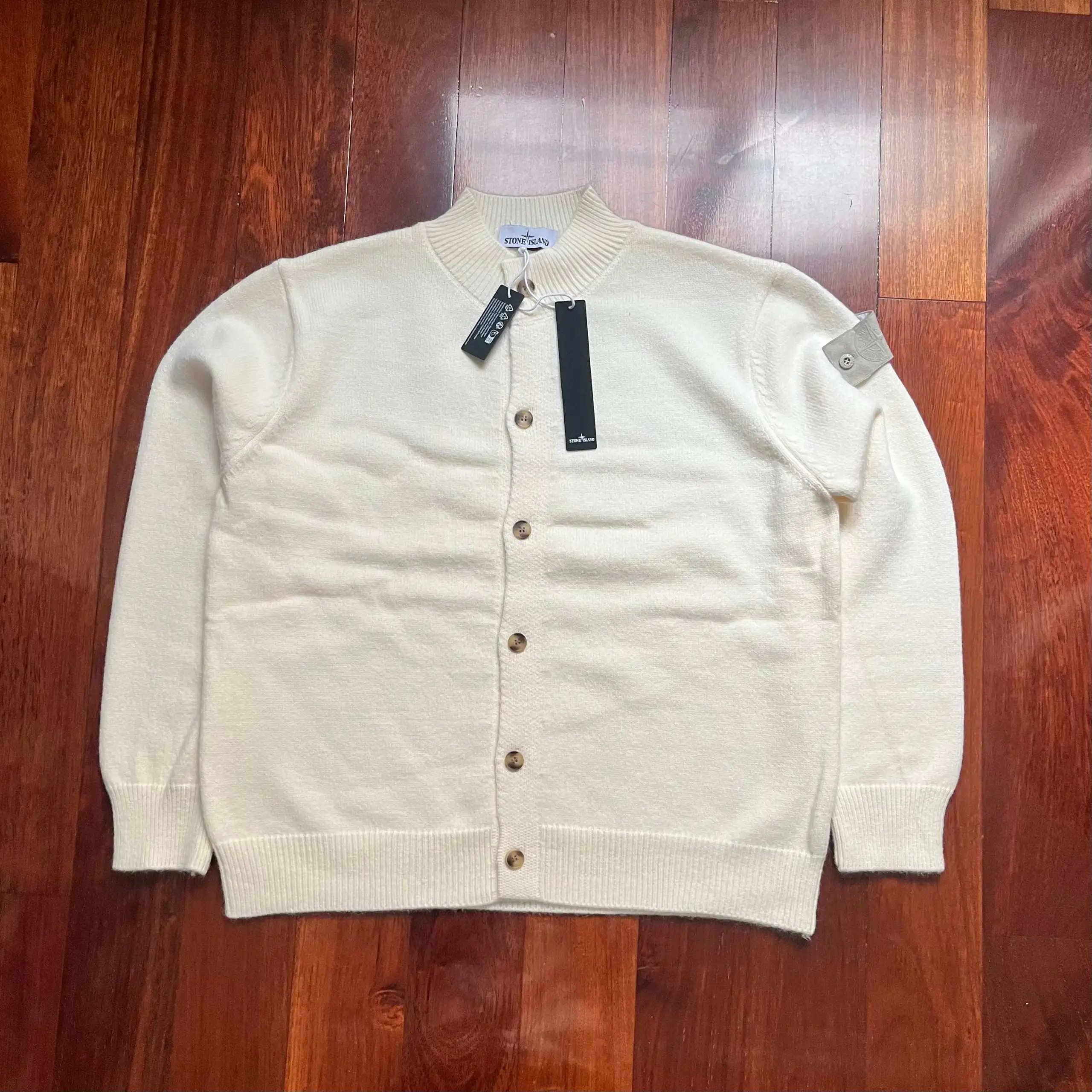 Elevate your wardrobe with this premium Stone Island grey ribbed cardigan featuring a signature compass logo patch and classic button closure.