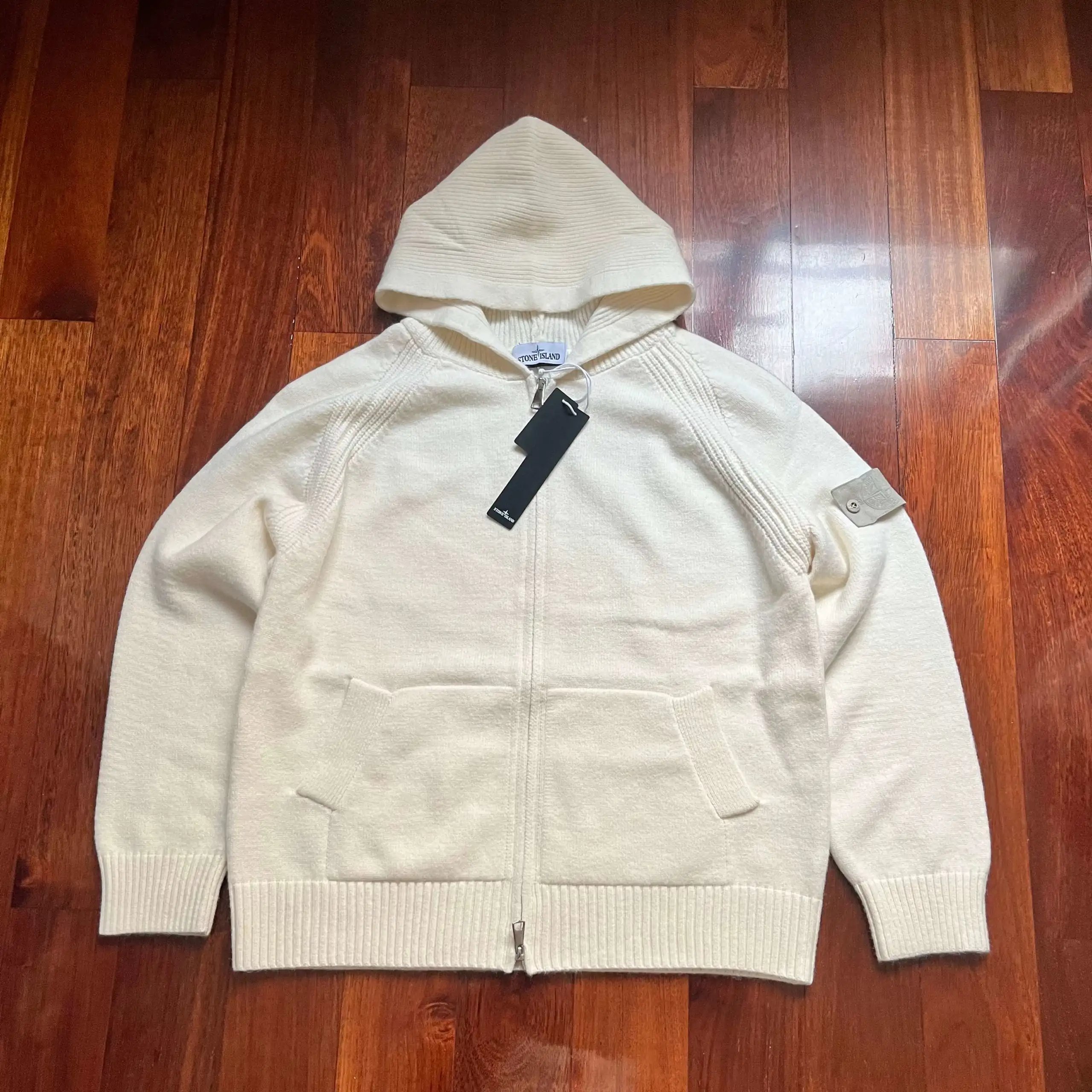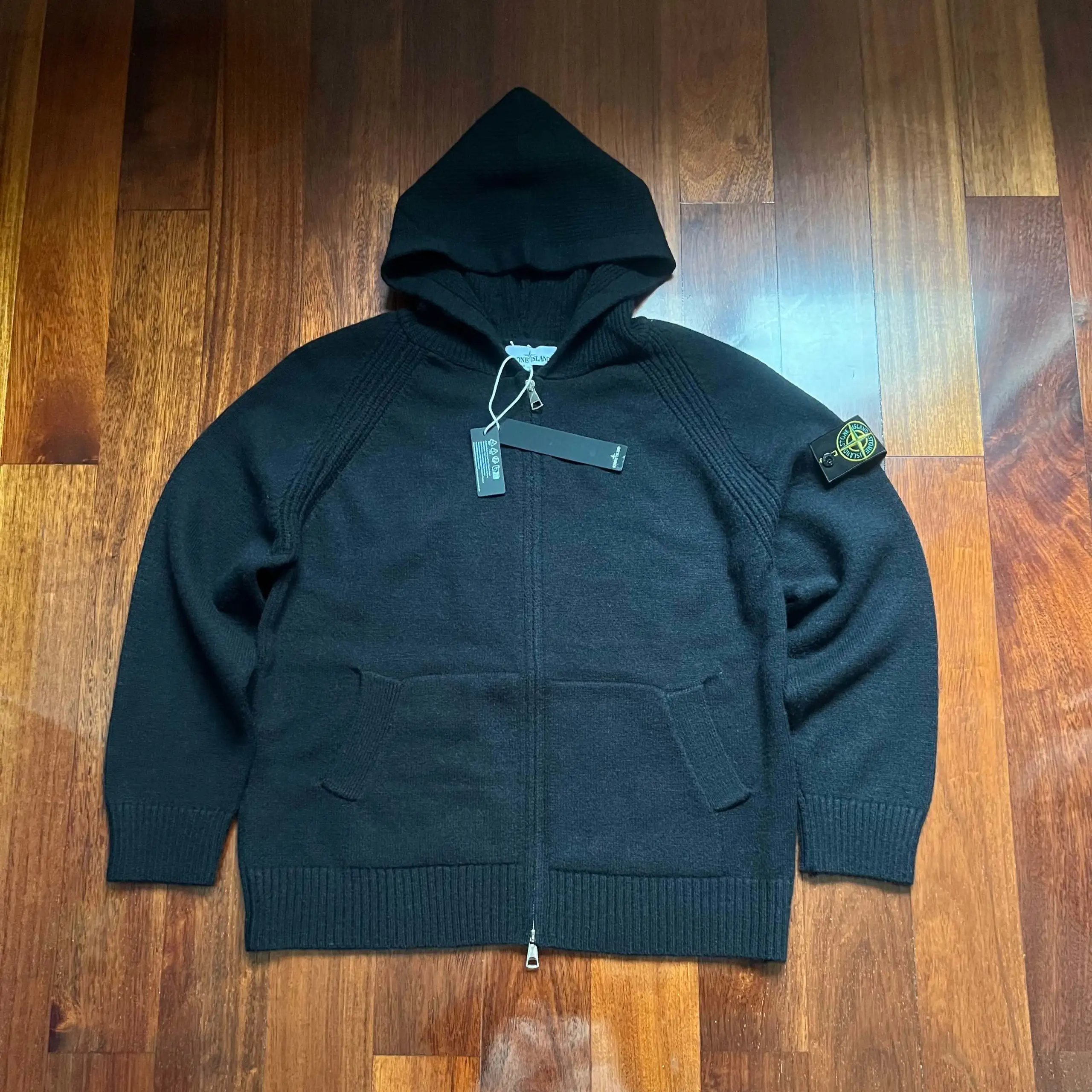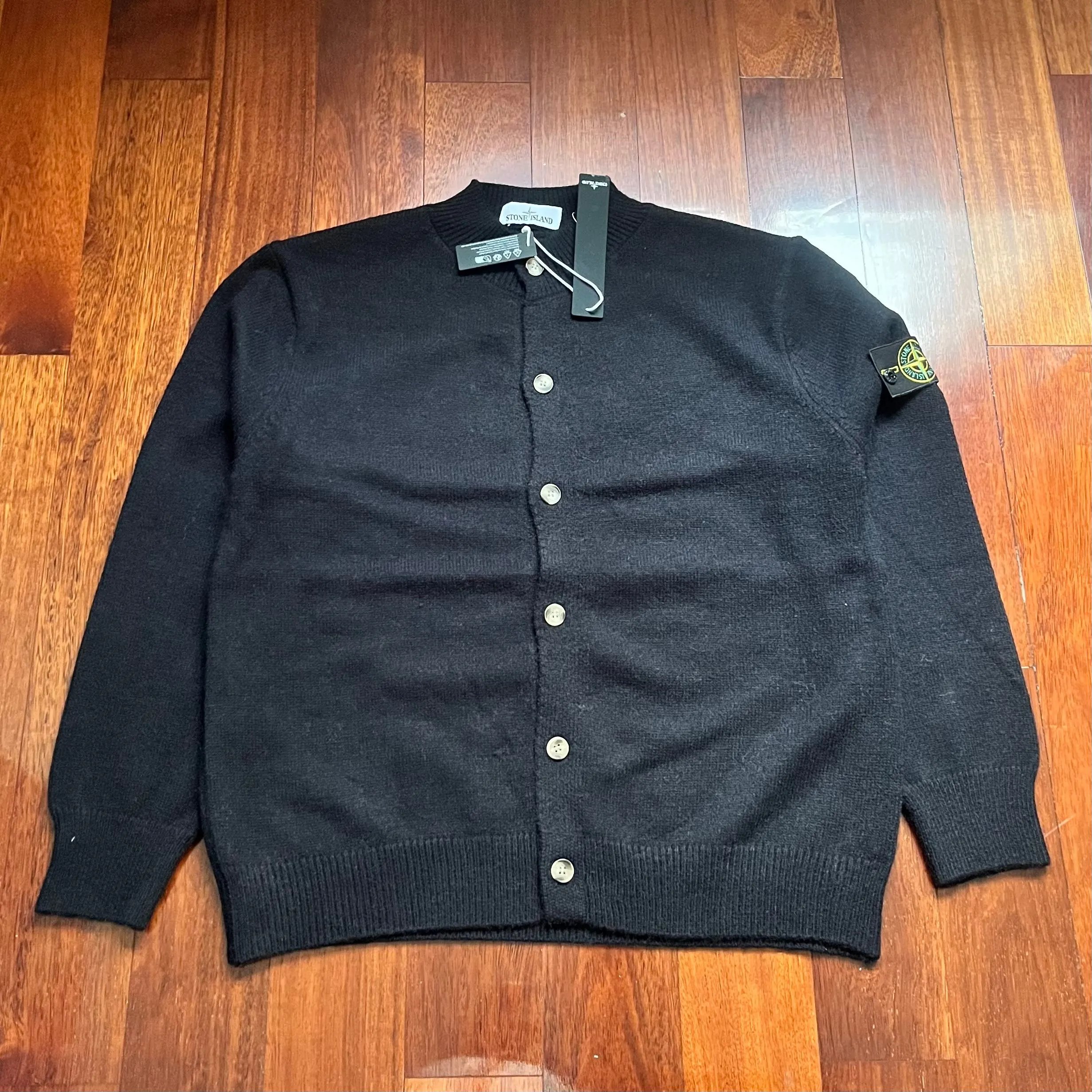 Elevate your wardrobe with this premium Stone Island grey ribbed cardigan featuring a signature compass logo patch and classic button closure.