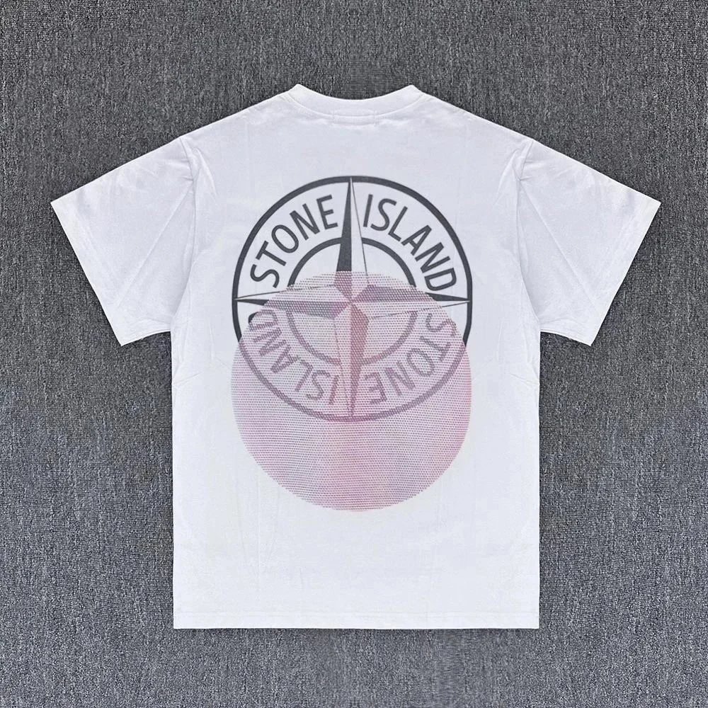 Classic white Stone Island t-shirt featuring the iconic compass logo and brand text. Designed for everyday wear with a clean, minimalist aesthetic. Durable cotton construction for comfort.