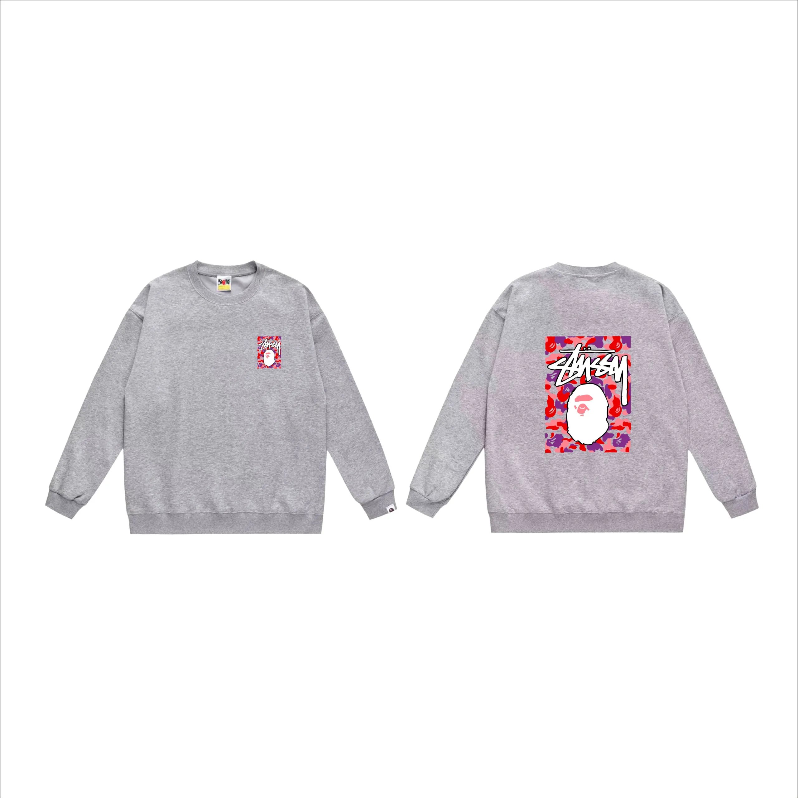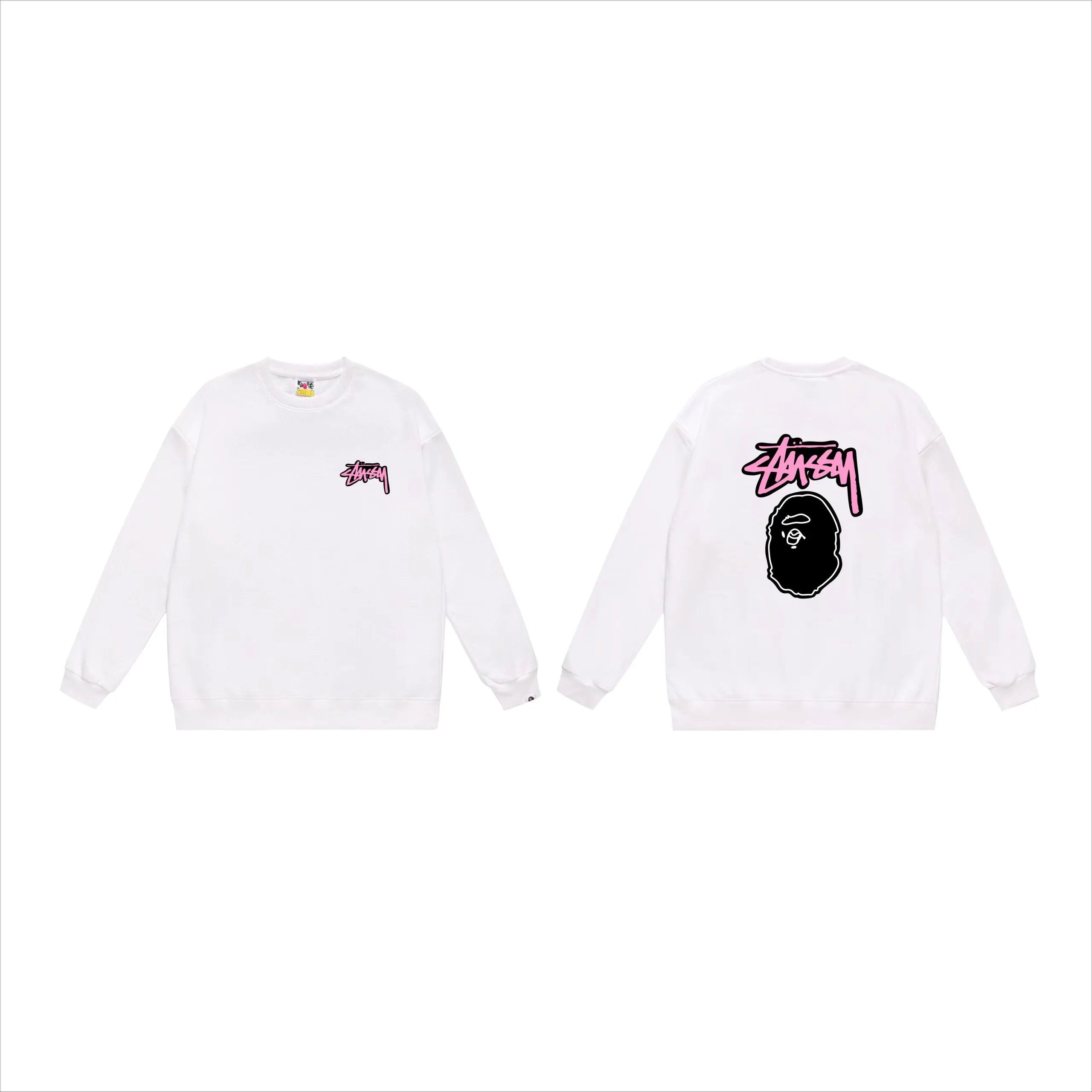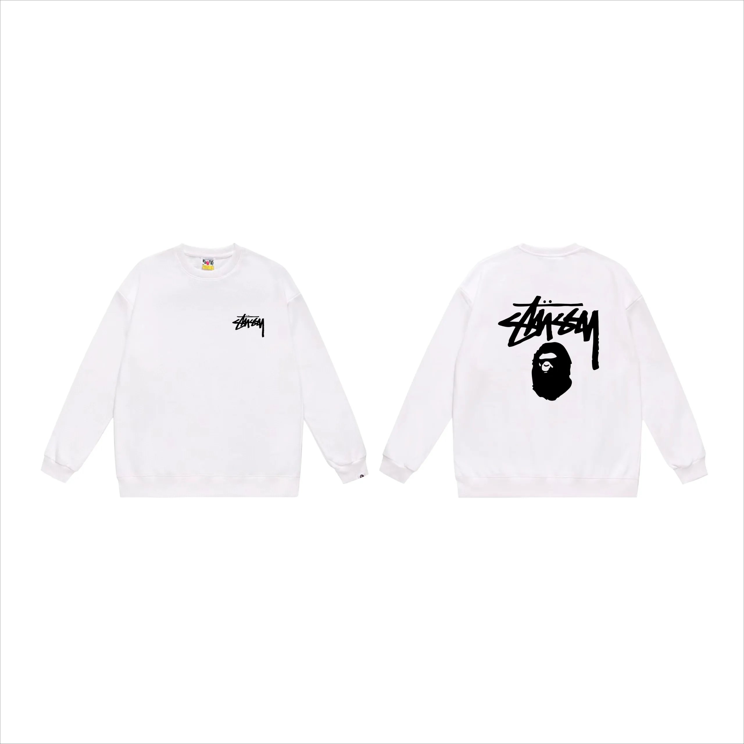 White Stussy x BAPE crewneck sweatshirt featuring bold black graphics on front and back. A must-have for streetwear fans.