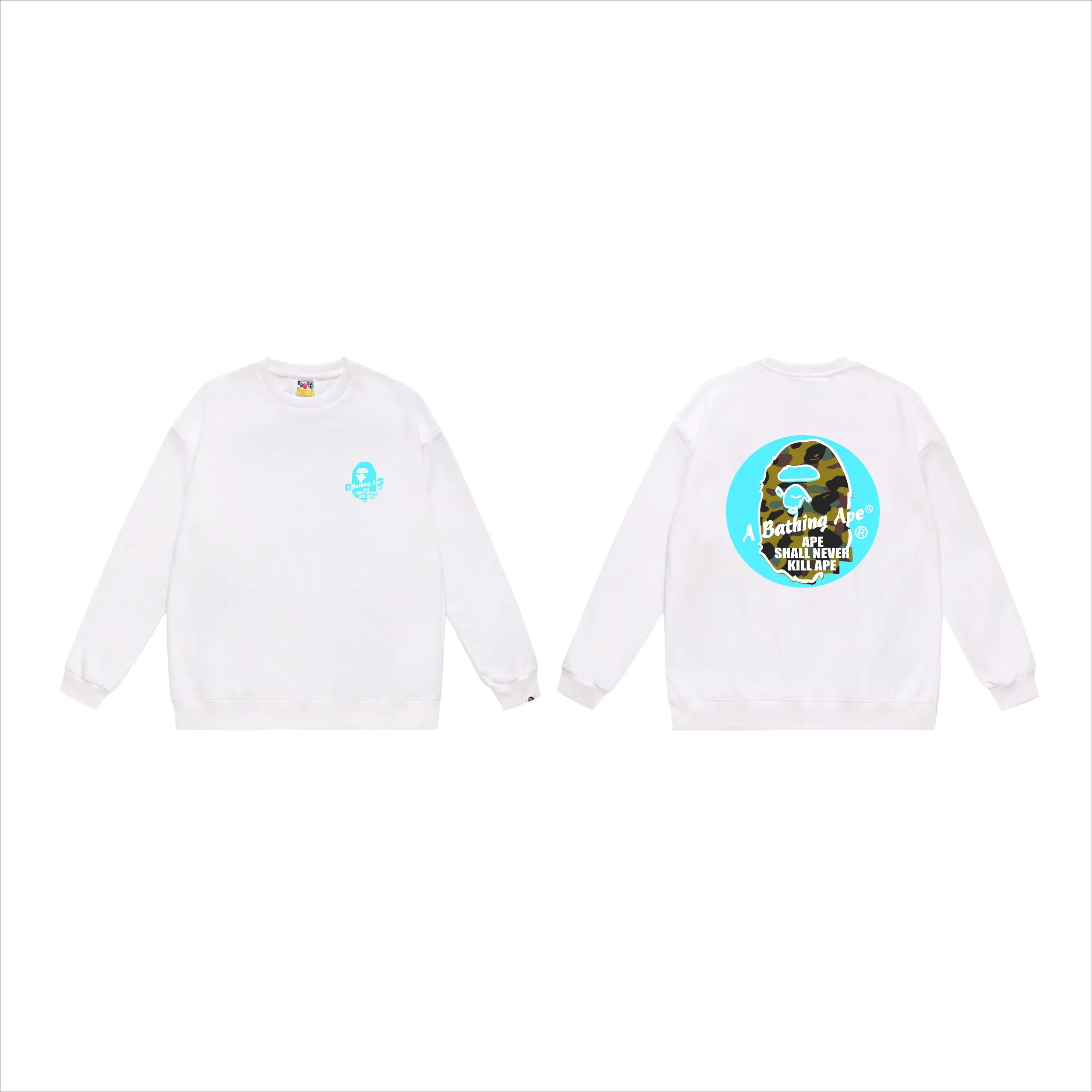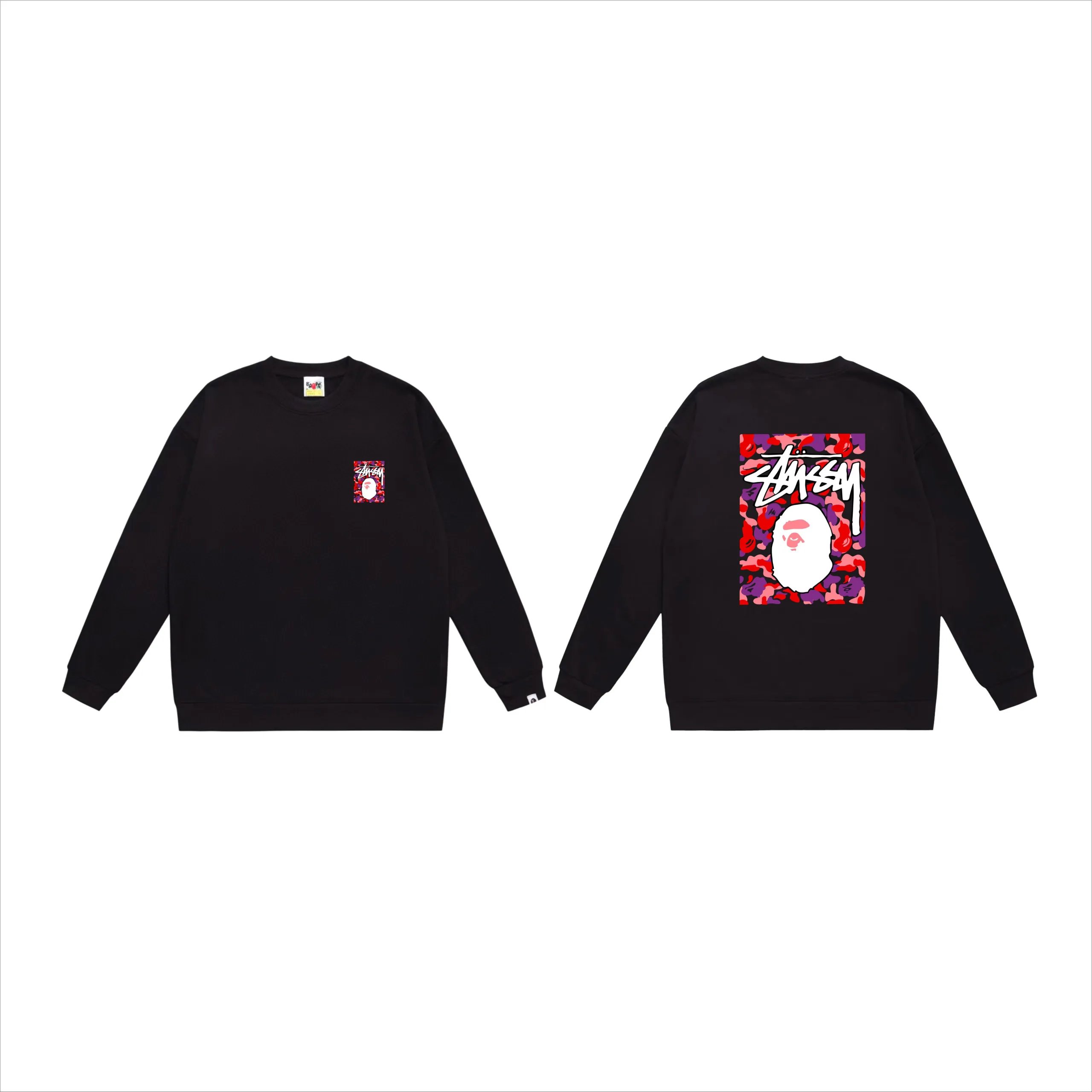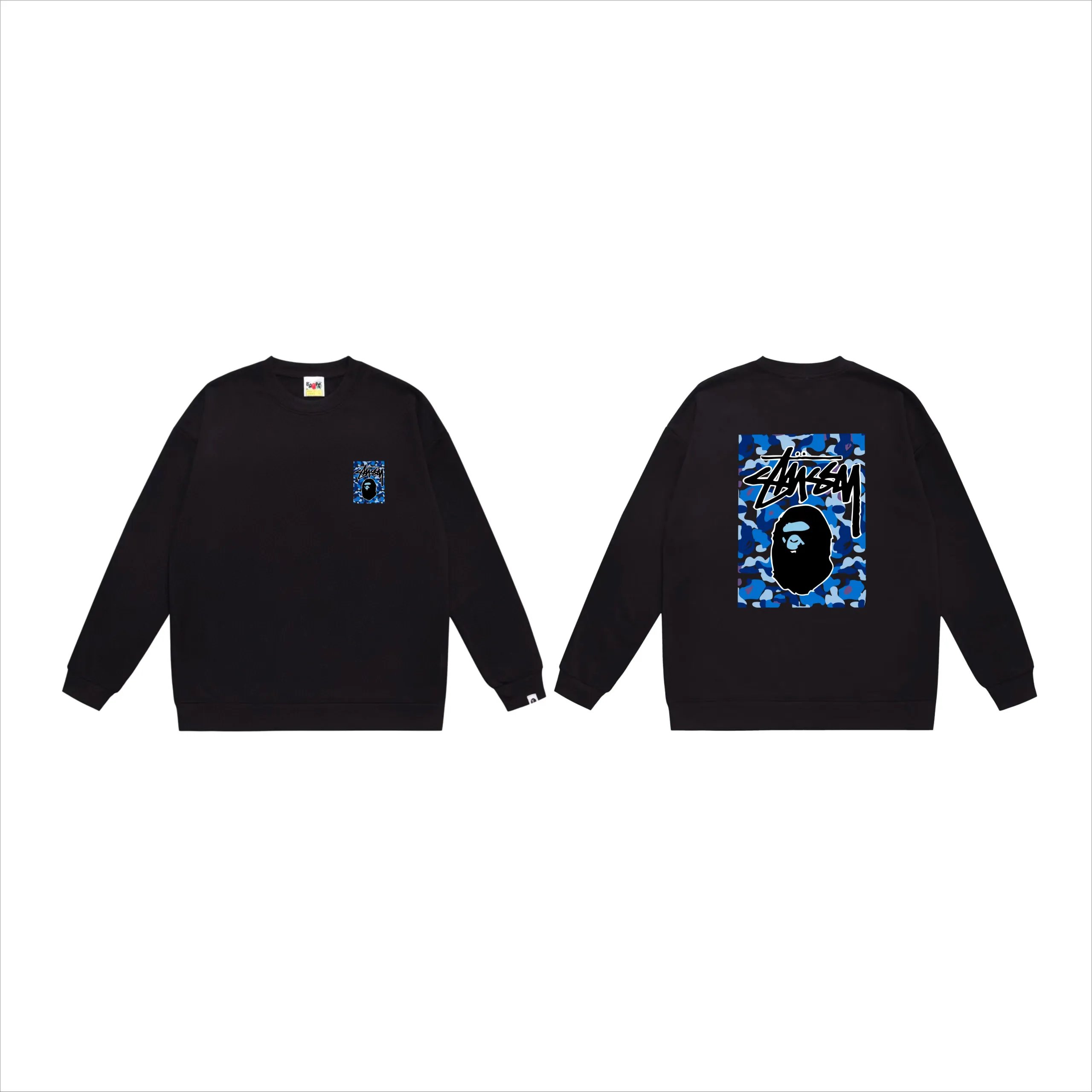 White Stussy x BAPE crewneck sweatshirt featuring bold black graphics on front and back. A must-have for streetwear fans.