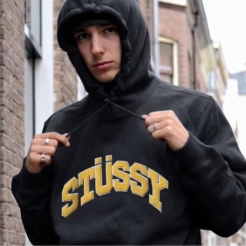 Elevate your streetwear game with this Stüssy black hoodie featuring a bold gold arch logo. Soft, comfortable, and stylish for everyday wear.