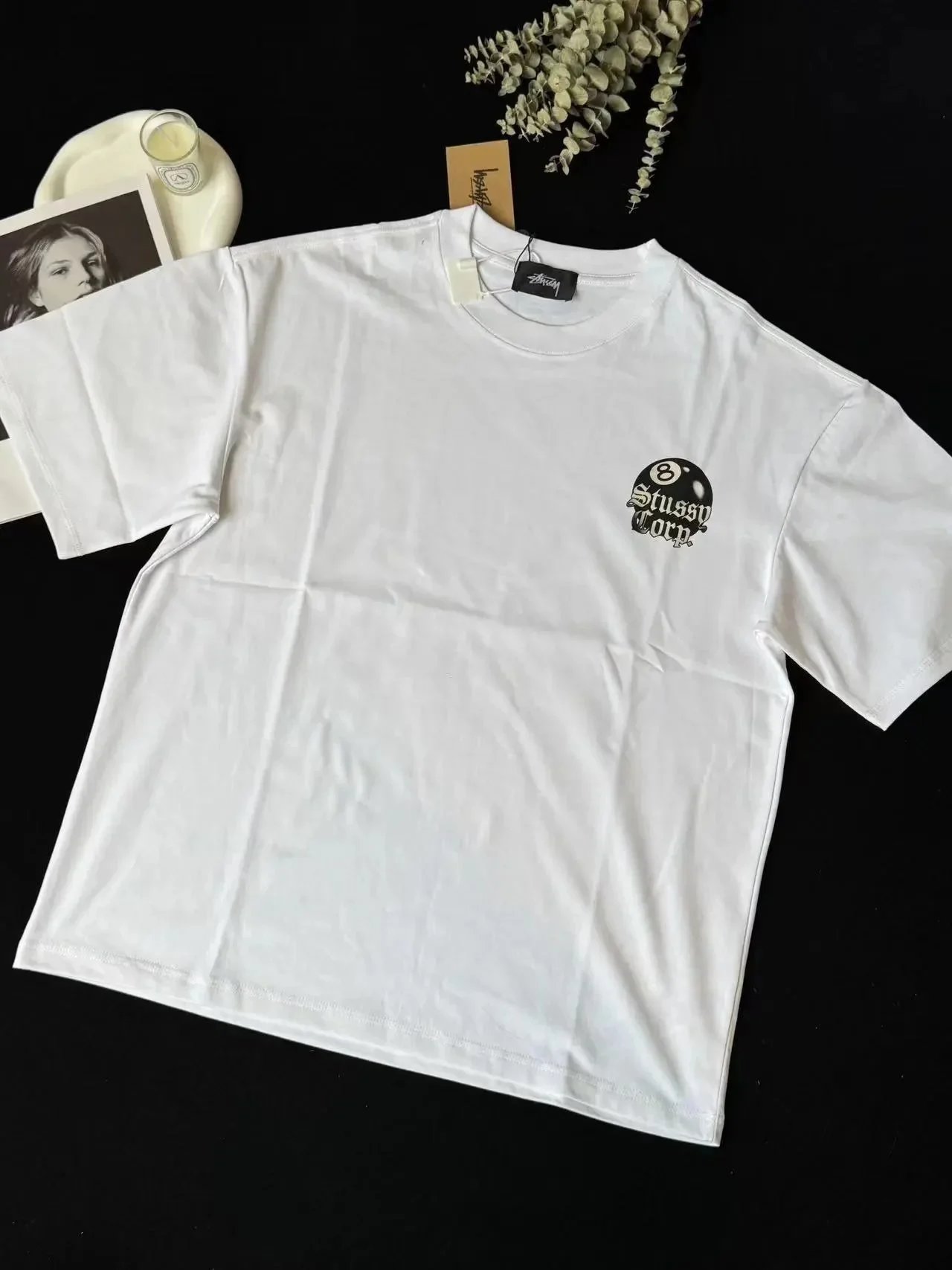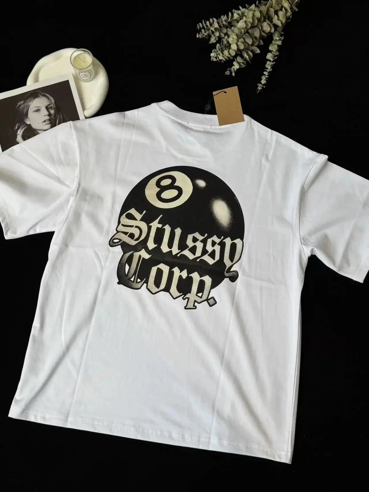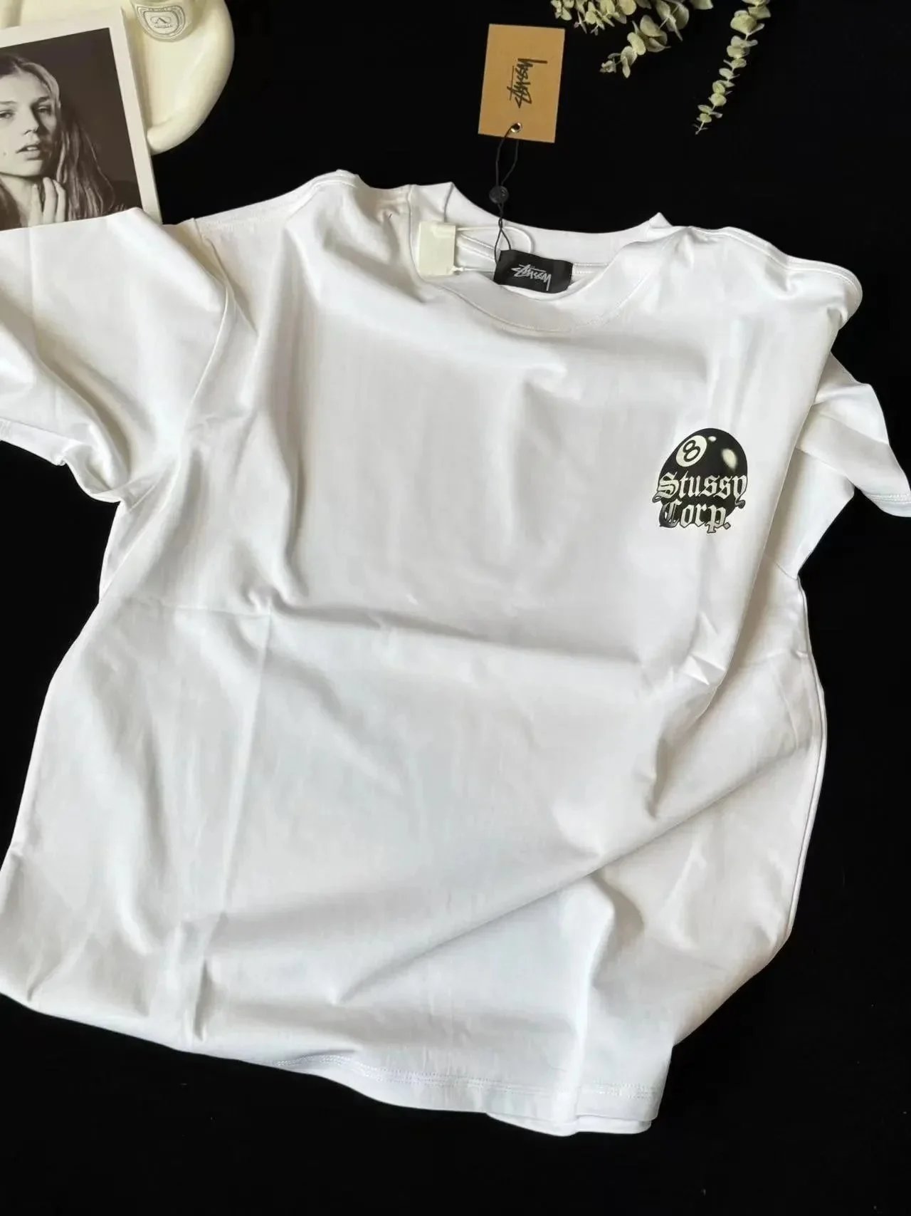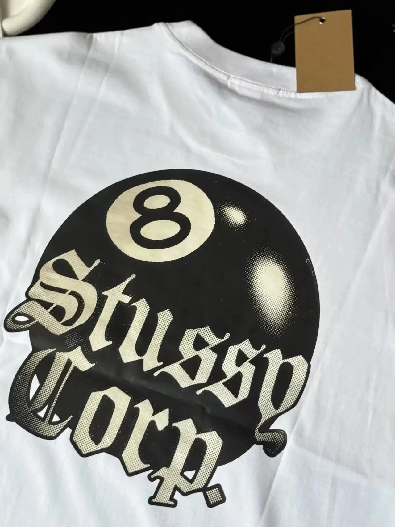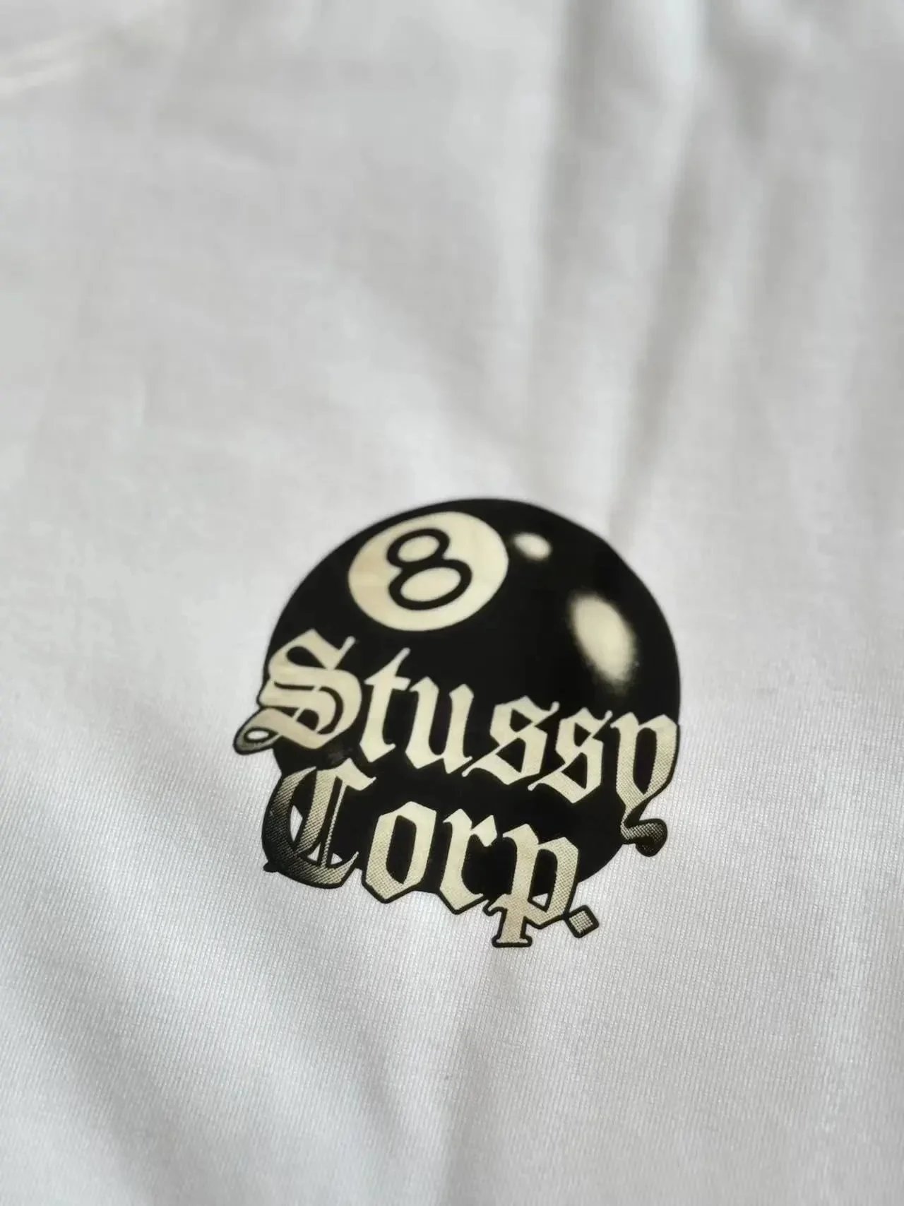 White Stussy Corp t-shirt featuring a bold black 8-ball graphic with vintage-style lettering. Ideal for streetwear enthusiasts seeking iconic branding and relaxed fit.