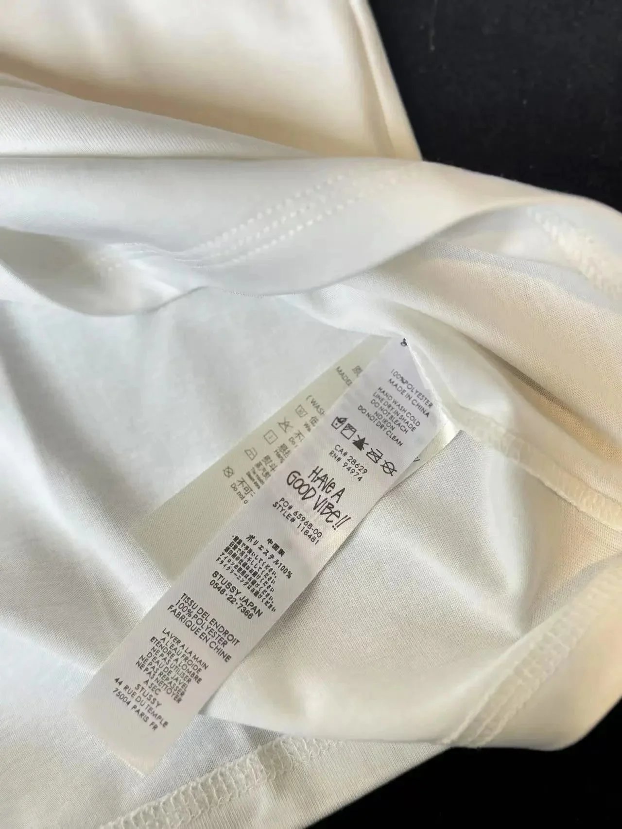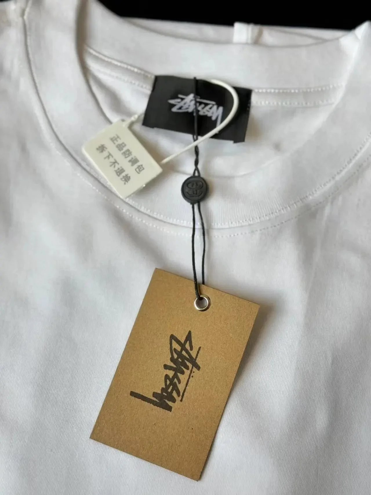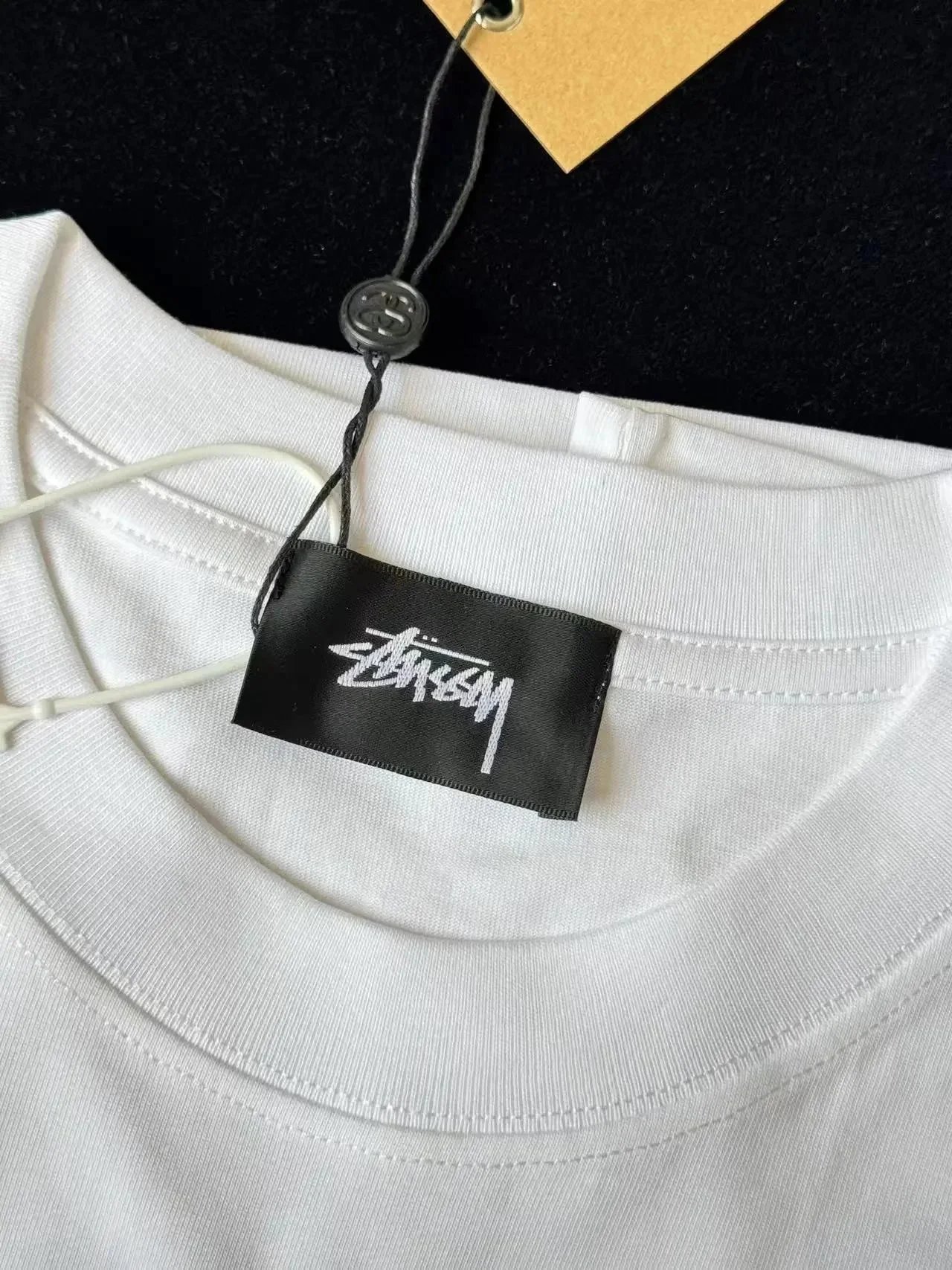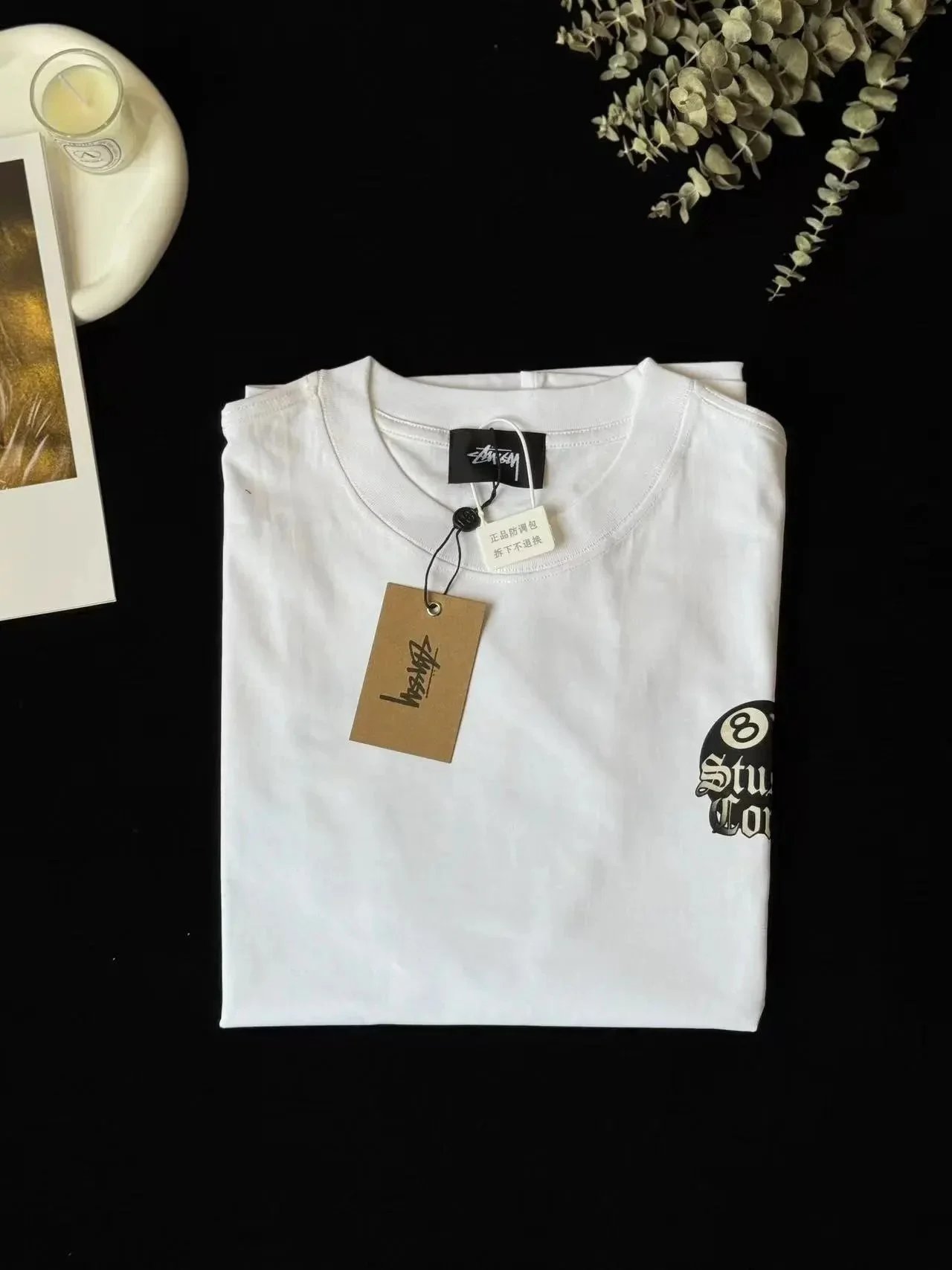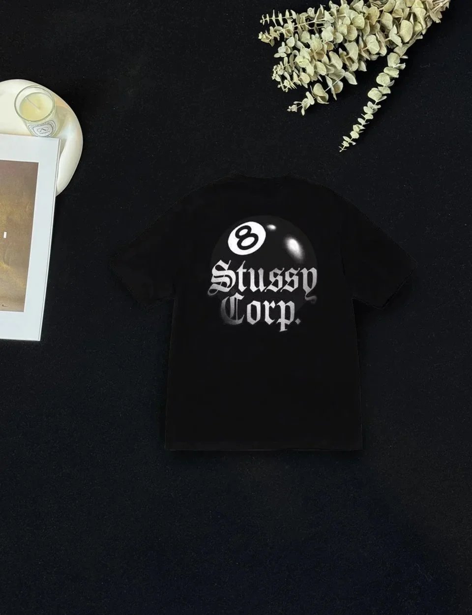 White Stussy Corp t-shirt featuring a bold black 8-ball graphic with vintage-style lettering. Ideal for streetwear enthusiasts seeking iconic branding and relaxed fit.