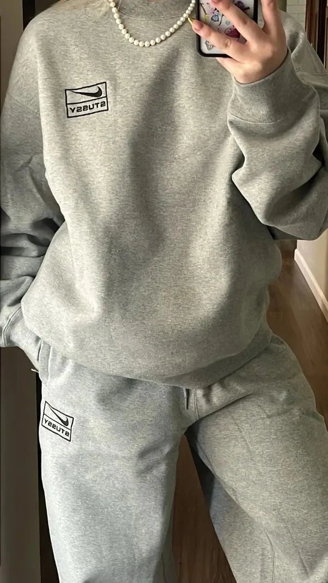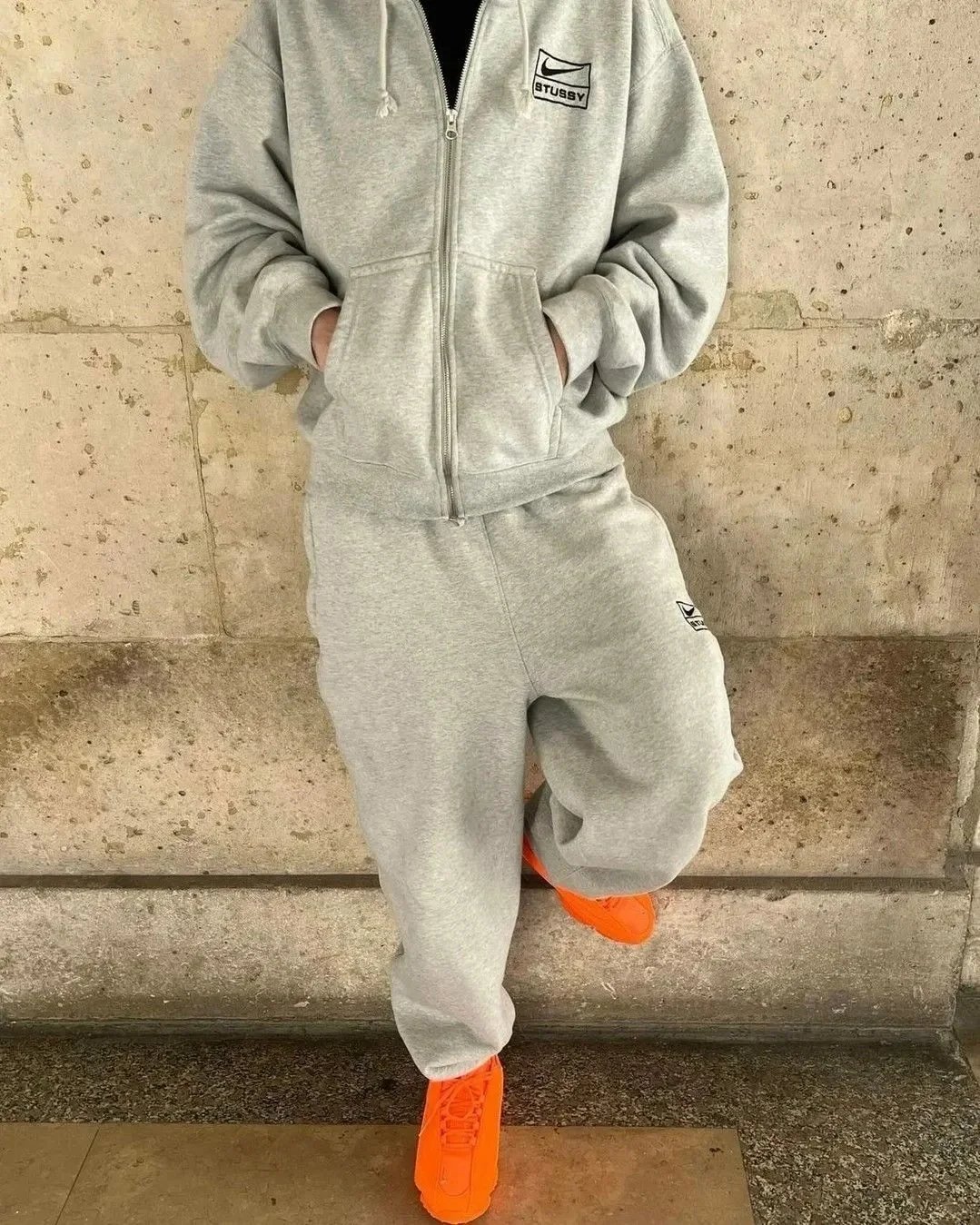 Shop the premium Stussy hoodie and jogger set in gray and black. Perfect for streetwear lovers seeking comfort and iconic branding.