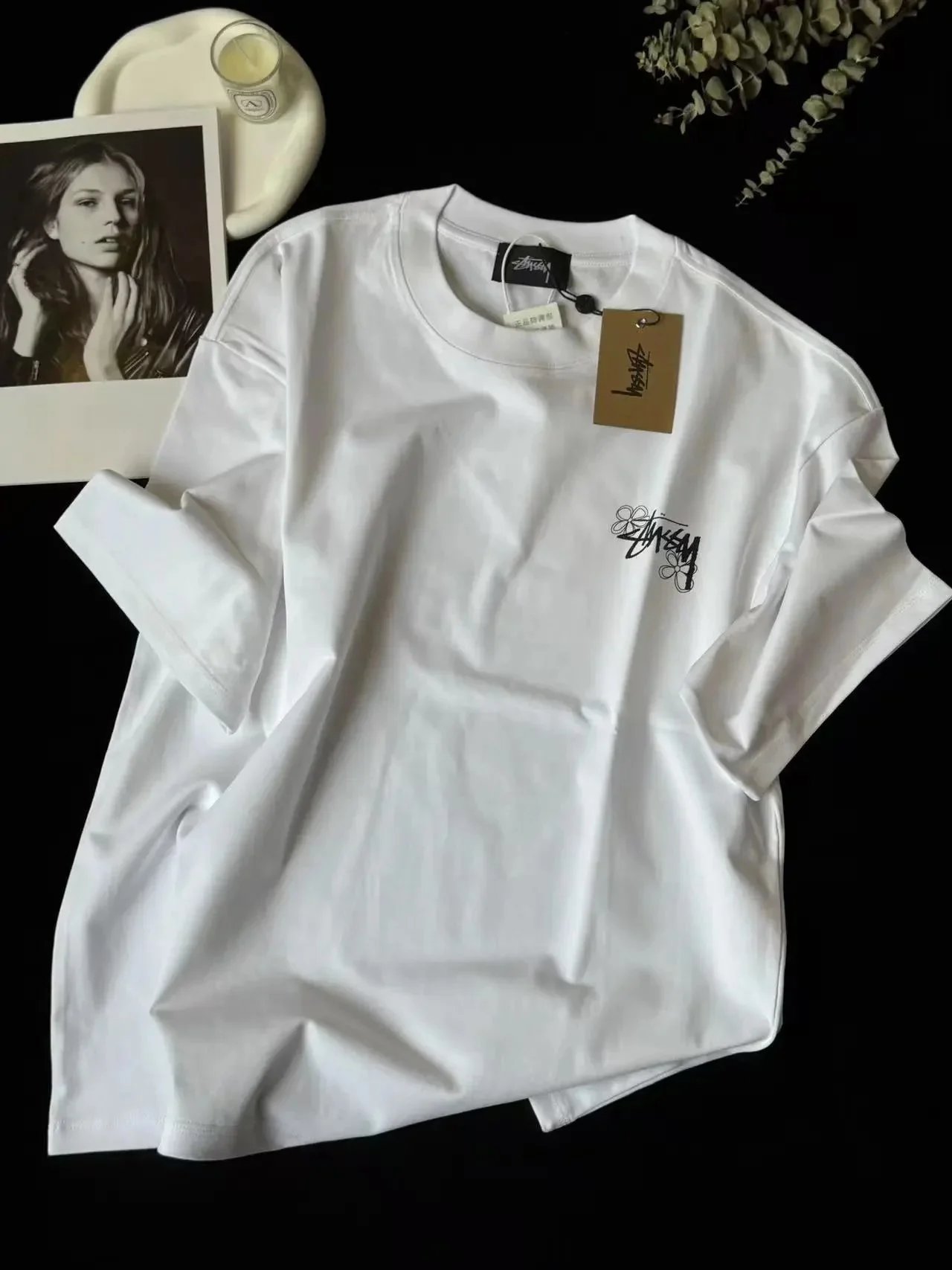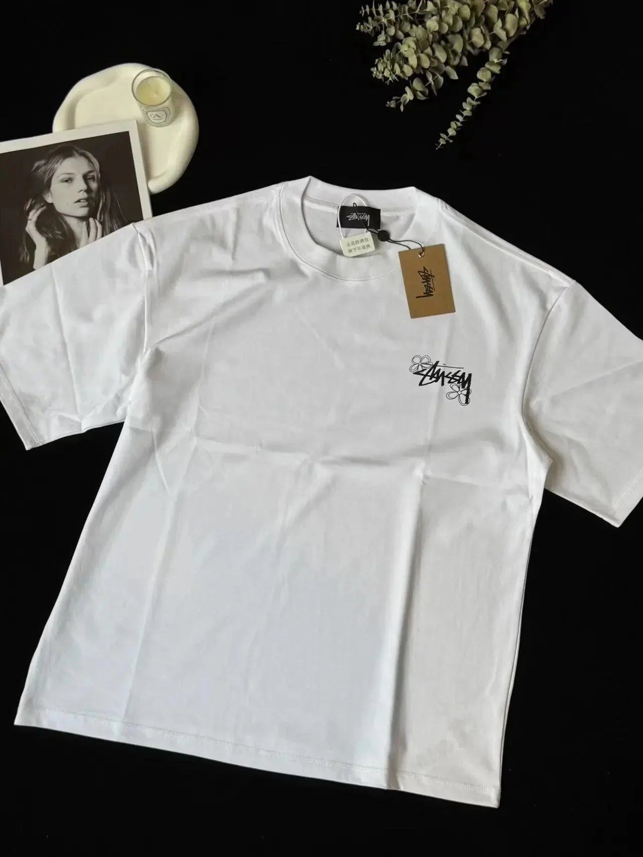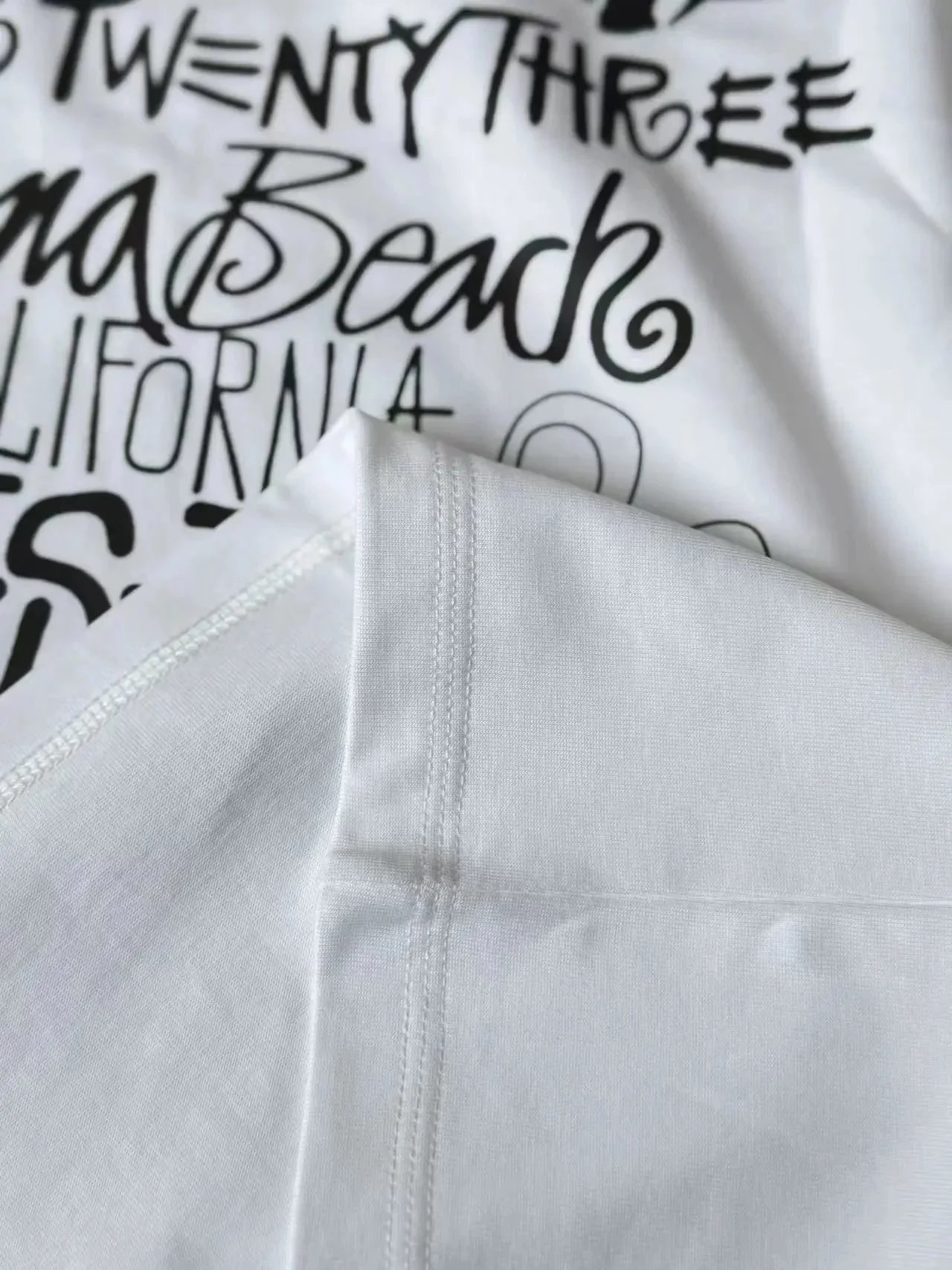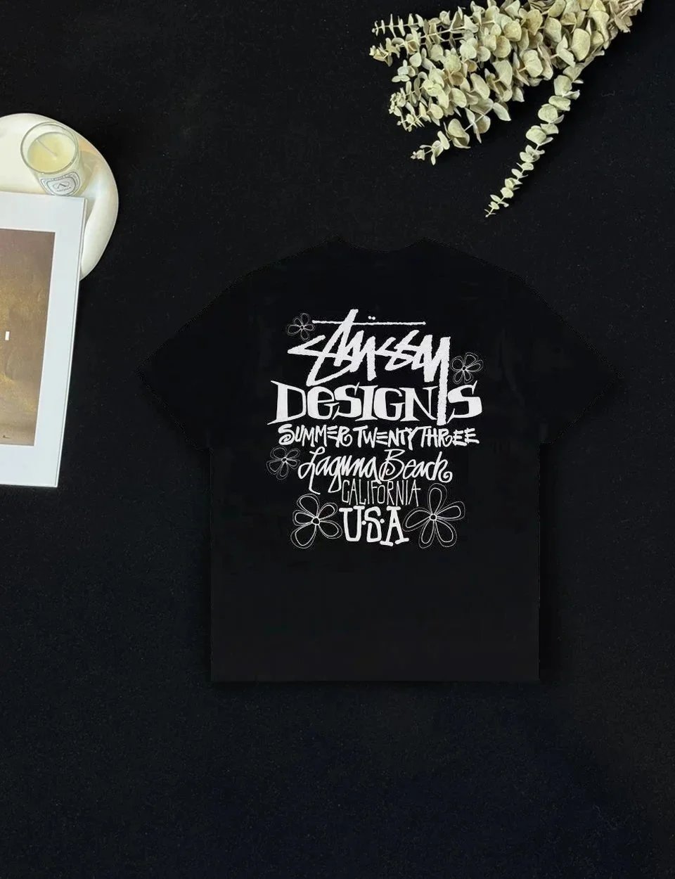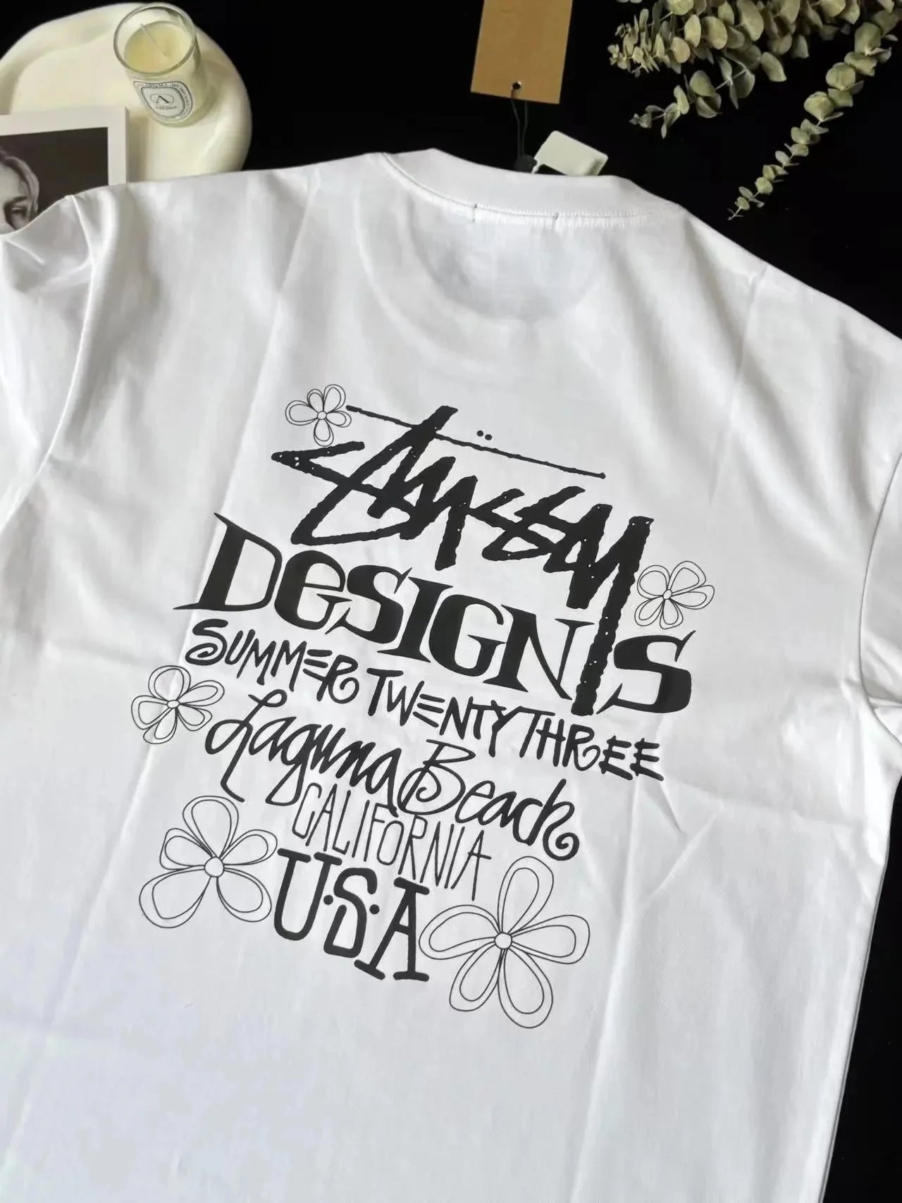 White Stussy T-shirt featuring a bold back graphic with 'Summer Twenty Three Laguna Beach California USA' text and floral accents. Ideal for casual summer looks.