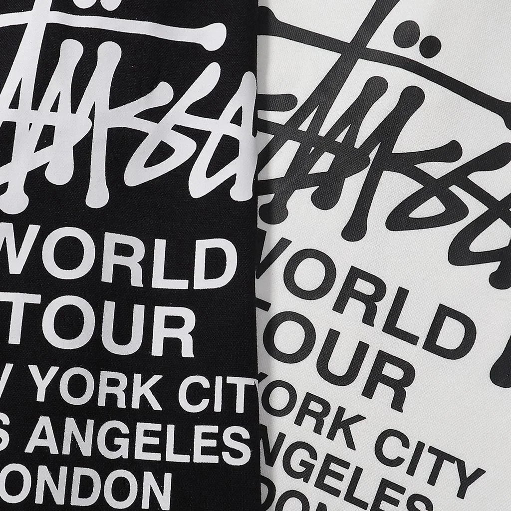 Stüssy World Tour Polo Shirts in white and black, featuring iconic lion and 8-ball graphics on the front and bold city names on the back. Designed for streetwear enthusiasts.
