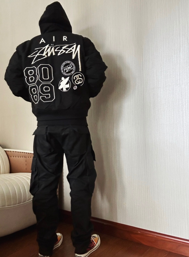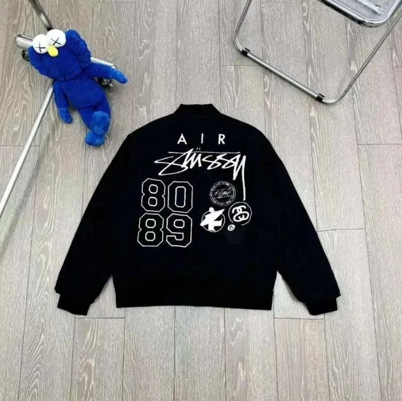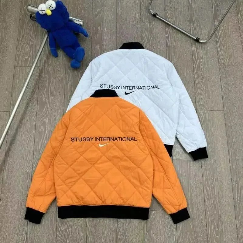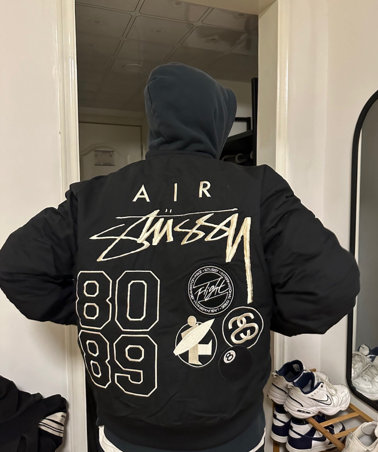 Limited edition Stussy x Nike quilted bomber jackets featuring bold back graphics. Choose from white with 'Stussy International' or black with 'Air Stussy' and 8089 patchwork design.
