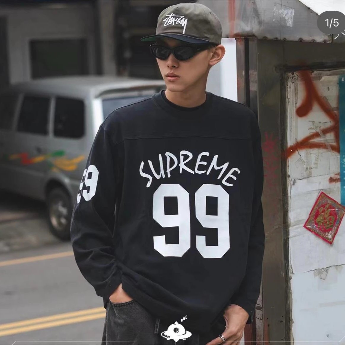 Authentic Supreme 99 jersey-style long sleeve t-shirt in white and black. Bold graphic design perfect for streetwear lovers.