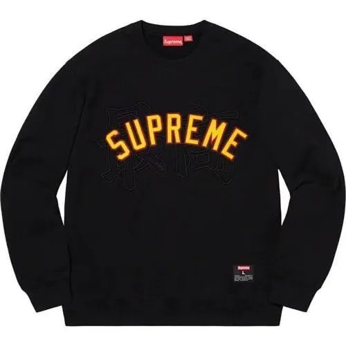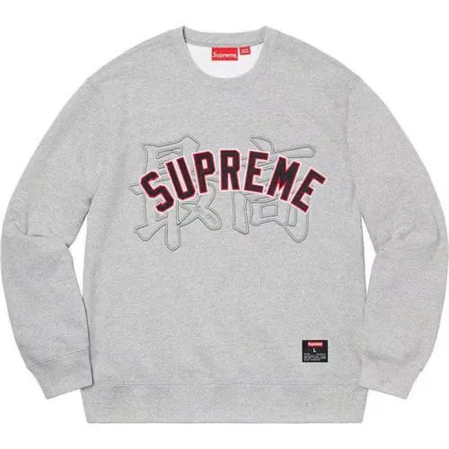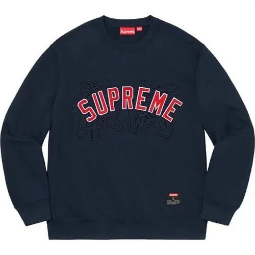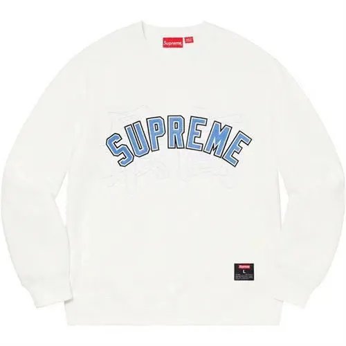 White Supreme crewneck sweatshirt featuring the iconic arched logo in blue. Perfect for streetwear enthusiasts seeking premium comfort and brand recognition.