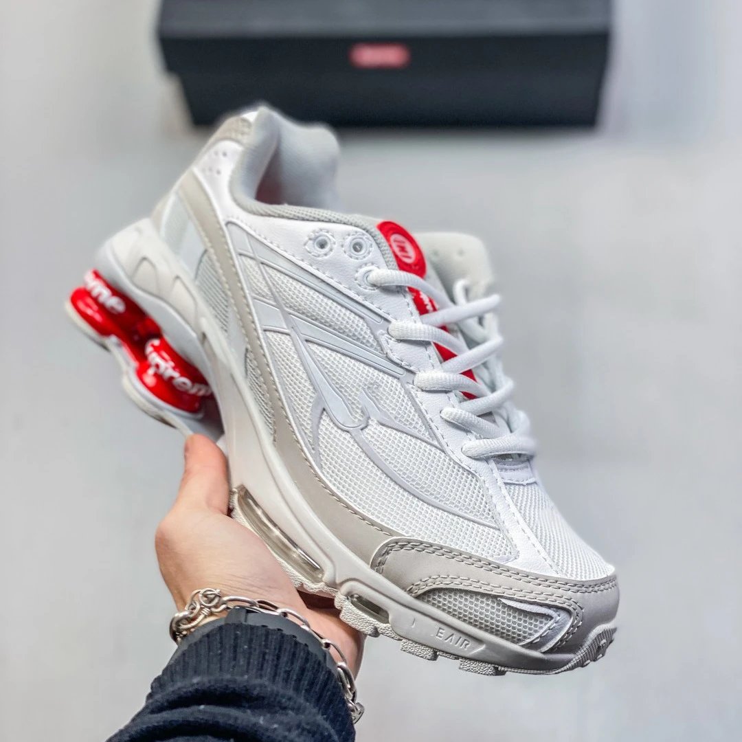 Authentic Supreme x Nike Air Max 97 in white and red colorway, featuring bold branding and classic cushioning for style and comfort.