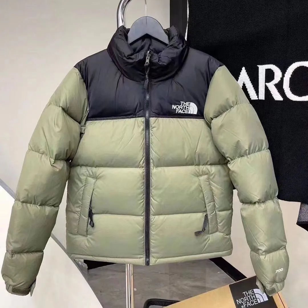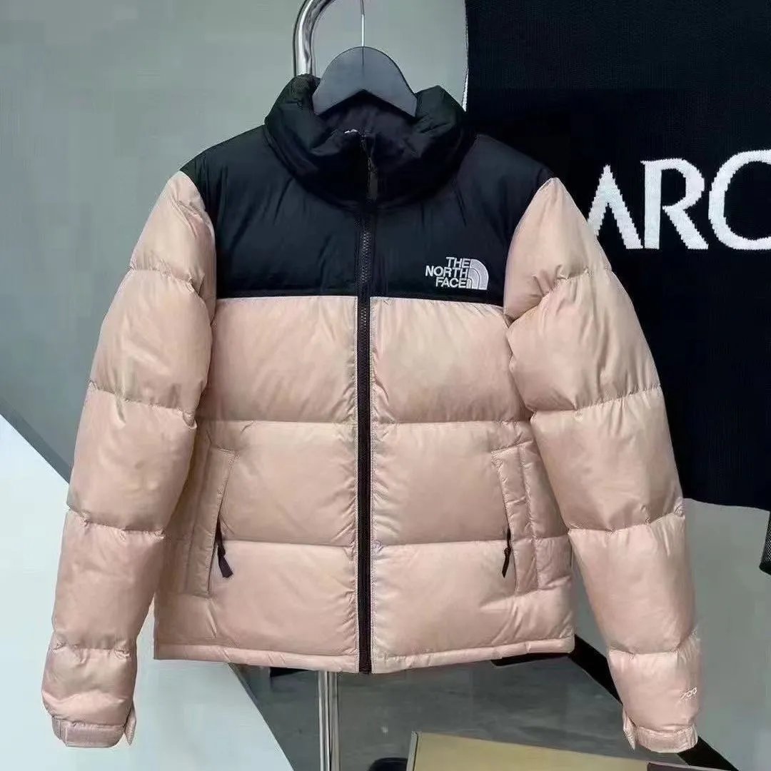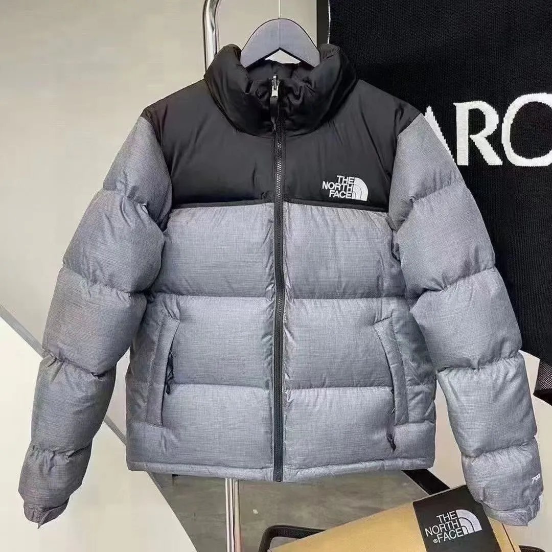Stylish The North Face hooded puffer jacket in white and black, featuring a quilted design and full-zip front for ultimate warmth and comfort during cold weather.