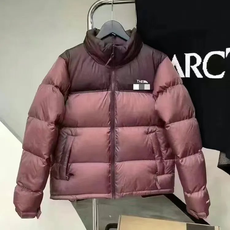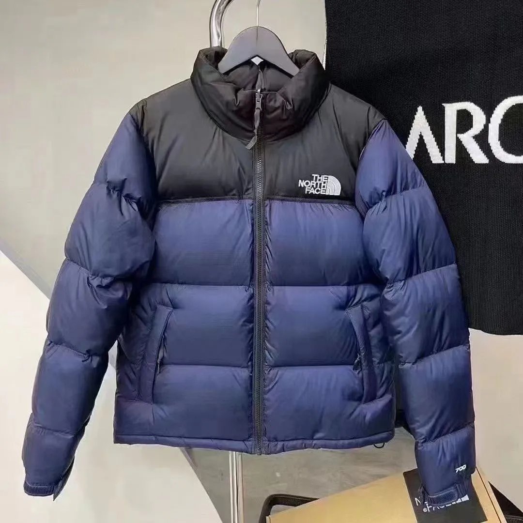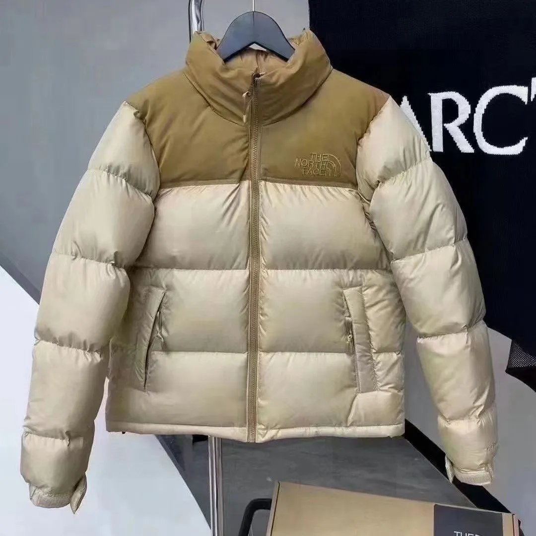 Stylish The North Face hooded puffer jacket in white and black, featuring a quilted design and full-zip front for ultimate warmth and comfort during cold weather.
