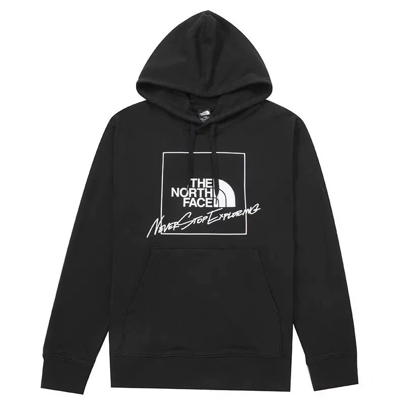 Stay cozy and stylish in this white The North Face hoodie featuring the iconic 'Never Stop Exploring' slogan. Perfect for casual wear or outdoor adventures.
