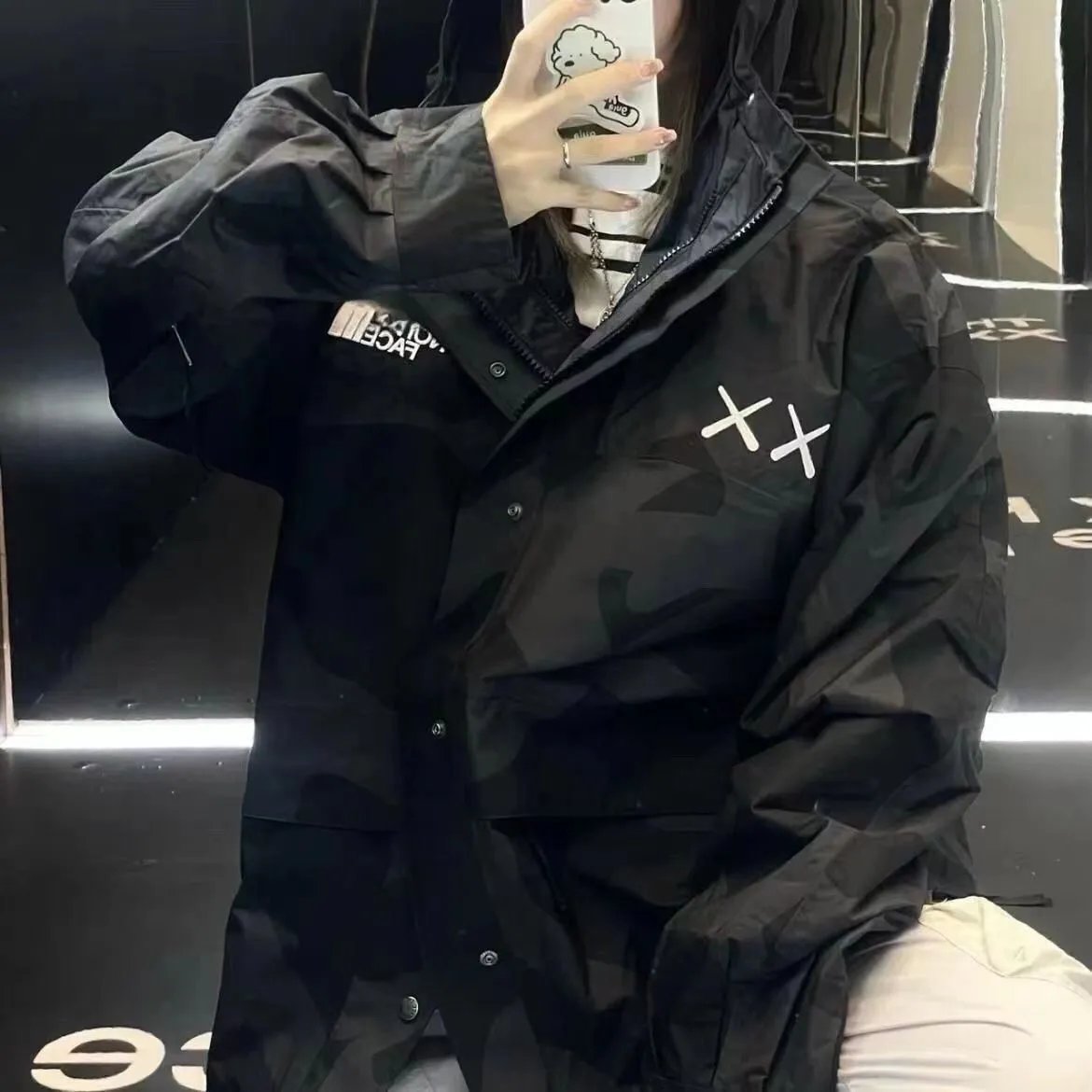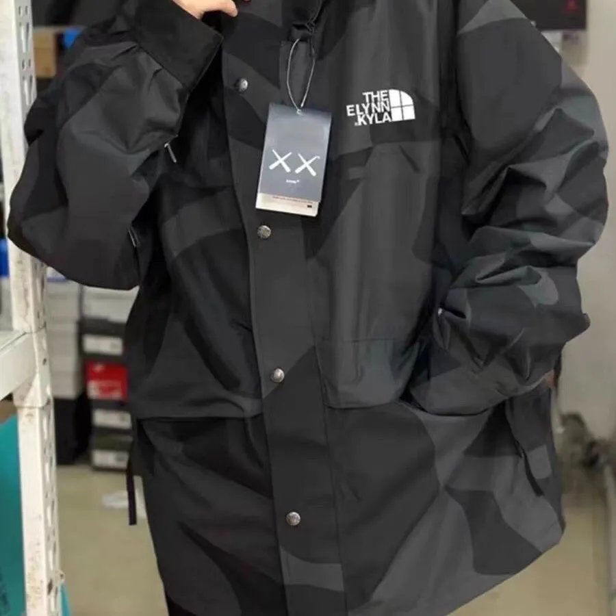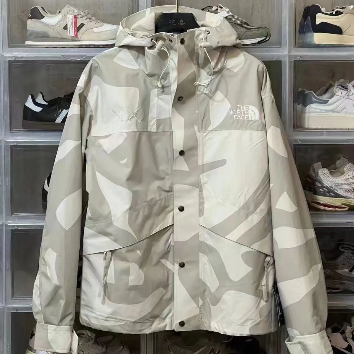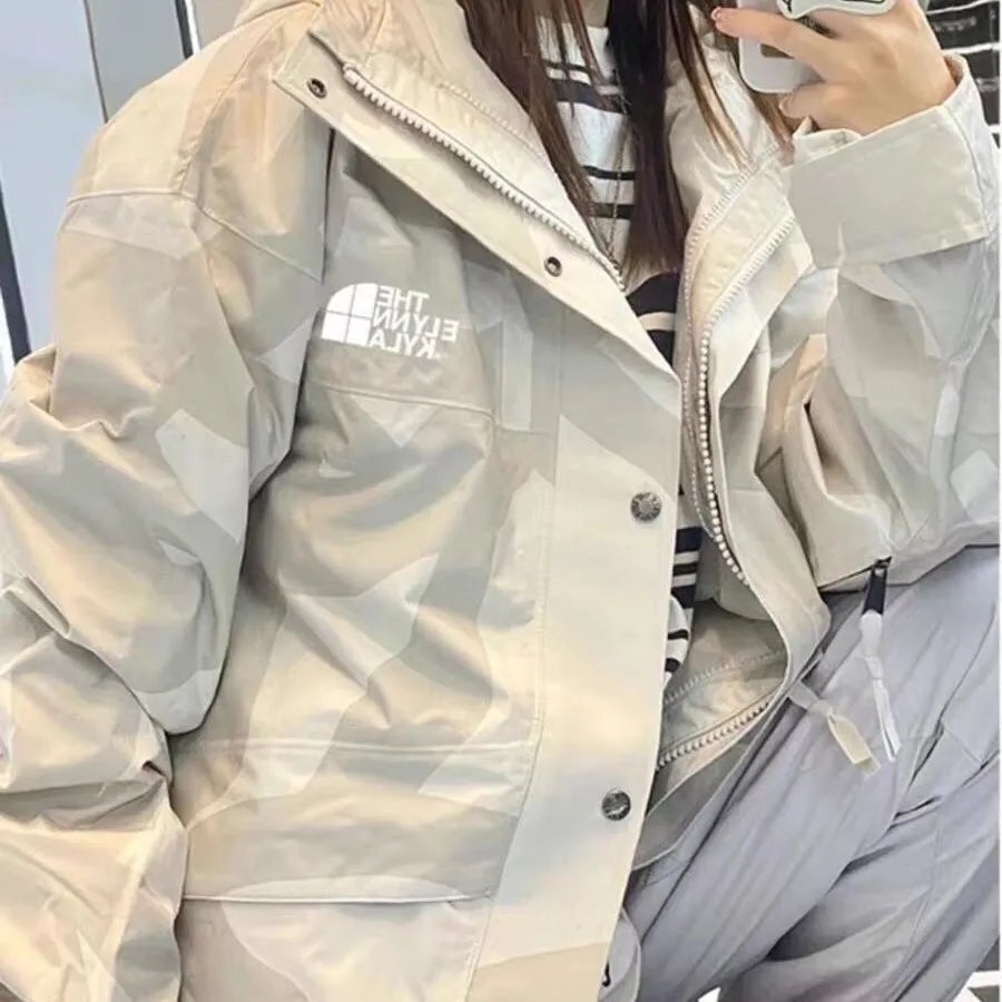 Stylish The North Face XX collaboration hooded jackets featuring bold camo patterns in beige and black. Perfect for urban exploration and outdoor adventures.