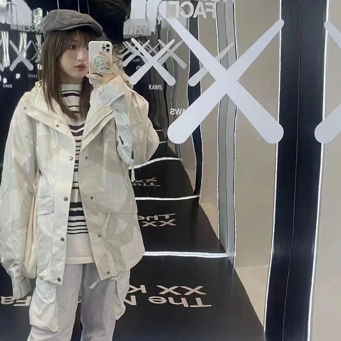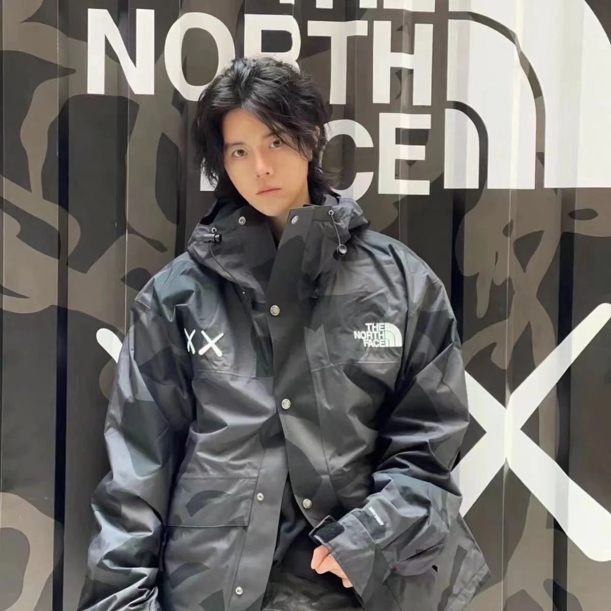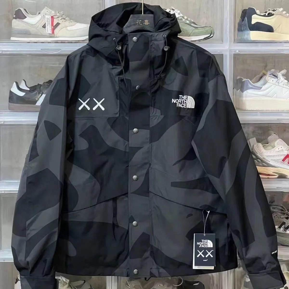 Stylish The North Face XX collaboration hooded jackets featuring bold camo patterns in beige and black. Perfect for urban exploration and outdoor adventures.