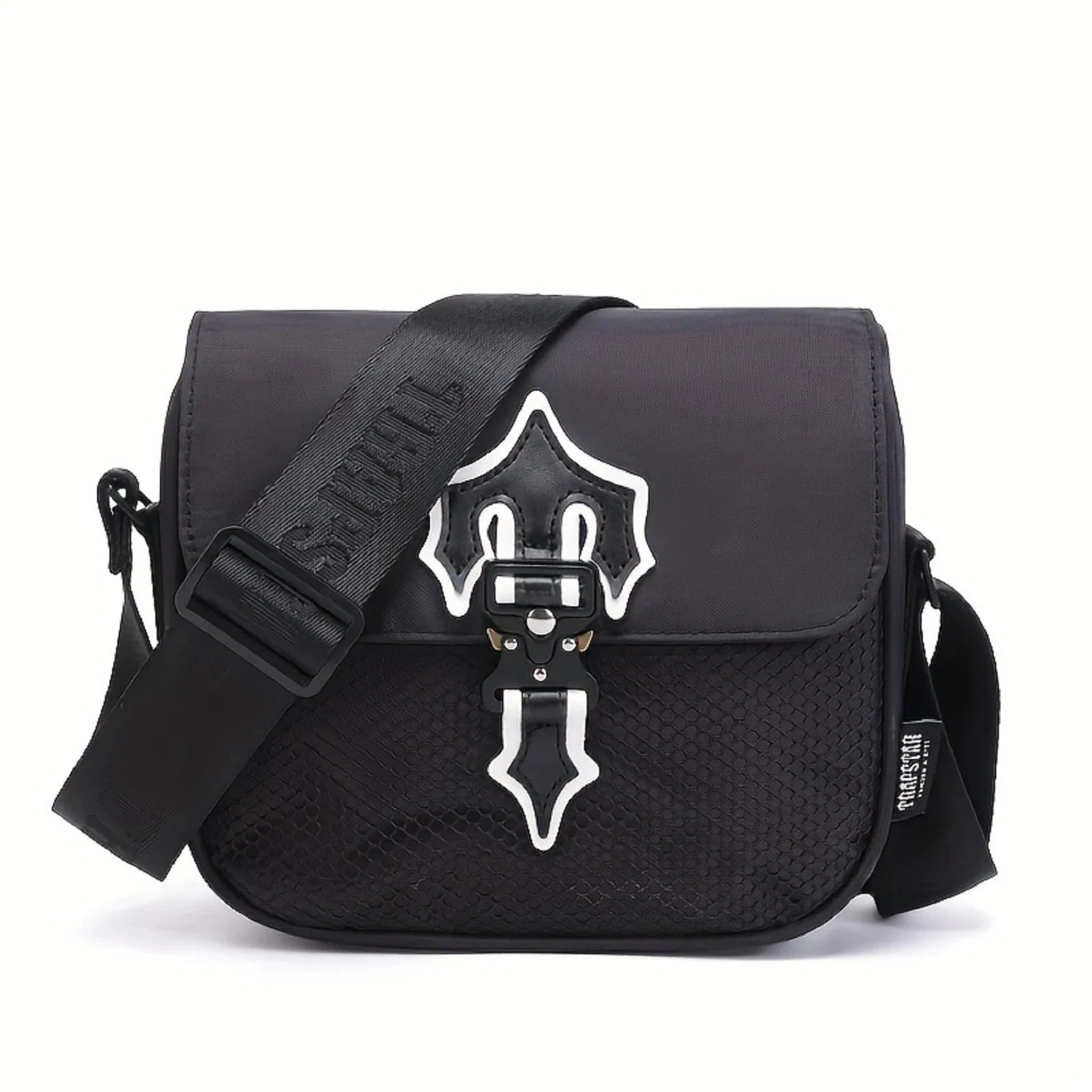 Stylish black THORSTAR crossbody bag featuring a bold gothic-inspired metal buckle and durable construction. Perfect for urban fashion lovers seeking edgy, functional accessories.