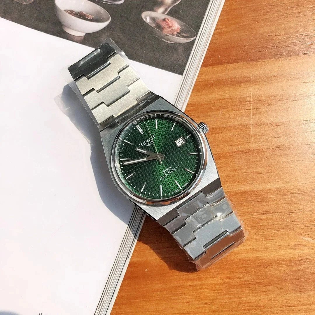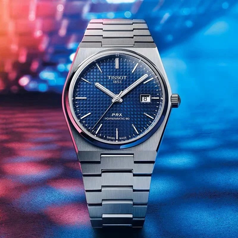 Elegant Tissot PRX automatic watch featuring a sleek black textured dial, stainless steel bracelet, and Swiss precision engineering. Perfect for modern professionals seeking timeless style and reliability.