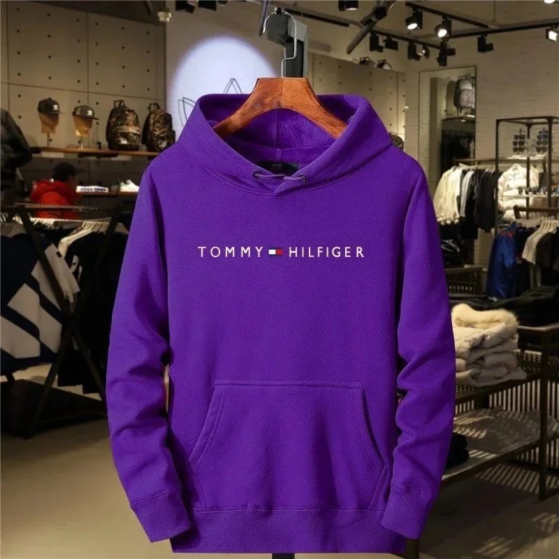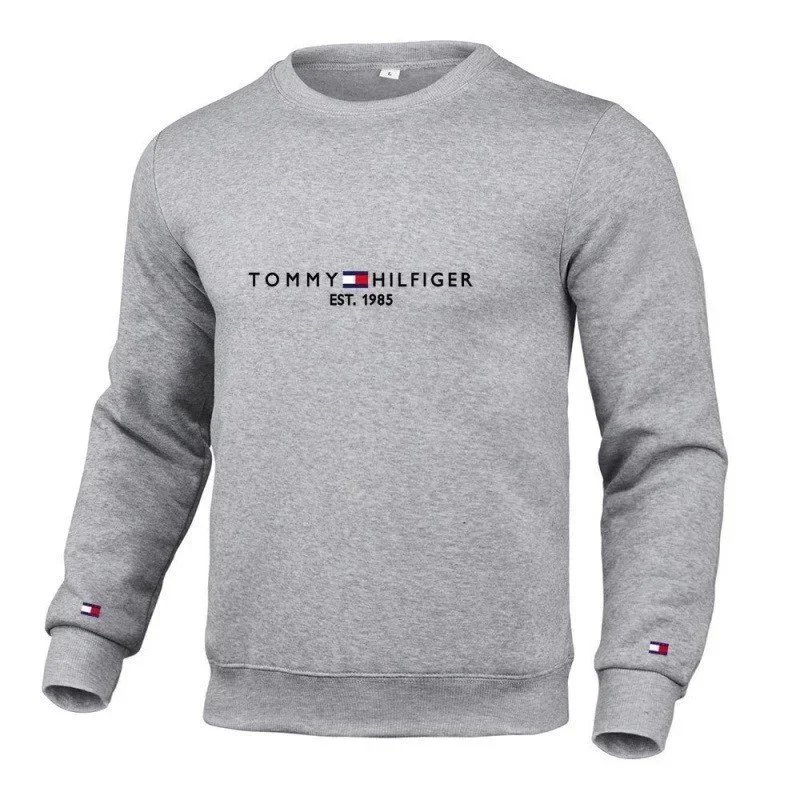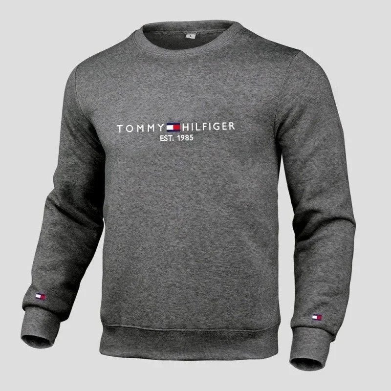 Dark gray Tommy Hilfiger hooded sweatshirt featuring the iconic logo across the chest. Designed for comfortable everyday wear in a modern retail setting.