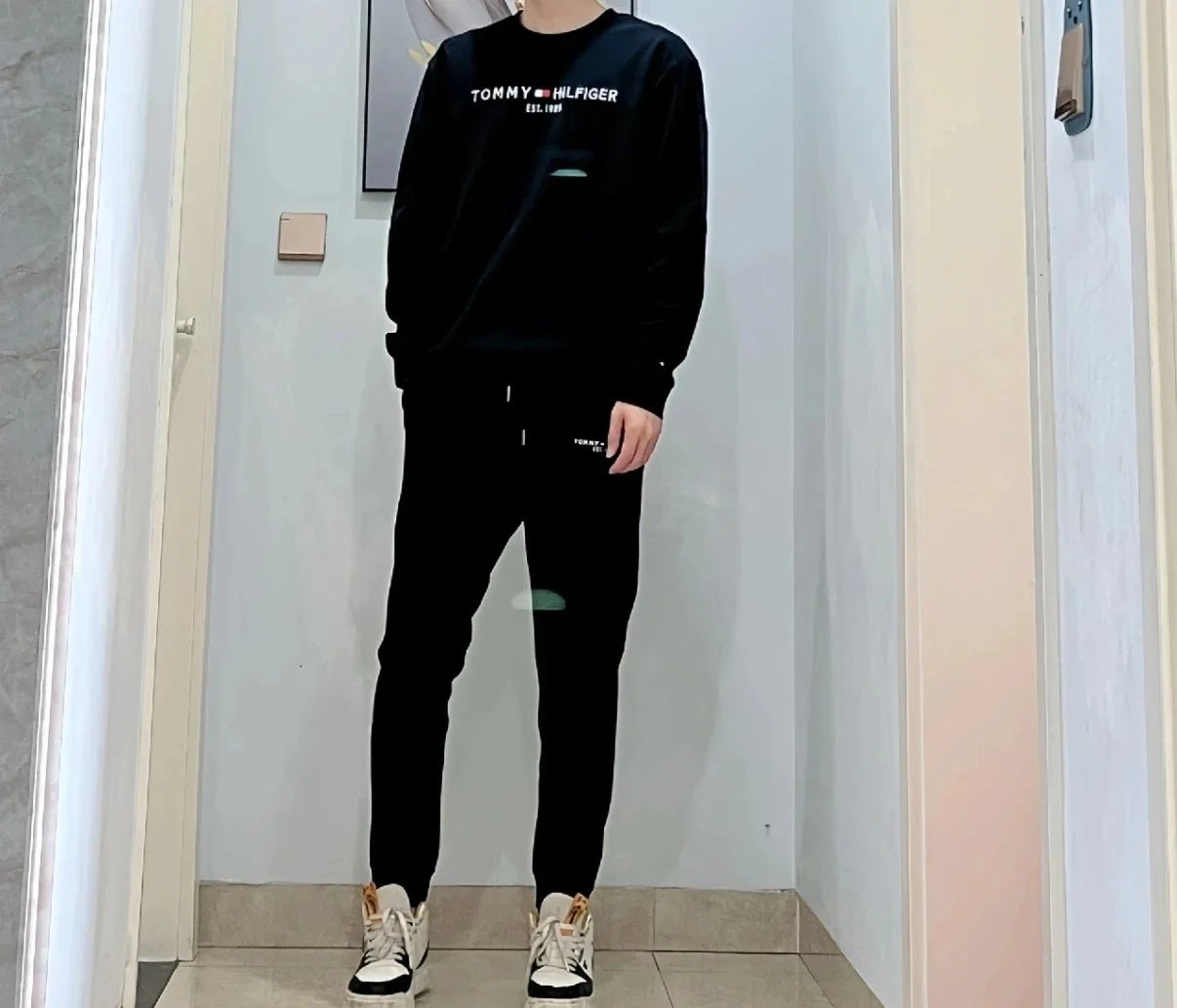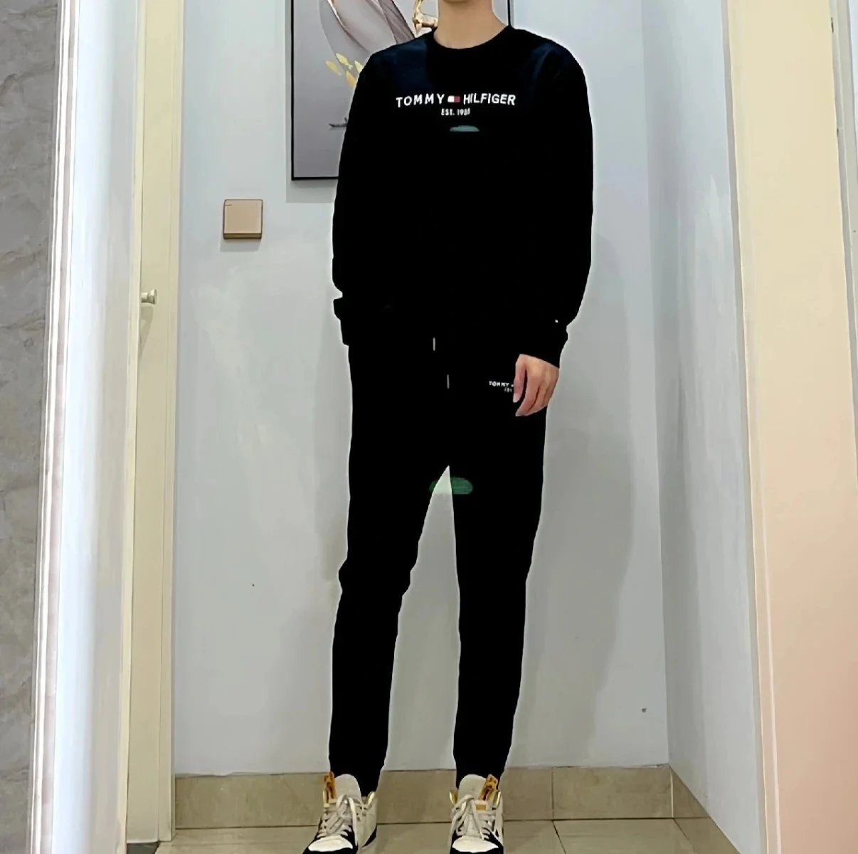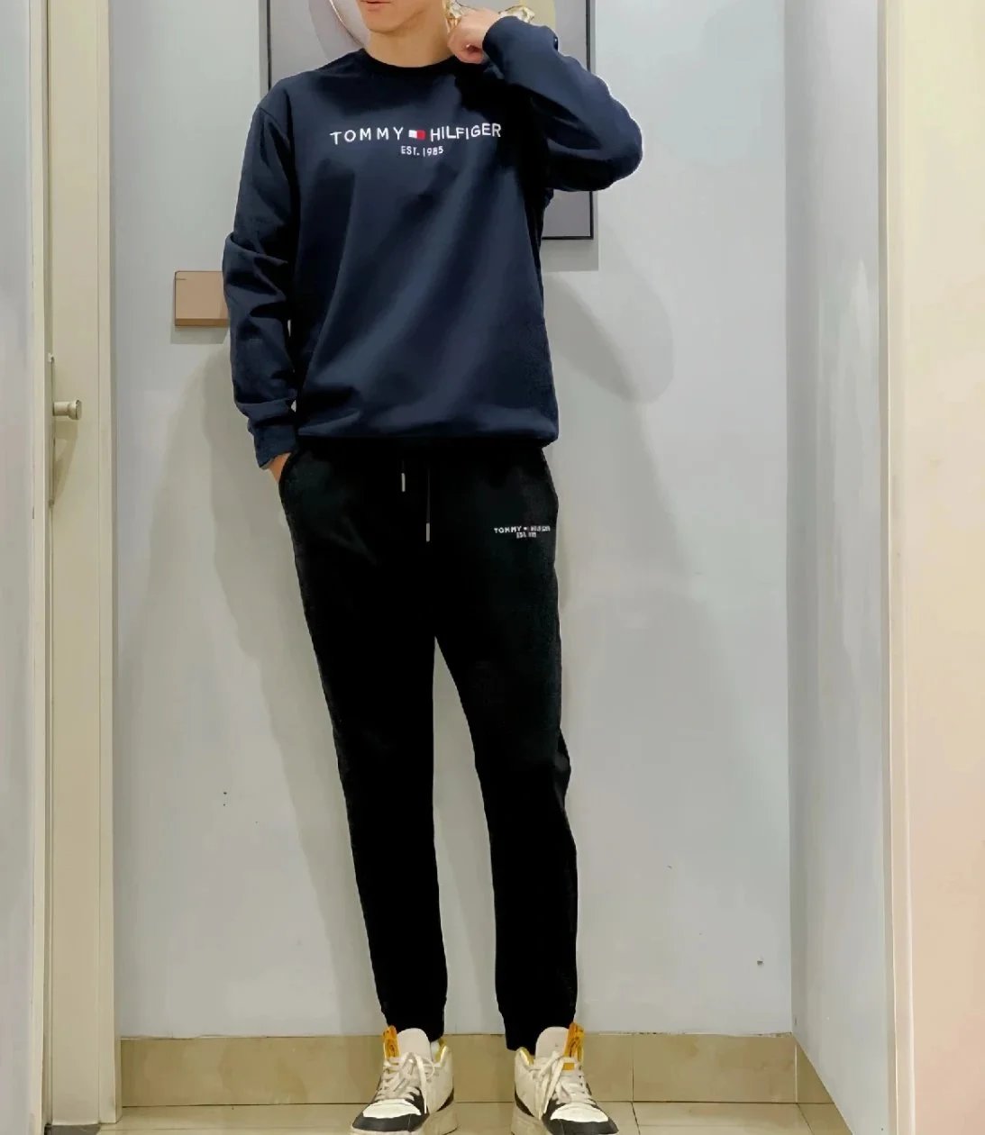 Authentic Tommy Hilfiger branded matching sets featuring classic logo prints on crewneck and hooded sweatshirts paired with elastic-waist joggers in multiple colorways for comfortable everyday wear.
