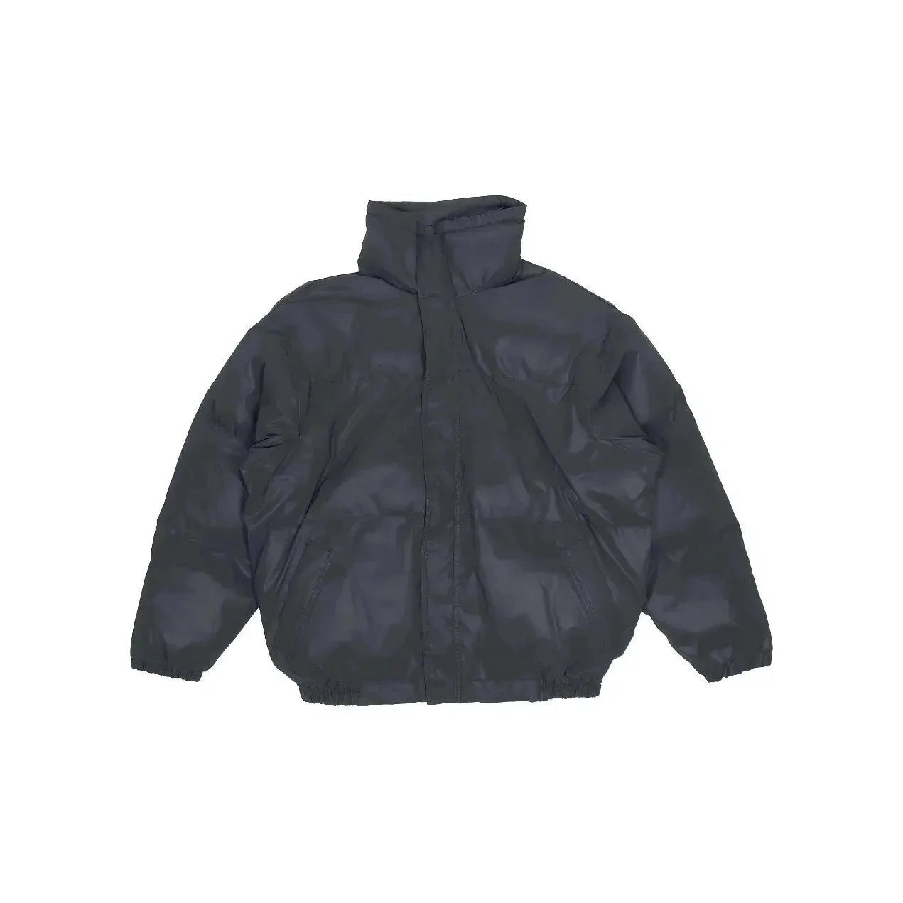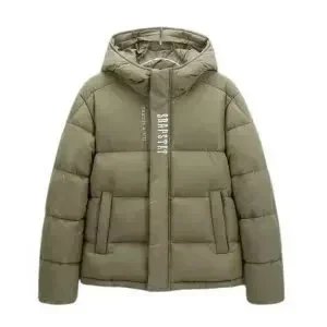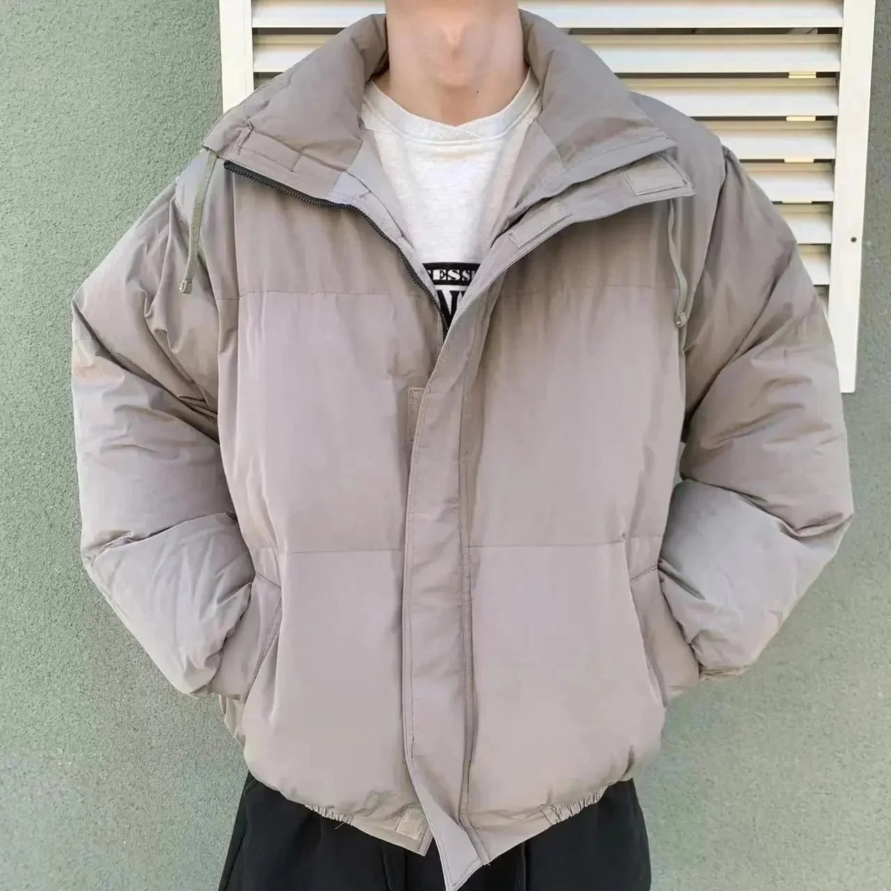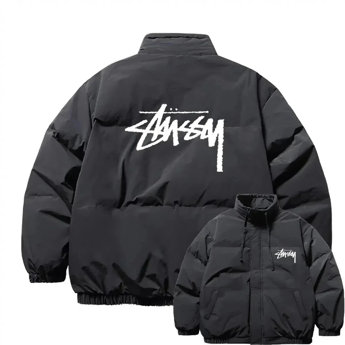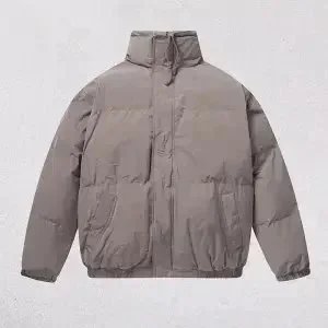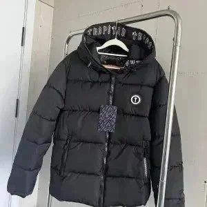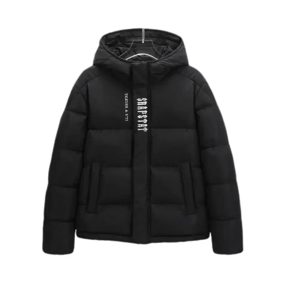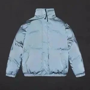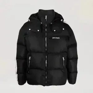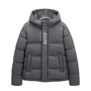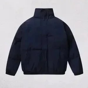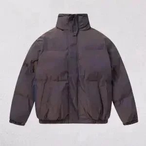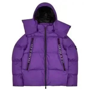 Stylish Topo puffer jacket set featuring bold 'That's a Awful Lot of Cough Syrup' print. Perfect for urban fashion lovers seeking statement outerwear in black and purple.