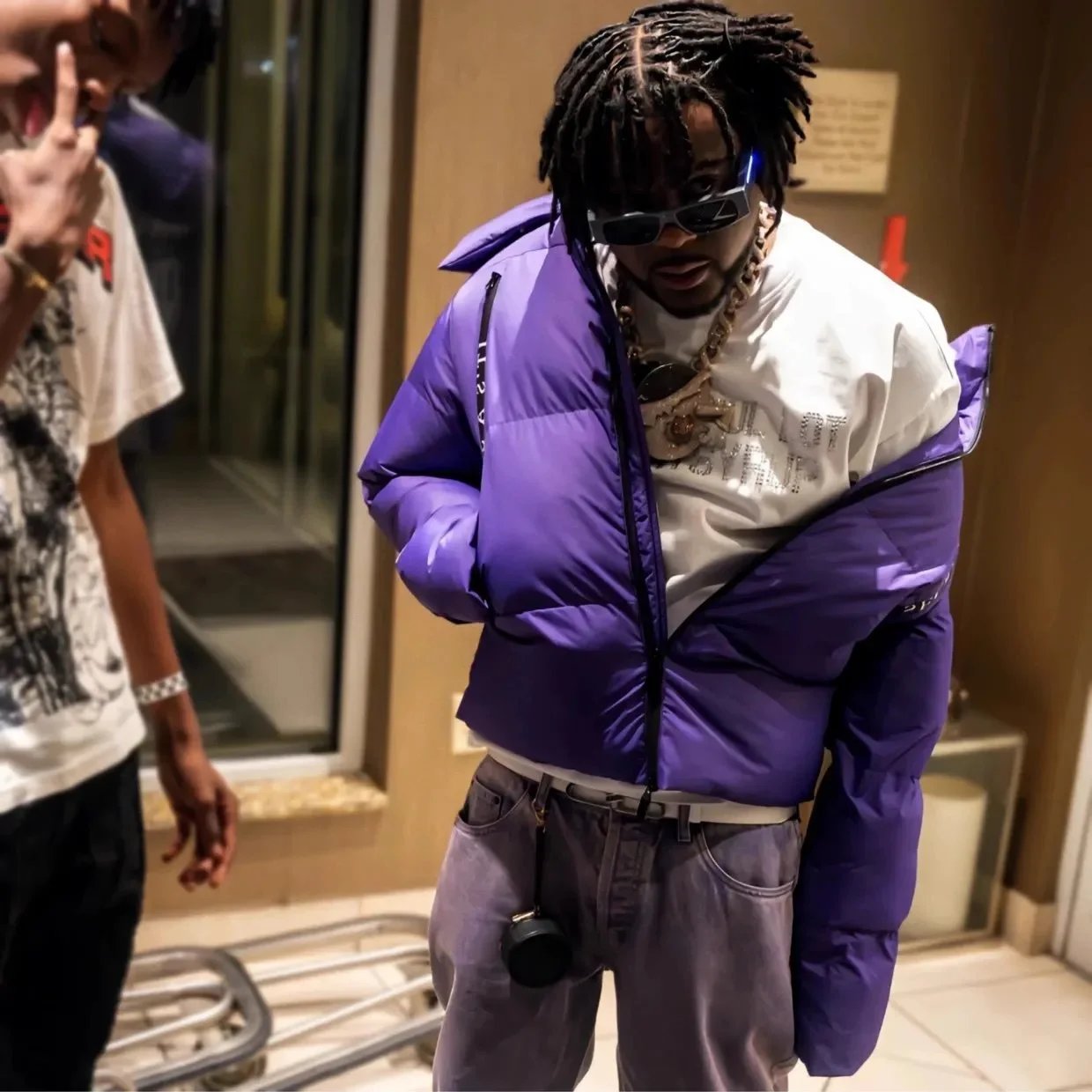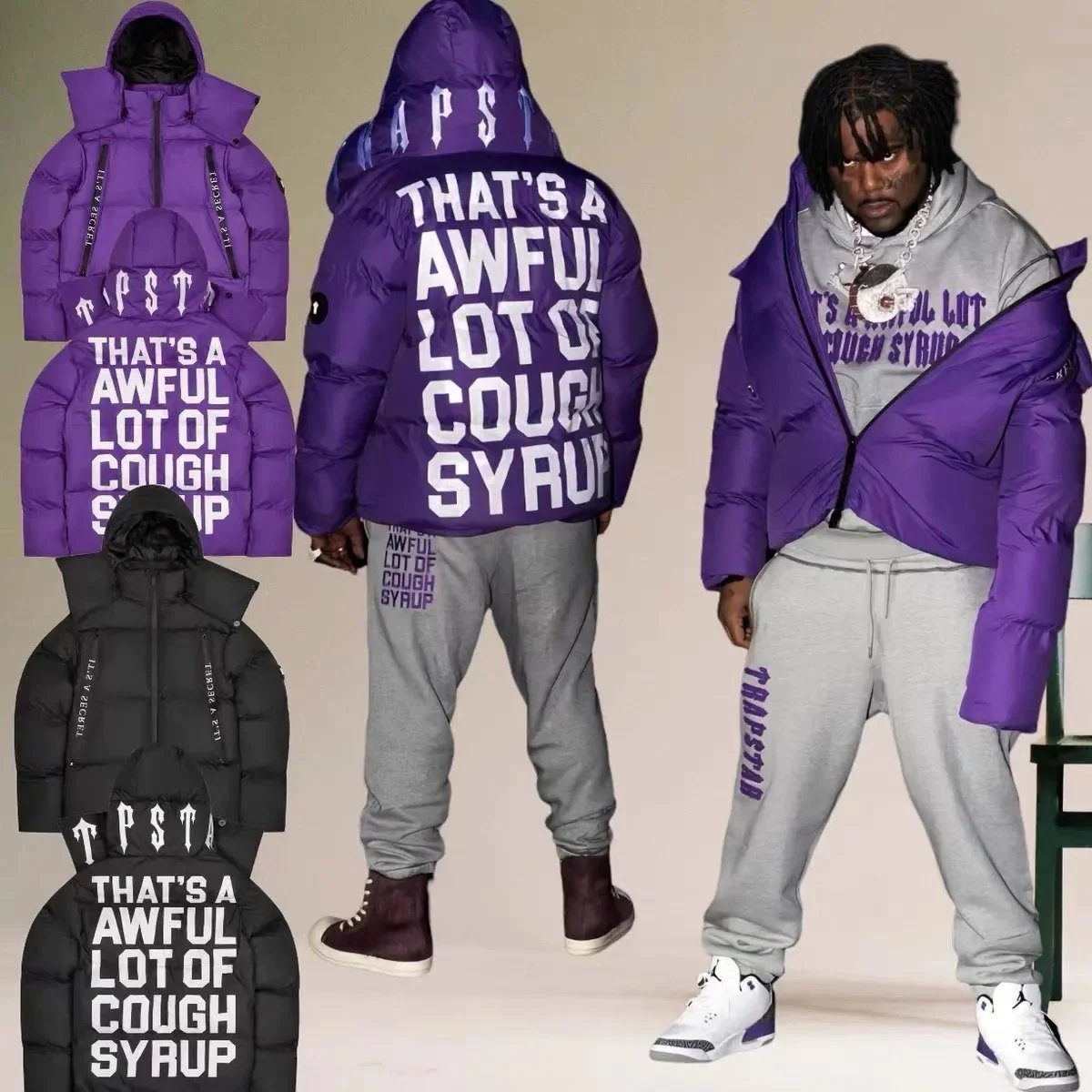 Stylish Topo 'That's Awful Lot of Cough Syrup' puffer hoodie set in black and purple. Perfect for matching outfits with bold city-inspired design.
