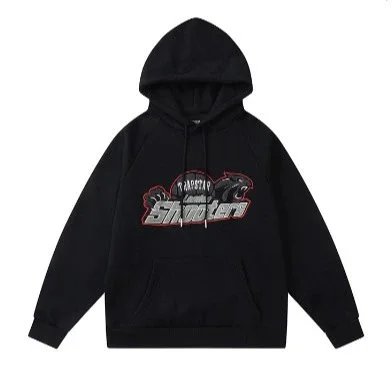 Stylish black hooded puffer jacket by Trapstar featuring bold back embroidery and a front logo patch. Perfect for urban winter wear with premium insulation and modern design.