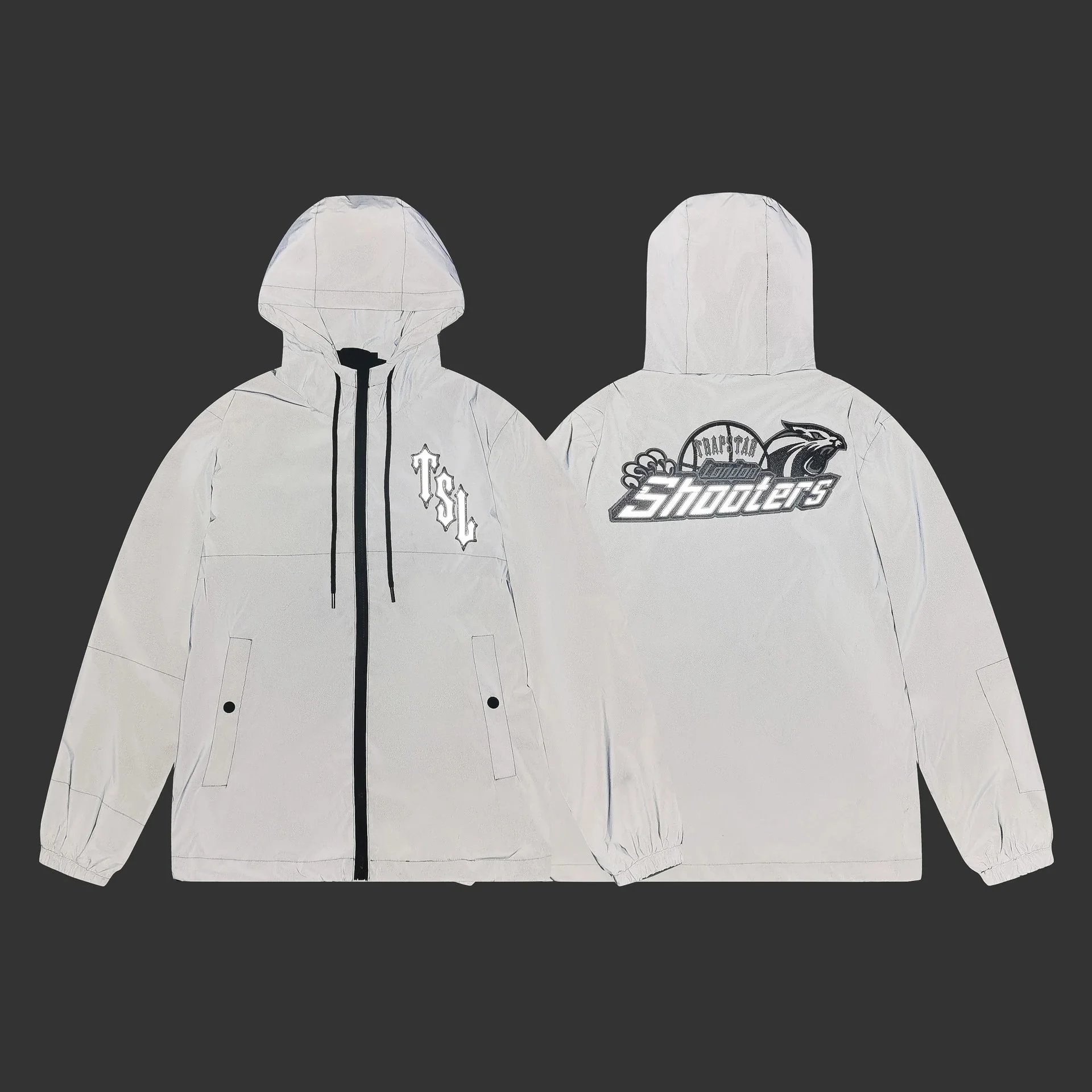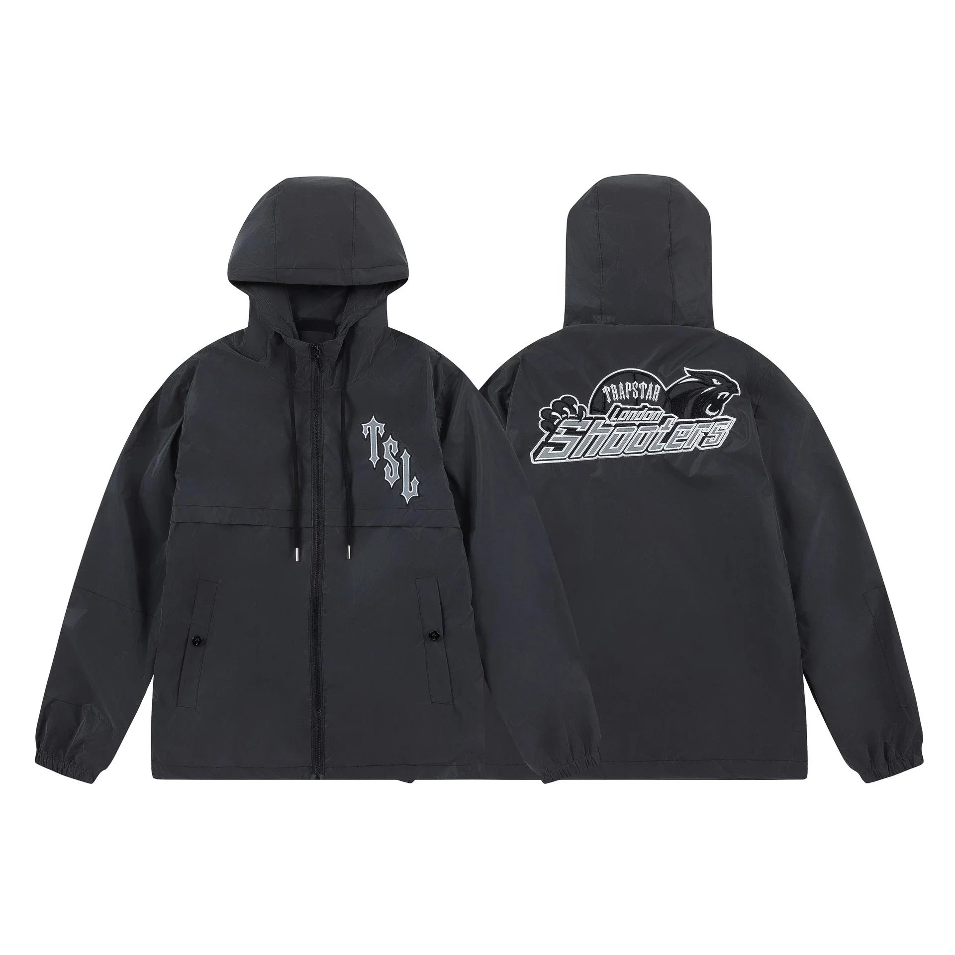 Stylish black Trapstar London Shooters hooded jacket featuring bold logo graphics on the back and front. Perfect for urban streetwear enthusiasts.