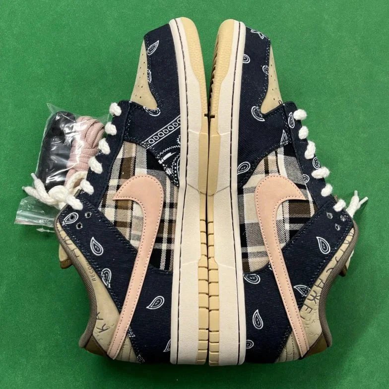 High-end Travis Scott x Nike Dunk Low sneakers featuring a bold navy bandana and plaid overlay with cream midsole. Designed for collectors and streetwear enthusiasts.